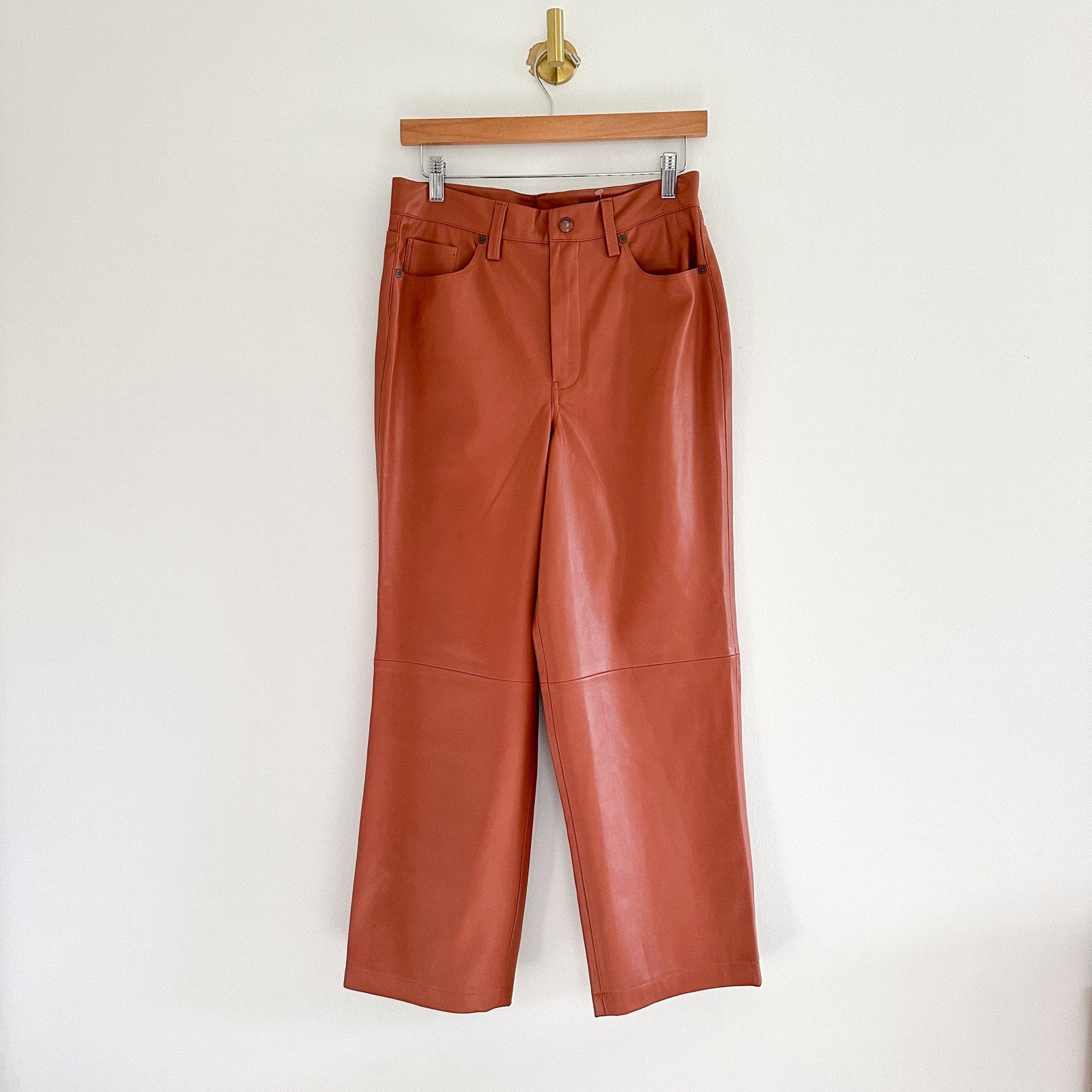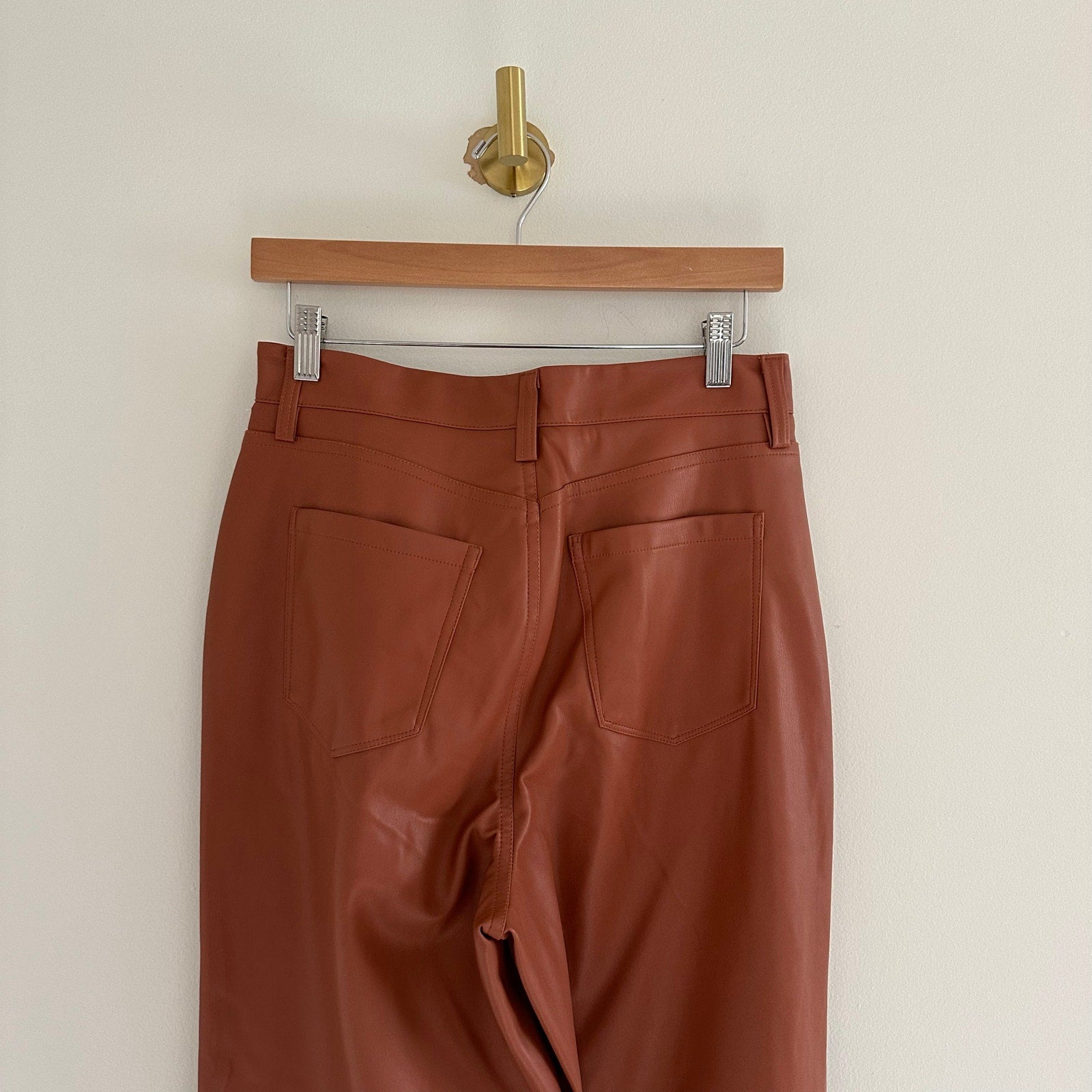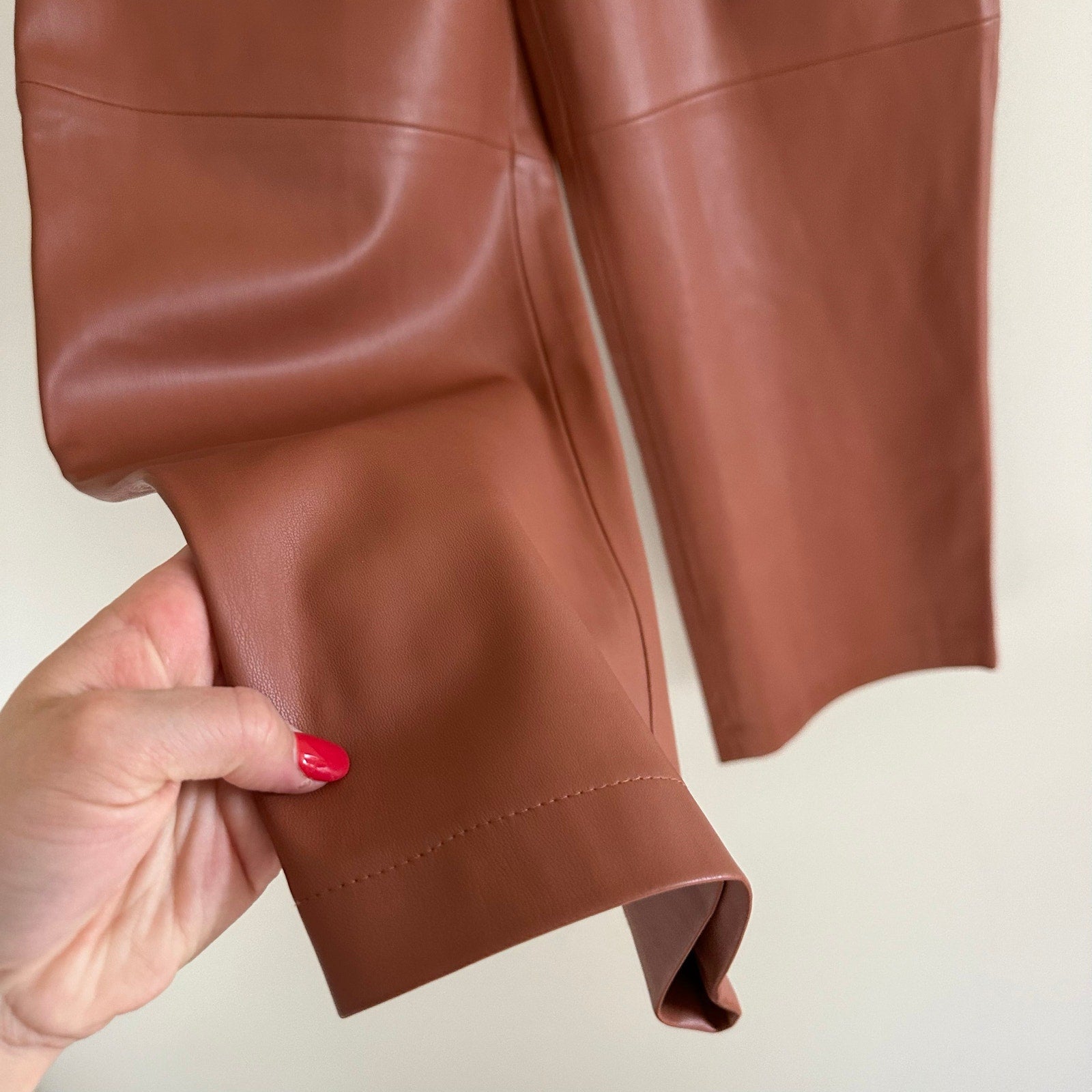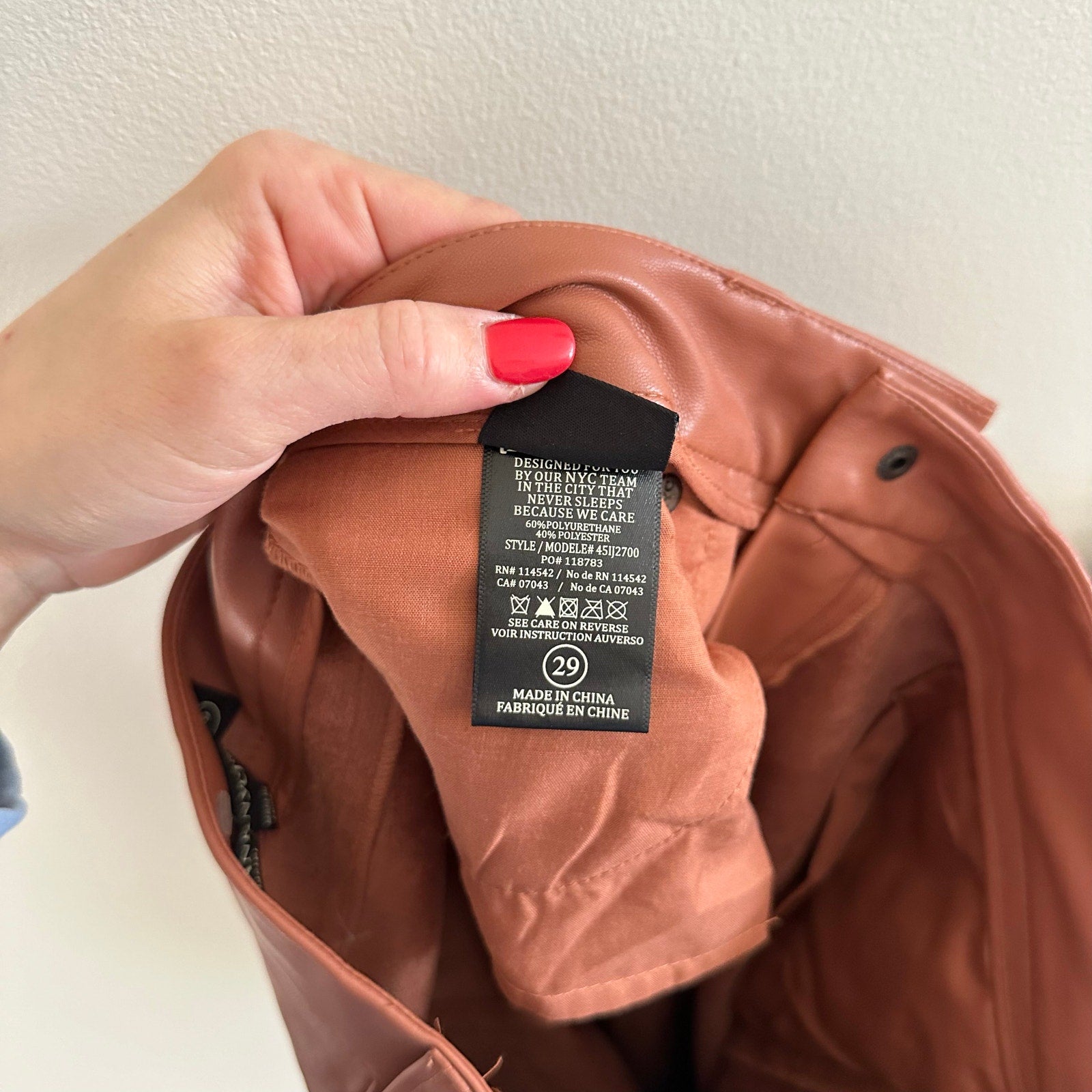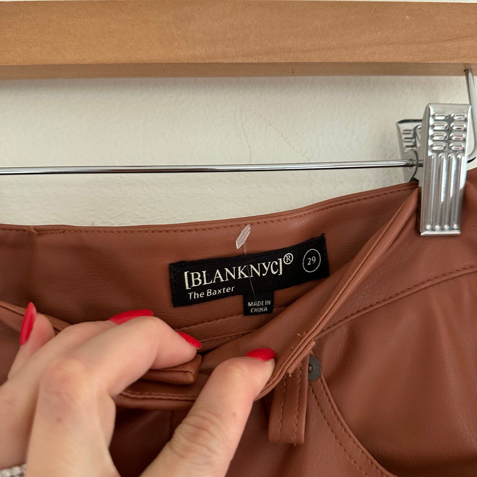 Details: Blank NYC The Baxter Ribcage Straight Leg Faux Leather Cropped Pants - Size: 29- Color: Brown- Material: 60% Polyurethane, 40% Polyester- Features: Straight leg, faux leather, cropped, high rise waist, belt loops,z zipper fly with snap waist, 5-pocket styling.