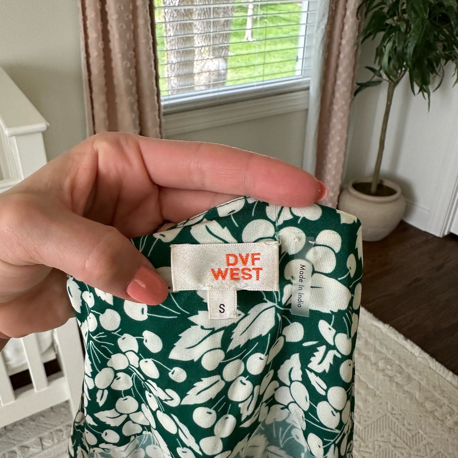 Details: DVF West Leafy Print Long Sleeve Mini Wrap Dress - Size: S - Color: Green- Material: Silk - Features: Leafy print, long sleeve, raglan sleeve, mini length, wrap style, lightweight, tie closure, comfort, breathable, casual.