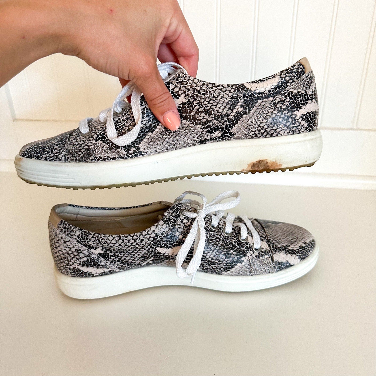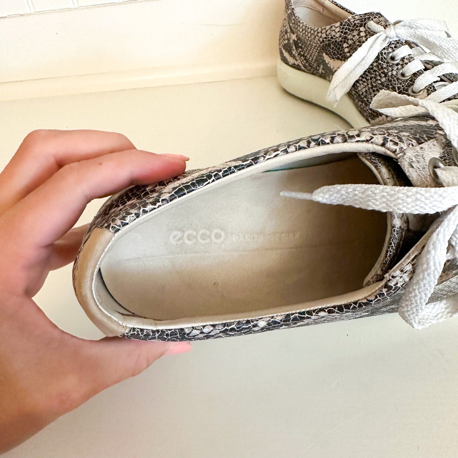 Details: Ecco Soft 7 Nubuck Leather Snake Embellished Sneakers - Size: 9-9.5- Color: Limestone - Material: Leather- Features: Embracing ECCO's core values, the WOMEN'S SOFT 7 SNEAKER is a celebration of Scandinavian design values with an understated contemporary twist.