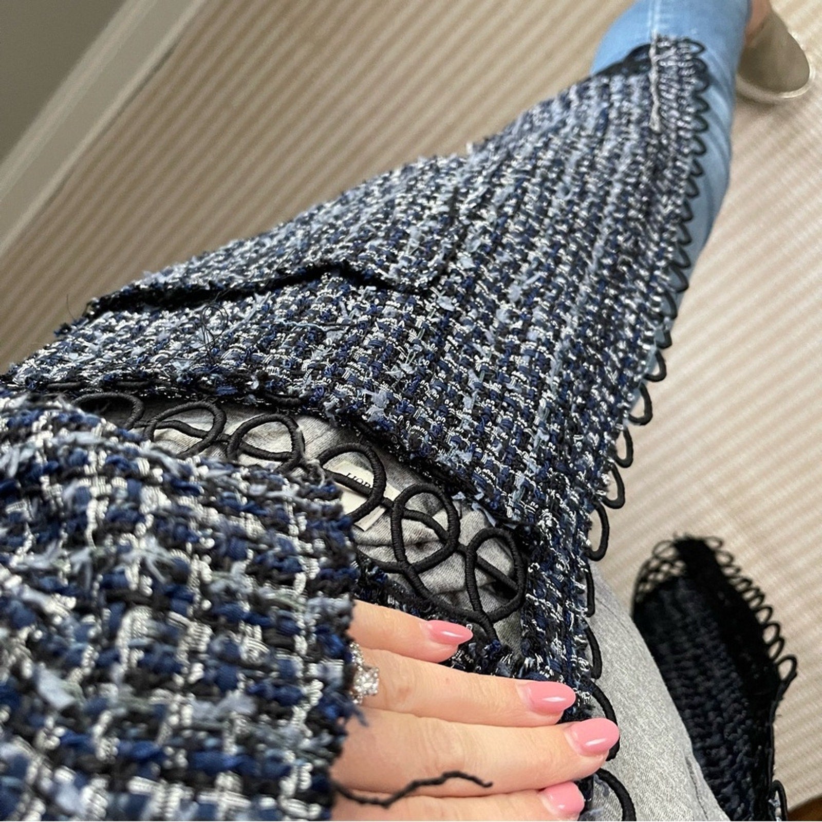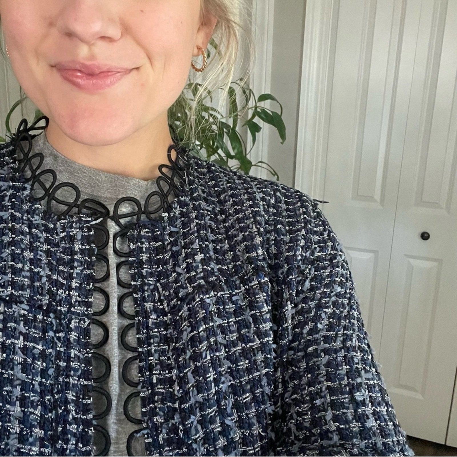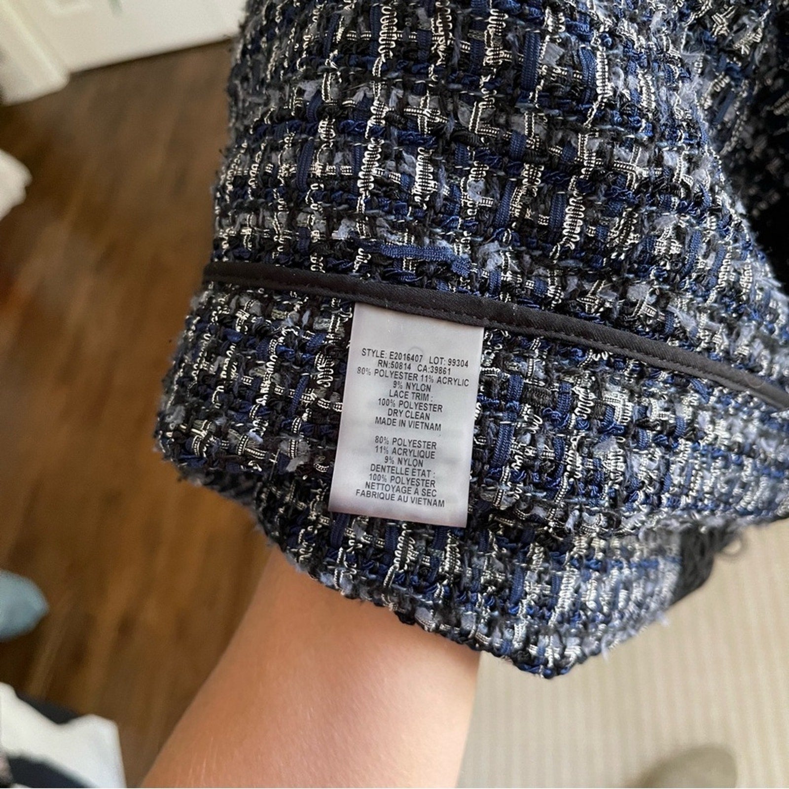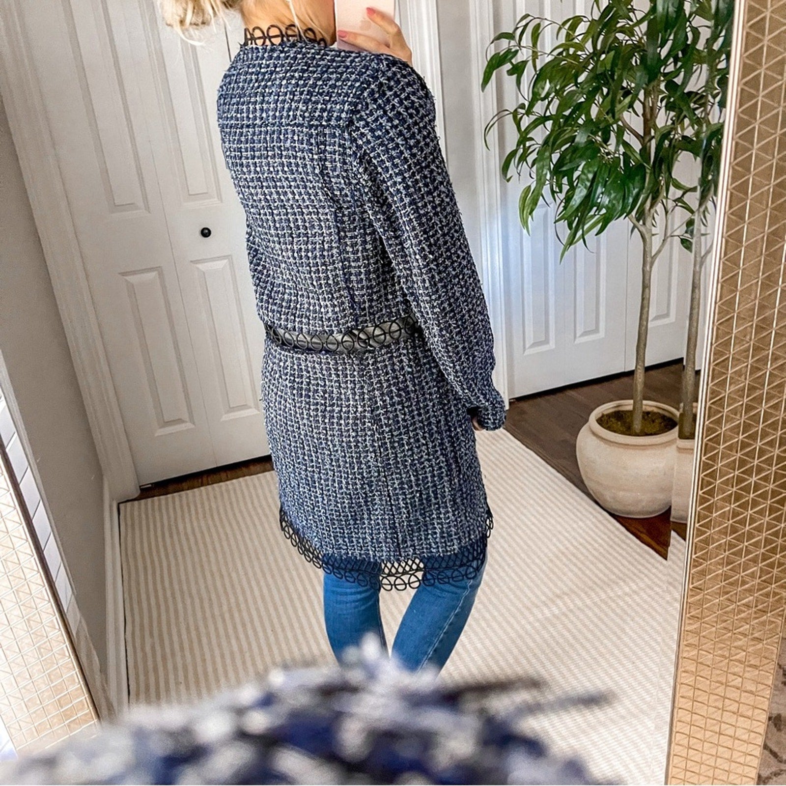 Details: Elie Tahari Twill Midi Cut Out Lace Trim Coat - Size: M - Color: Blue - Material: Polyester, acrylic, nylon - Lace trim: 100% polyester - E2016407 - Over coat - Long blazer style - cut out at waist, hidden eyelets inside for closure