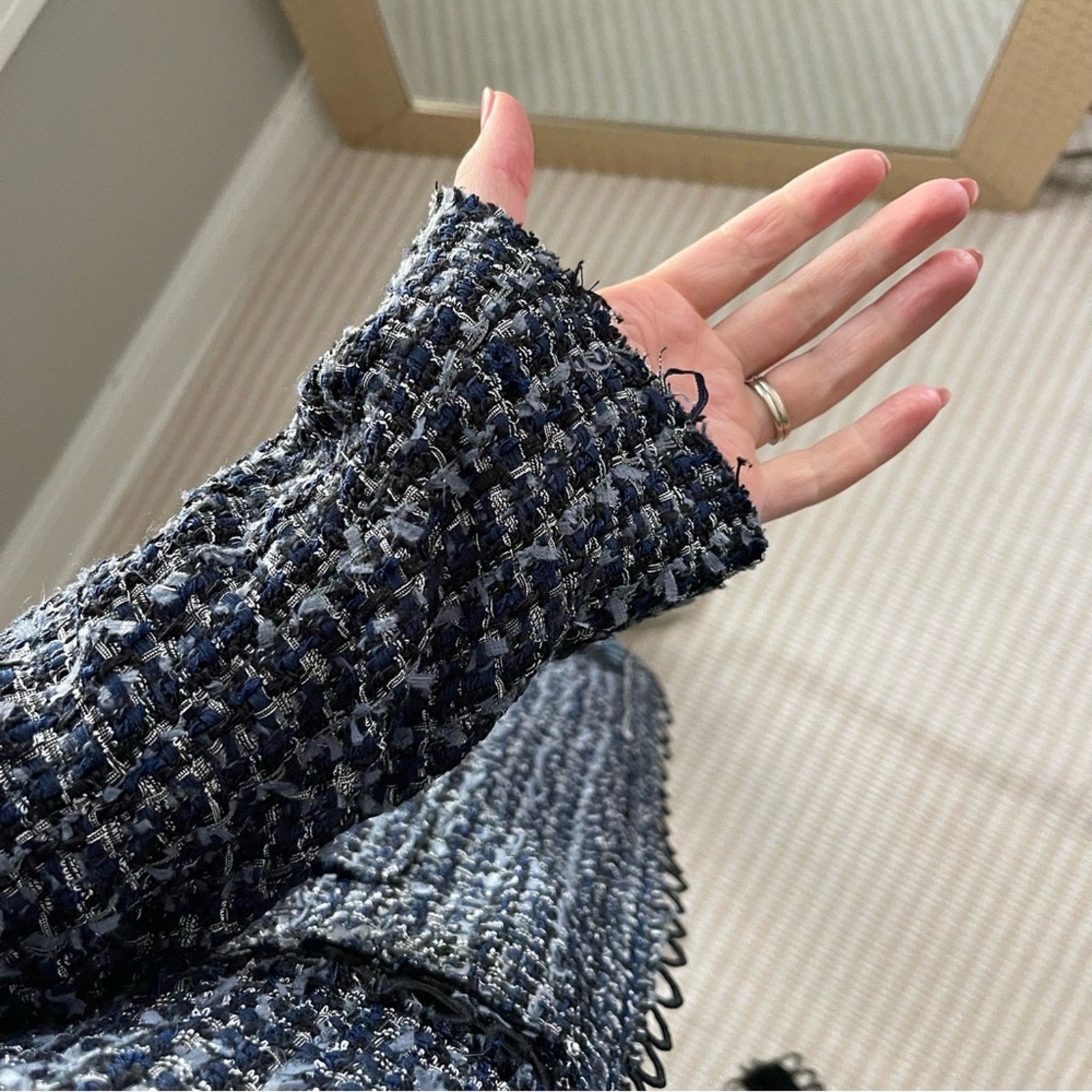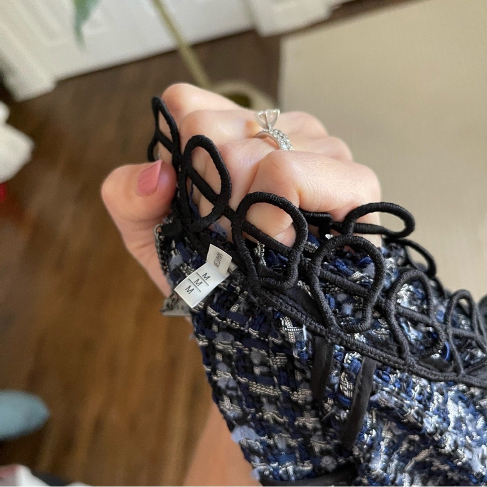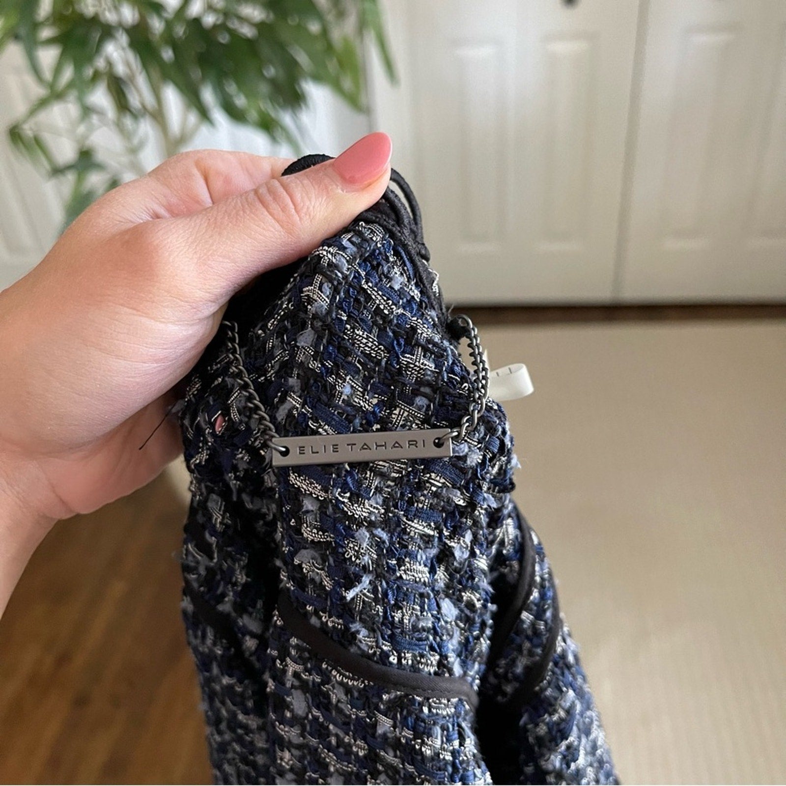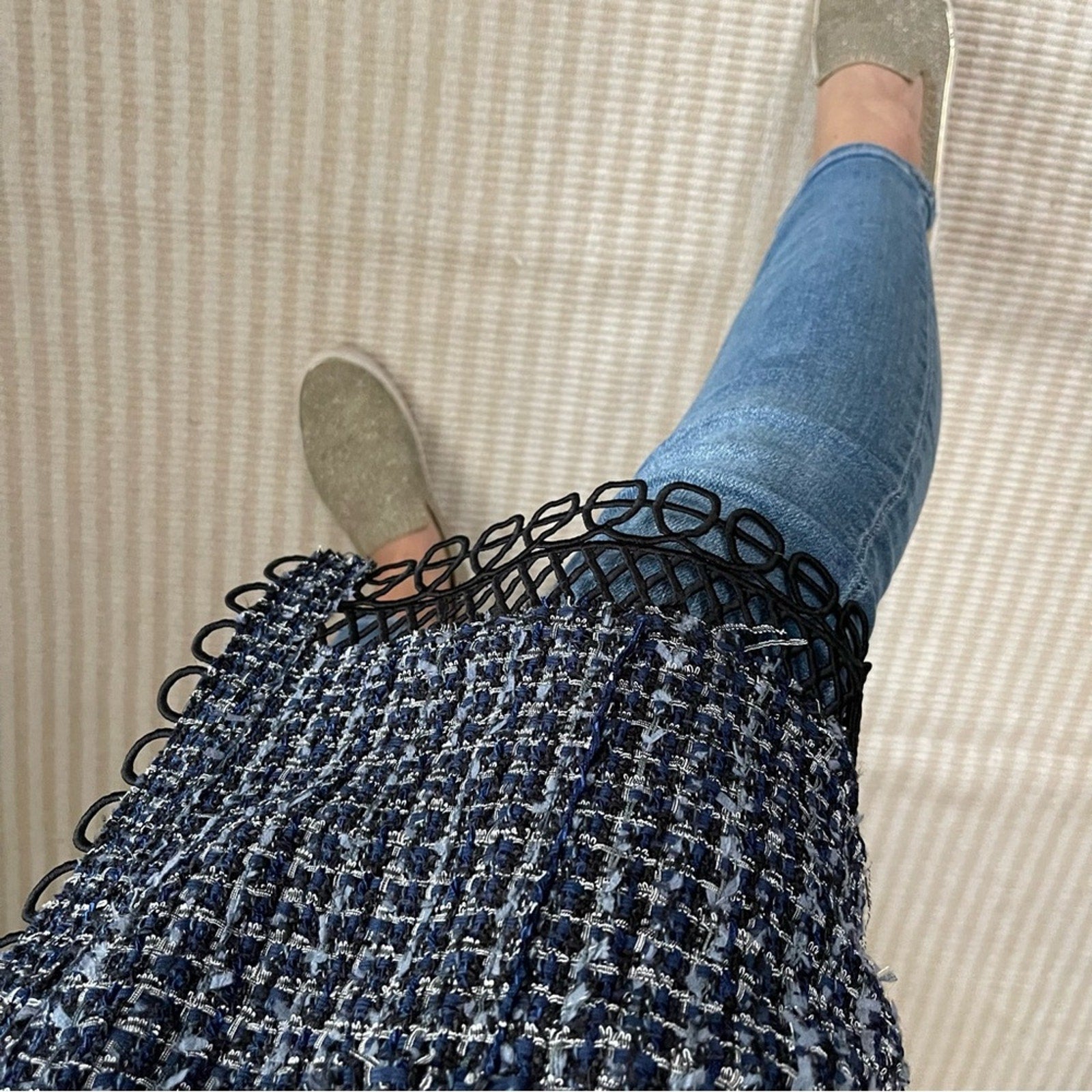 Details: Elie Tahari Twill Midi Cut Out Lace Trim Coat - Size: M - Color: Blue - Material: Polyester, acrylic, nylon - Lace trim: 100% polyester - E2016407 - Over coat - Long blazer style - cut out at waist, hidden eyelets inside for closure