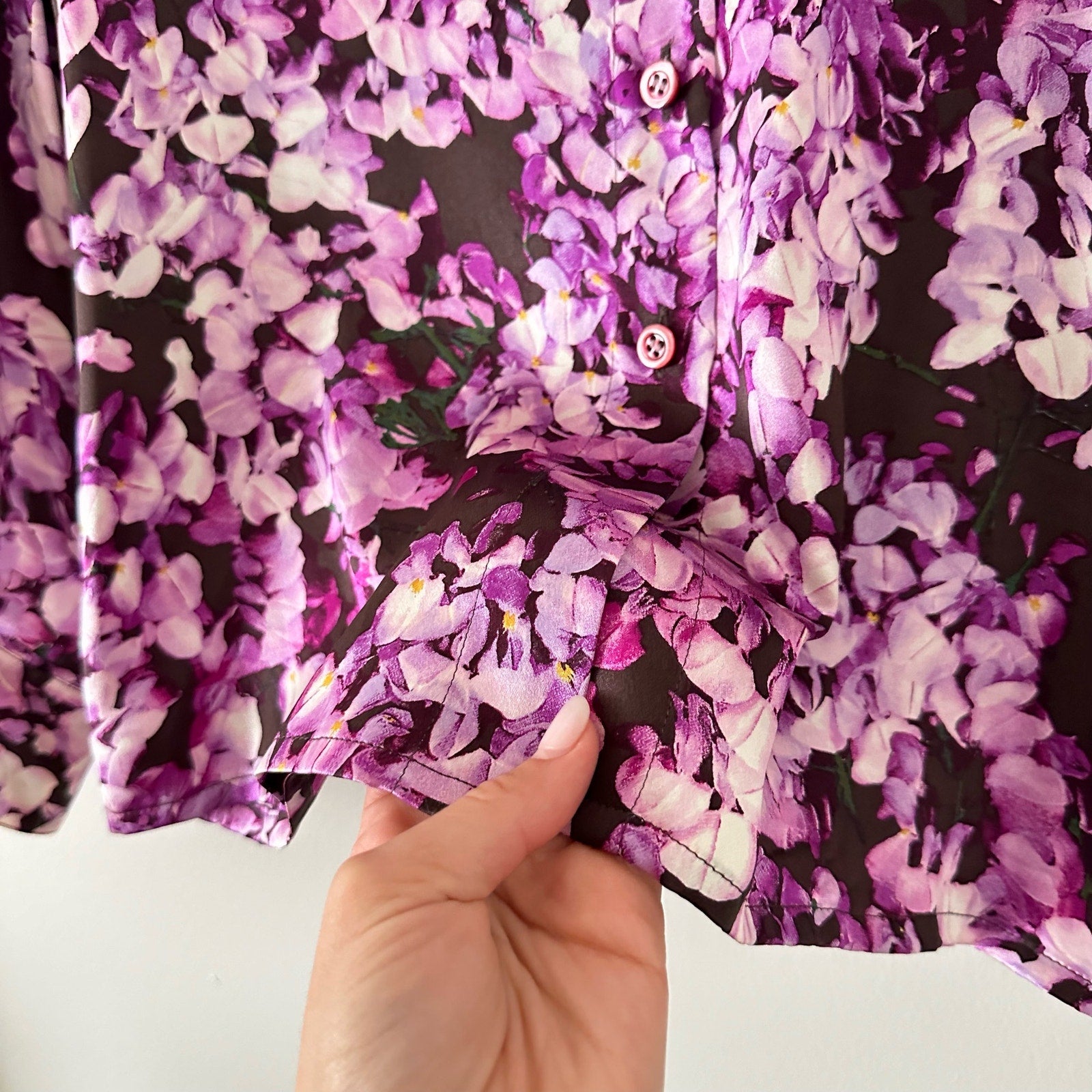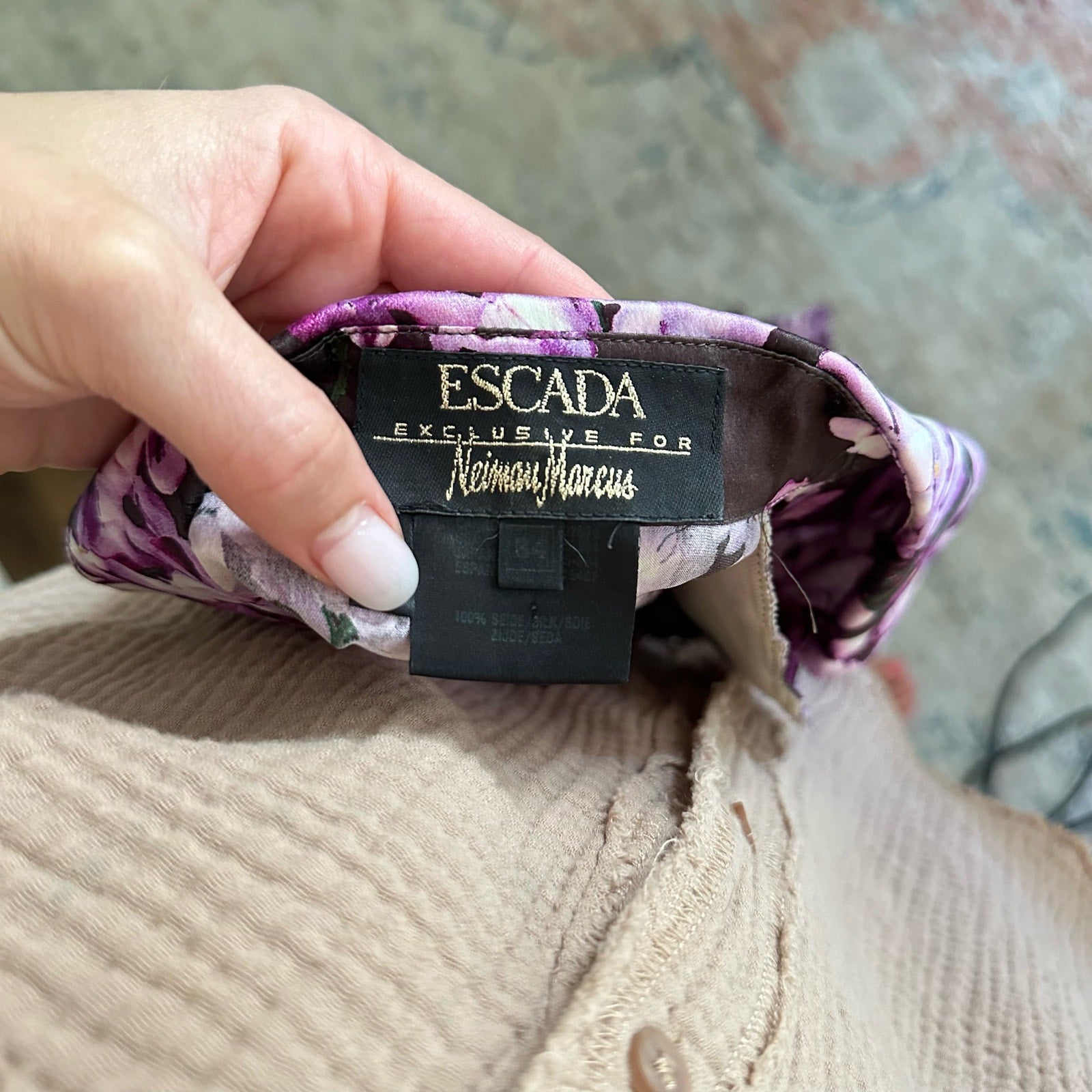 Details: Escada by Neiman Marcus Floral Long Sleeve Button Up Shirt - Size: 34 (S) - Color: Purple- Material: 100% Silk- Features: Floral pattern, long sleeve, button closure, collared, lightweight, cuffed sleeve, comfort, breathable, casual.