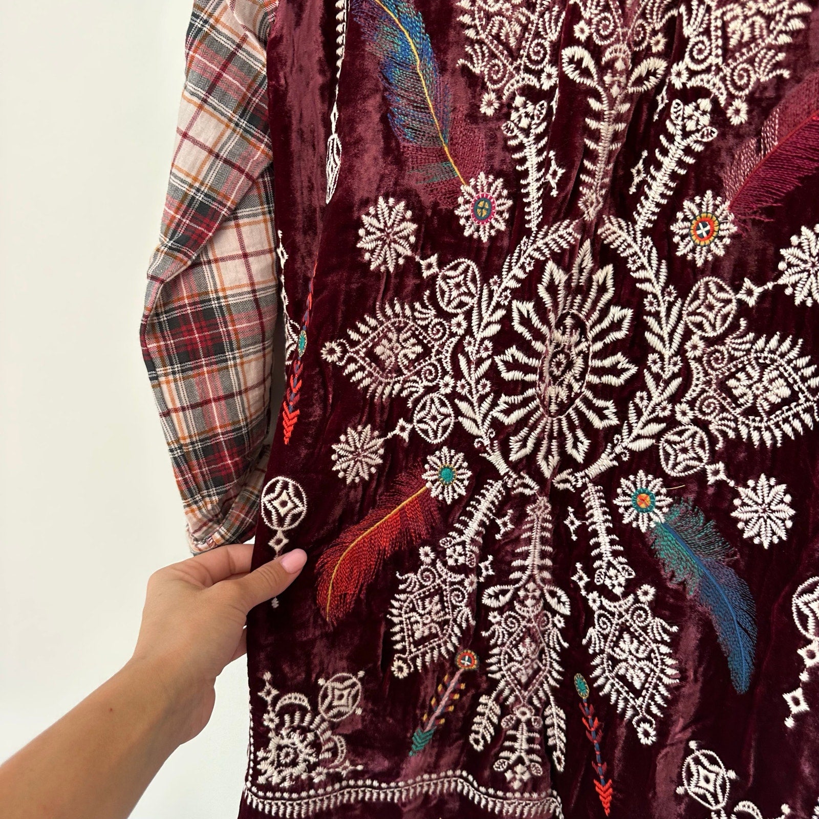 - Features: Embroidered, long sleeves, plaid print, button down, velvet