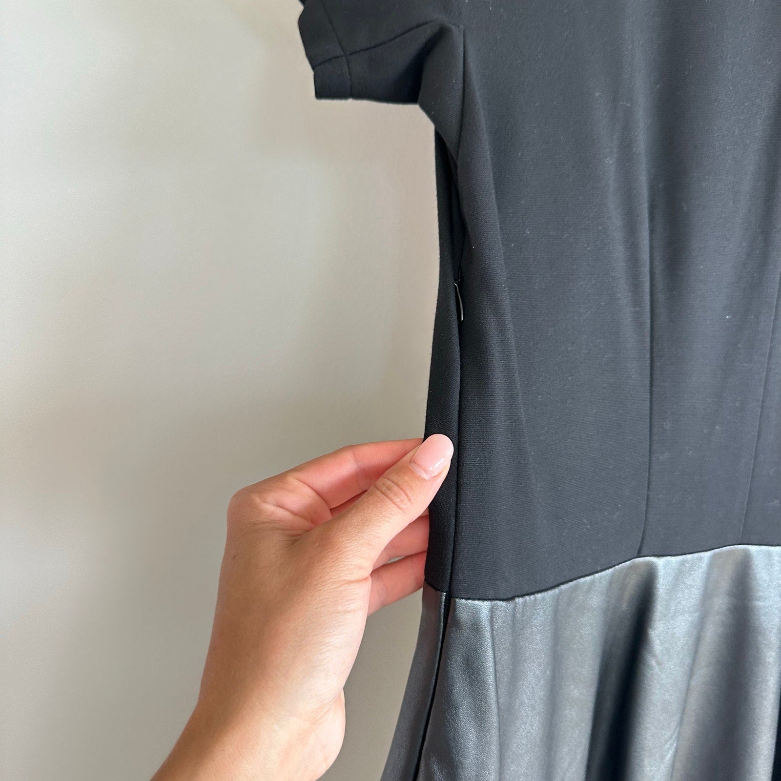 - Features: Short sleeve, A-line silhouette, Faux Leather fabric, multi-media, side zipper closure