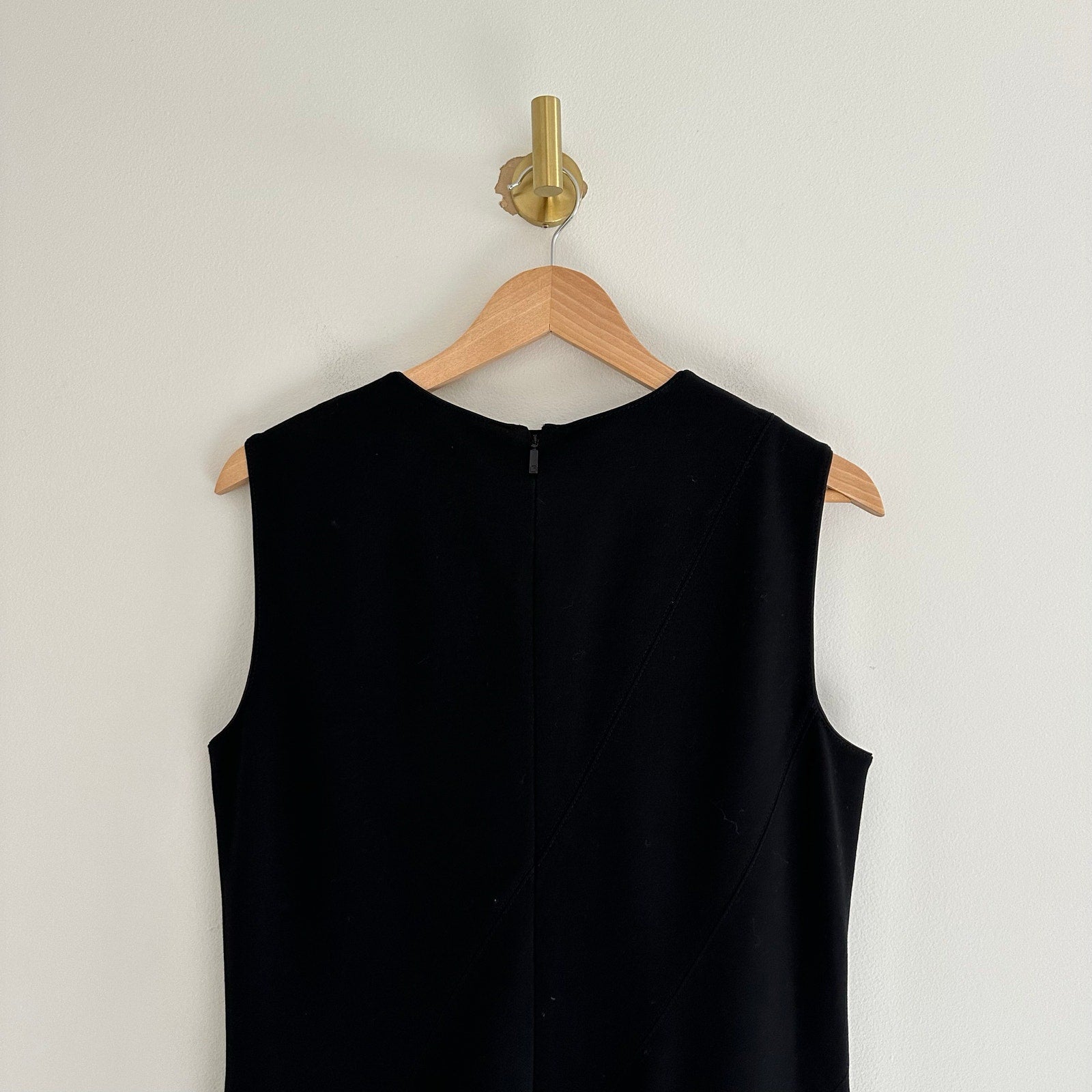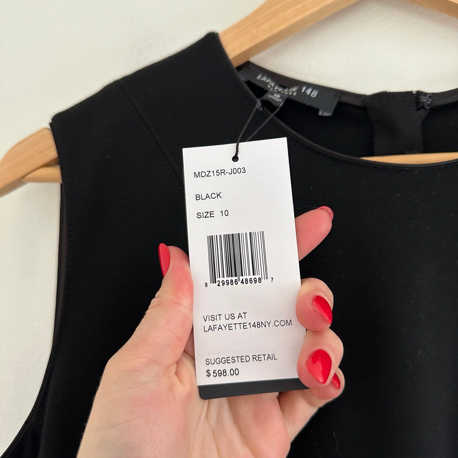 Details: Lafayette 148 Topenga Punto Milano Dress - Size: 10- Color: Black- Material: 71% Viscose, 24% Polyamide, 5% Elastane- Features: Sleeveless, crew neck, knee length, shift styling, hidden back zip closure, comfort, dry clean, casual.