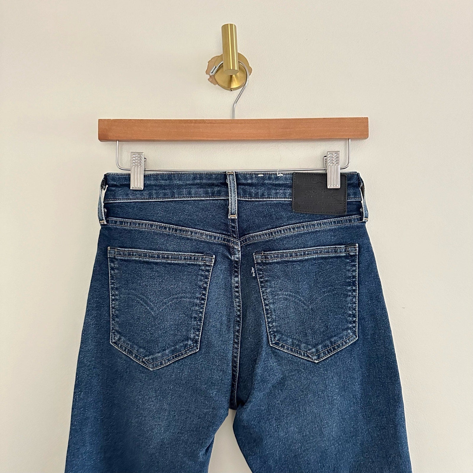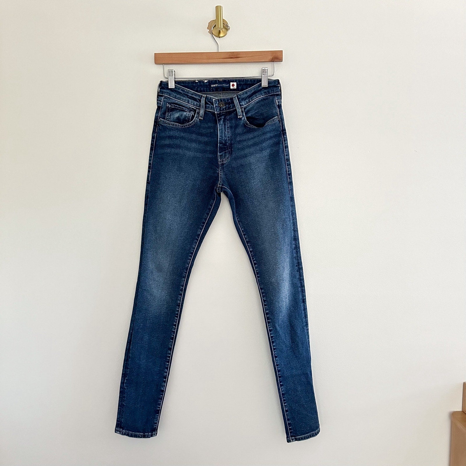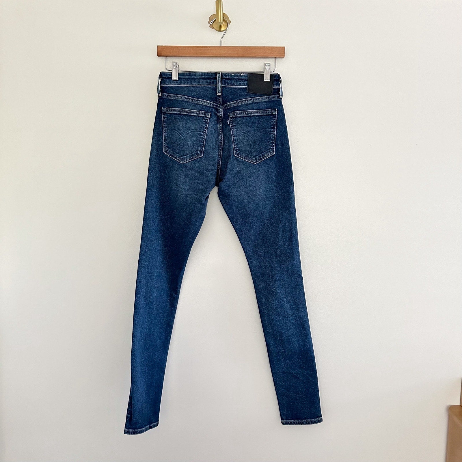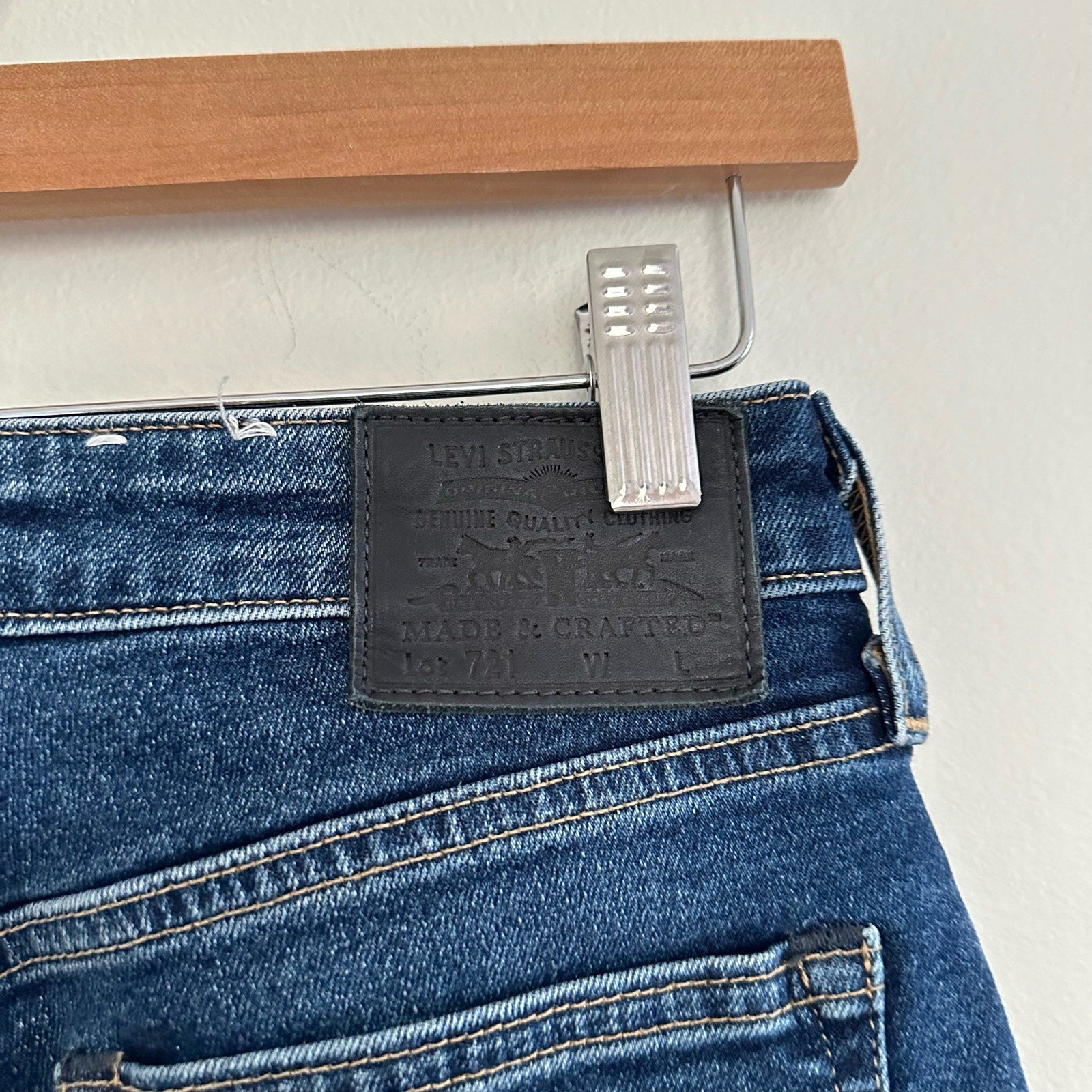 Details: Levi's 721 Rare Capital E High Rise Skinny Dark Wash Denim Jeans - Size: 27- Color: Blue- Material: - Features: High rise waist, skinny leg, denim, dark wash, belt loops, zipper fly with button waist, logo, comfort, breathable, casual.