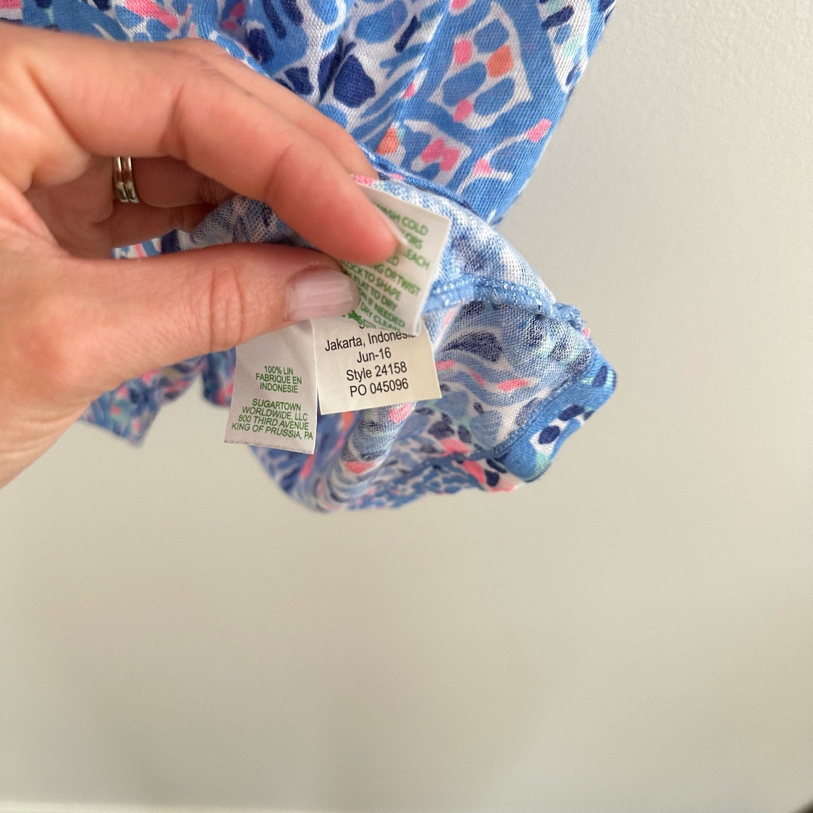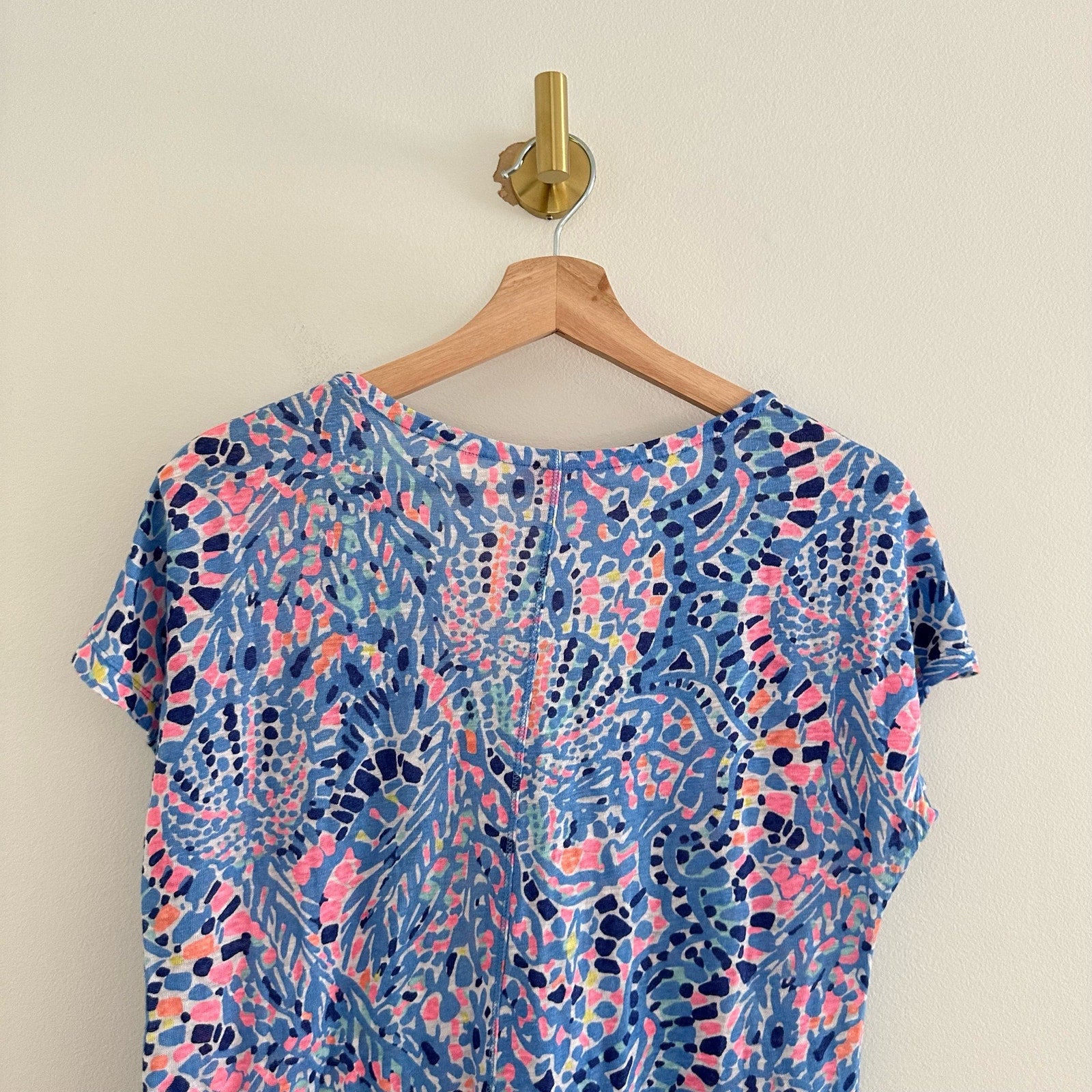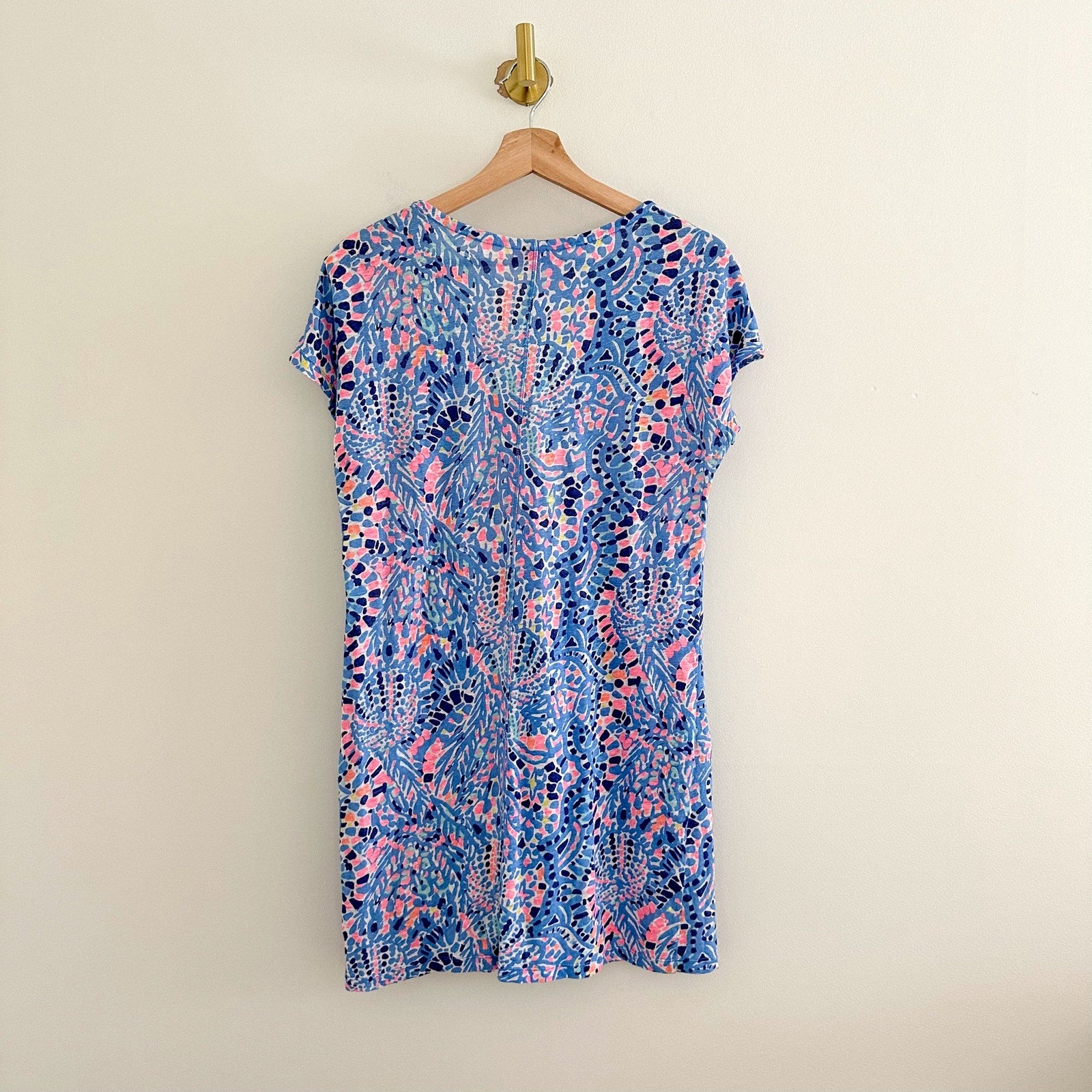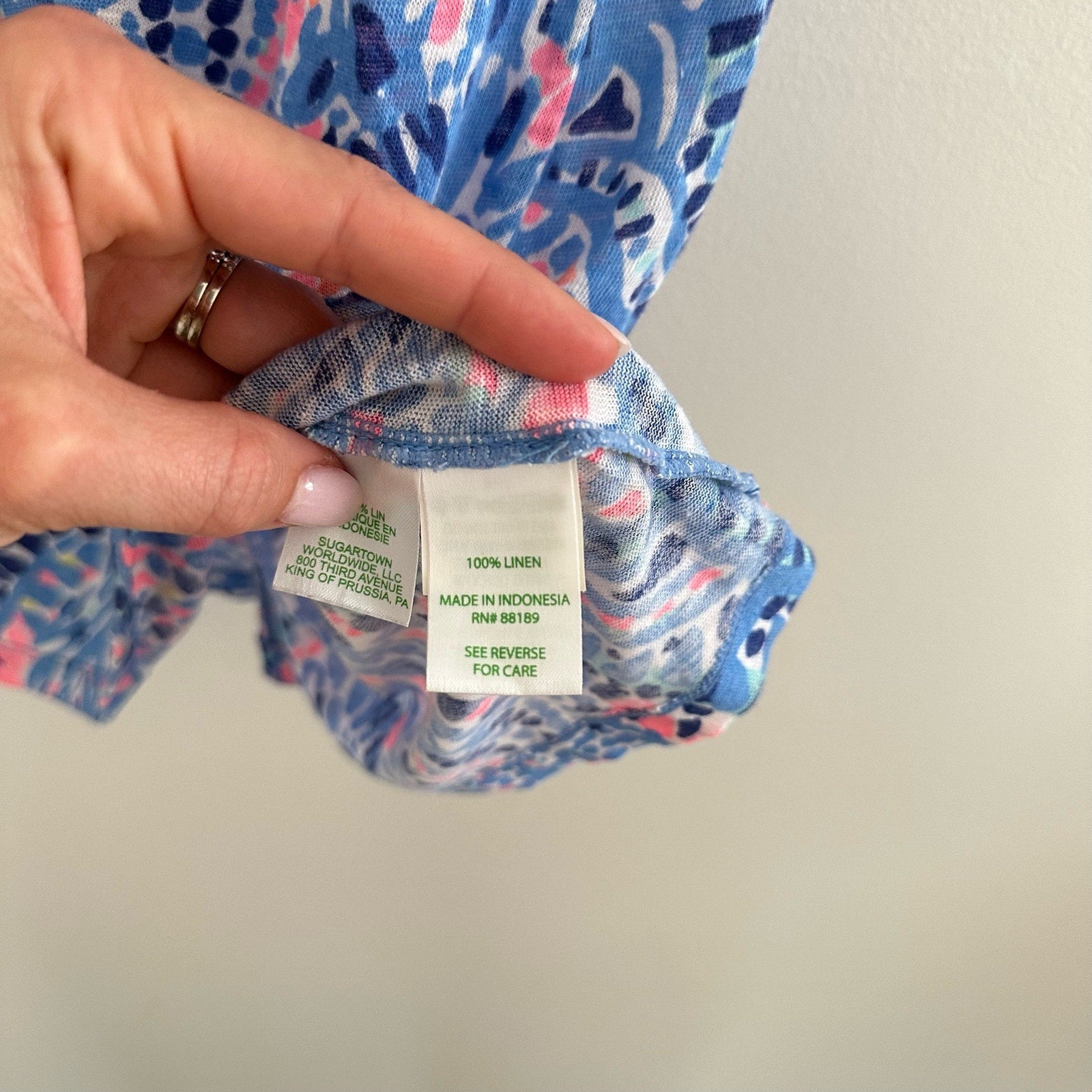 Details: Lilly Pulitzer Duval Tic Tac Tile V-Neck Mini T-Shirt Dress - Size: S- Color: Blue/Pink- Material: 100% Linen- Features: Pullover, short sleeve, V-neck, mini length, t-shirt dress style, geometric pattern, tic tac tile, machine wash, comfort, breathable, casual.