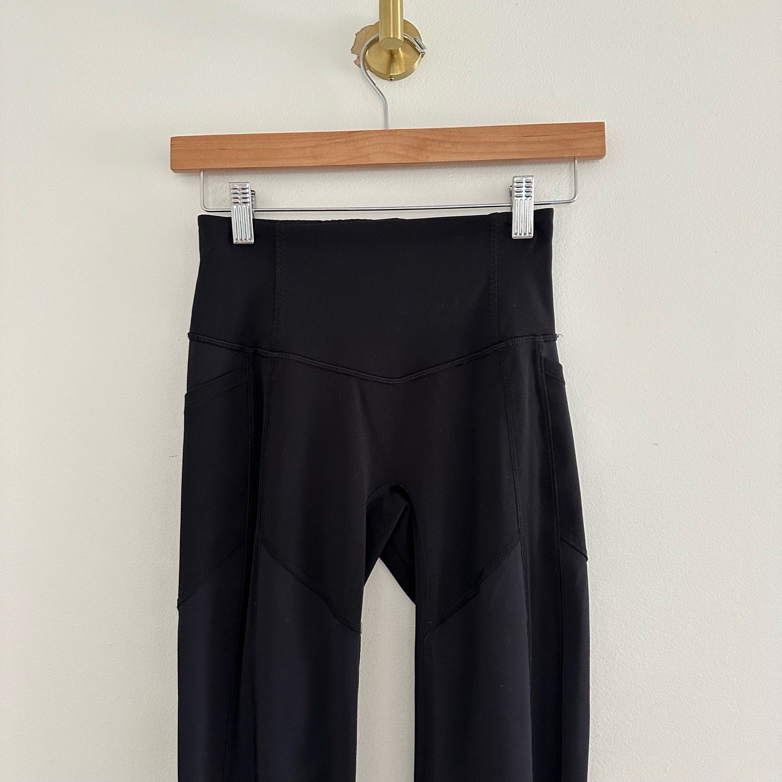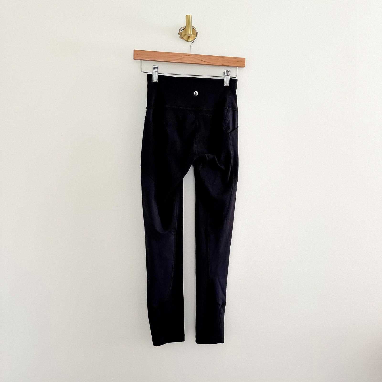 Details: Lululemon Front Panel Pocket Leggings - Size: 4- Color: Black - Features: High rise waist, pull on, stretch, wide waistband, elastic waist, pockets, comfort, breathable, casual, activewear.