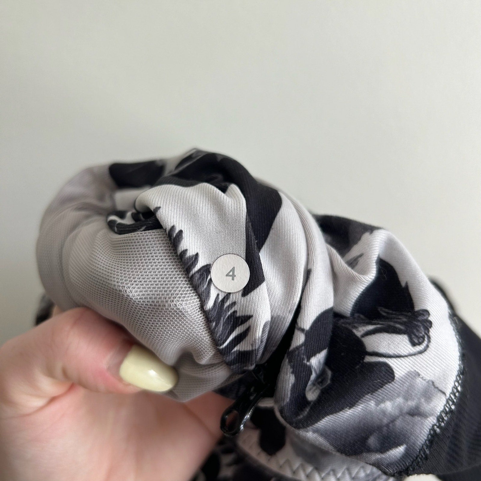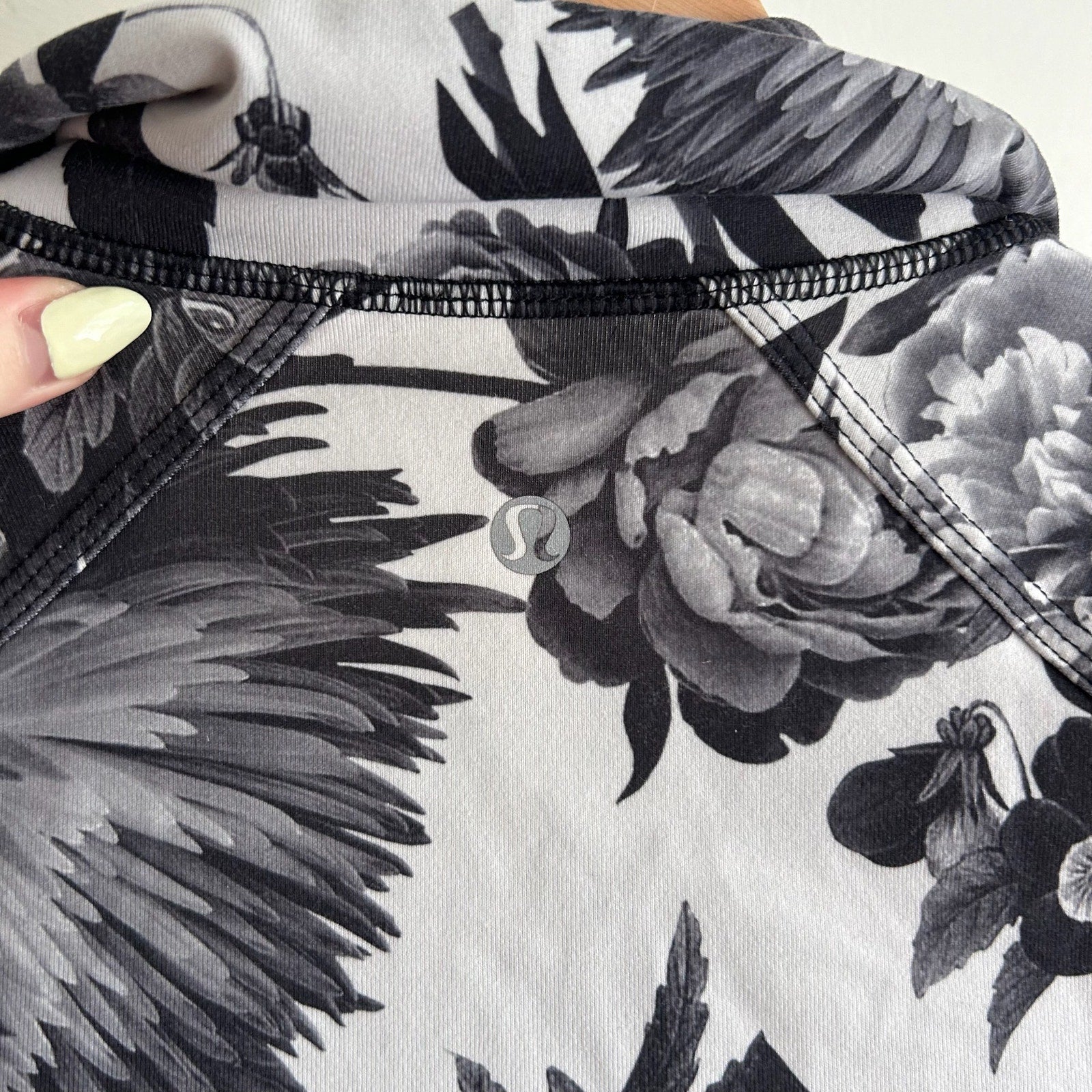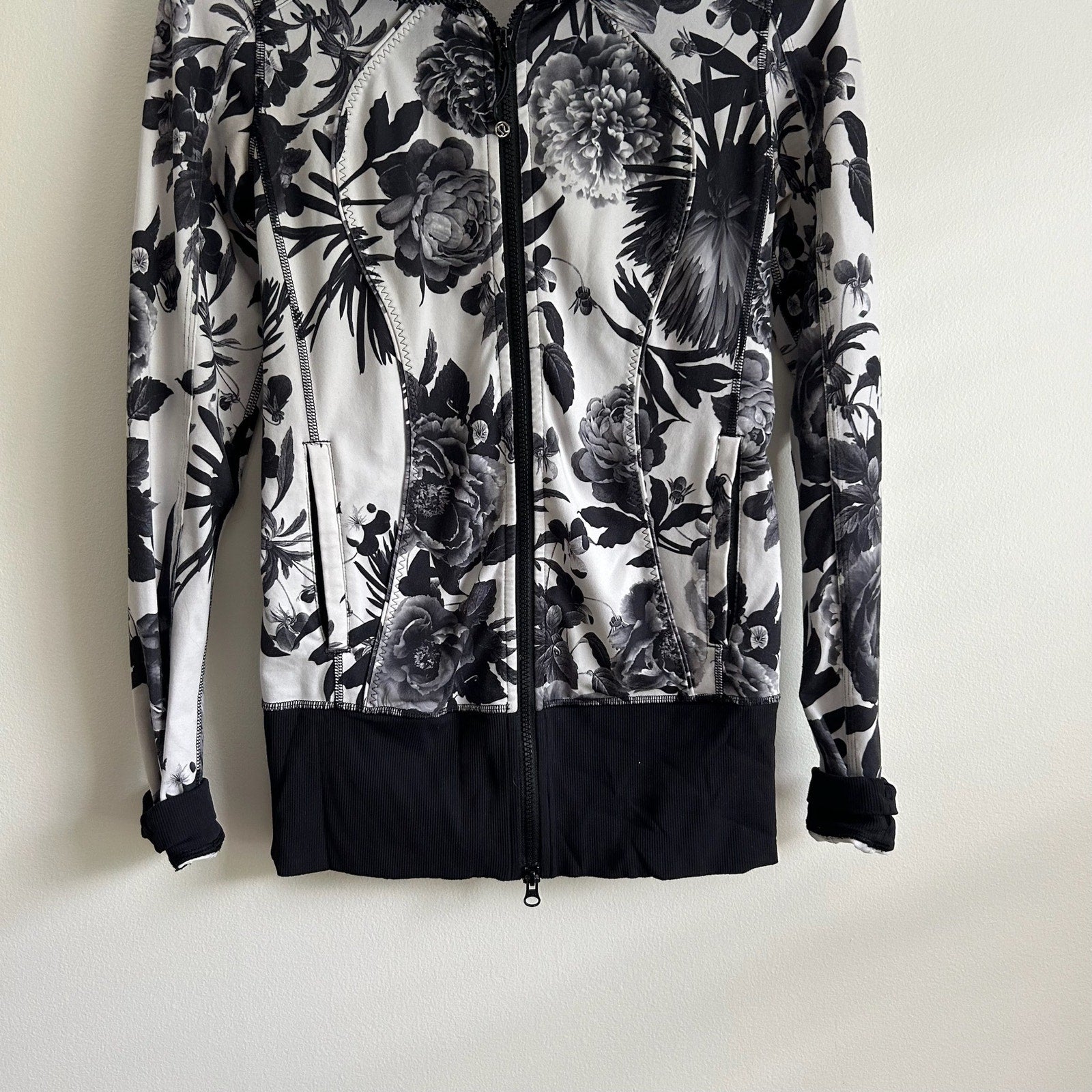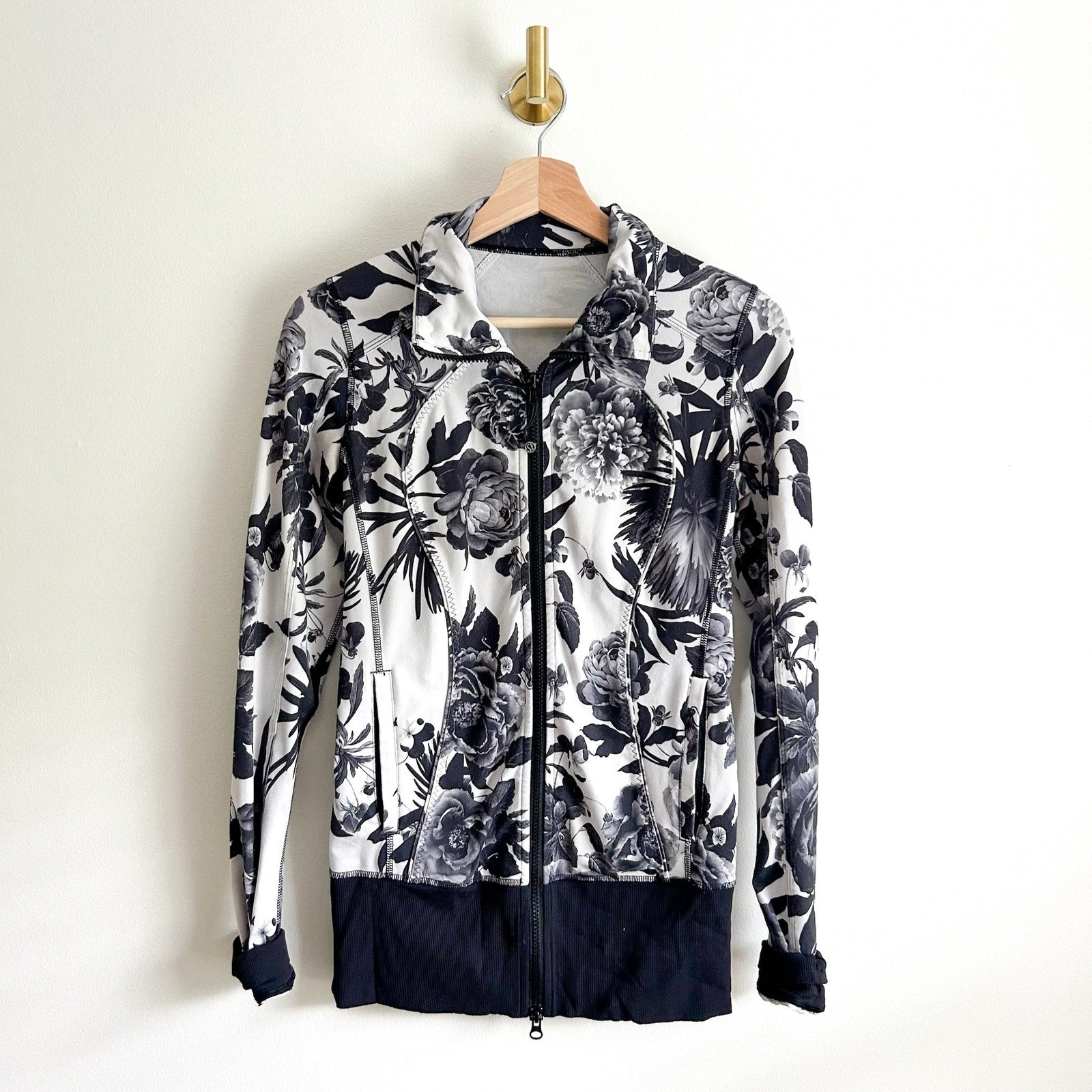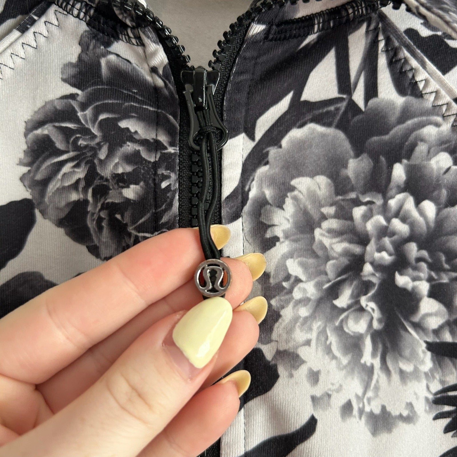 Details: Lululemon Nice Asana Yoga Zip Up Mock Neck Activewear Jacket - Size: 4- Color: Black/White (Brisk Bloom Black White)- Features: Zipper closure, mock neck, floral pattern, sweat-wicking, zip pockets, thumbholes, long sleeve, relaxed fit, low-hip length, logo, comfort, breathable, yoga, outdoor, casual, activewear.