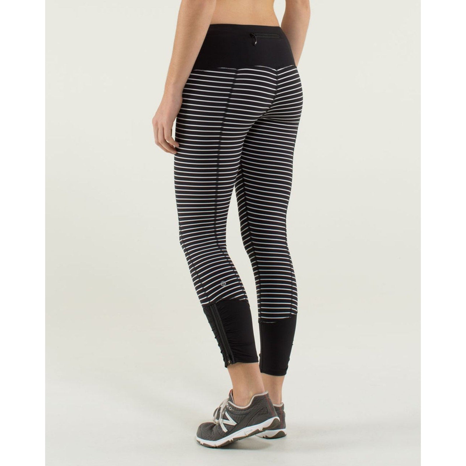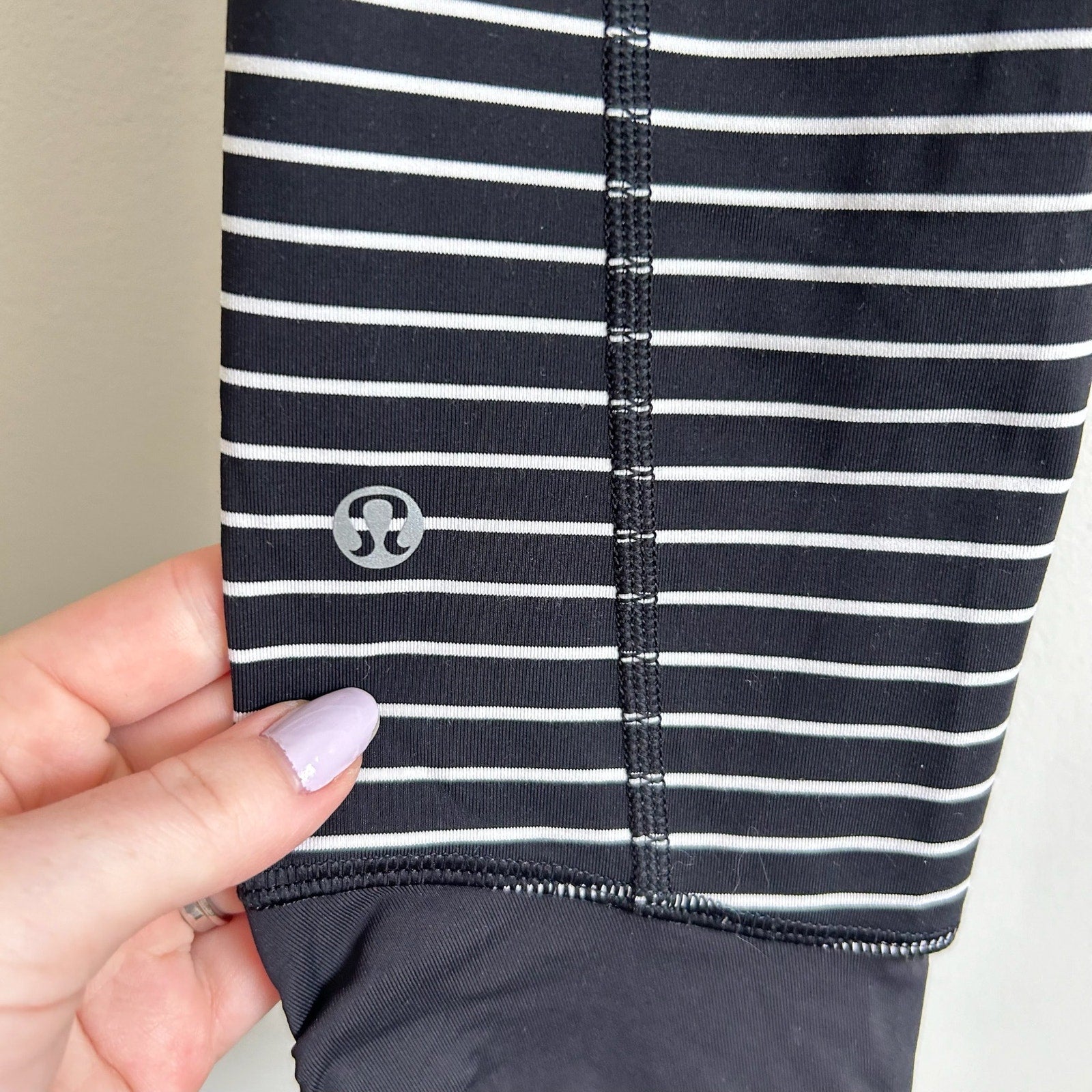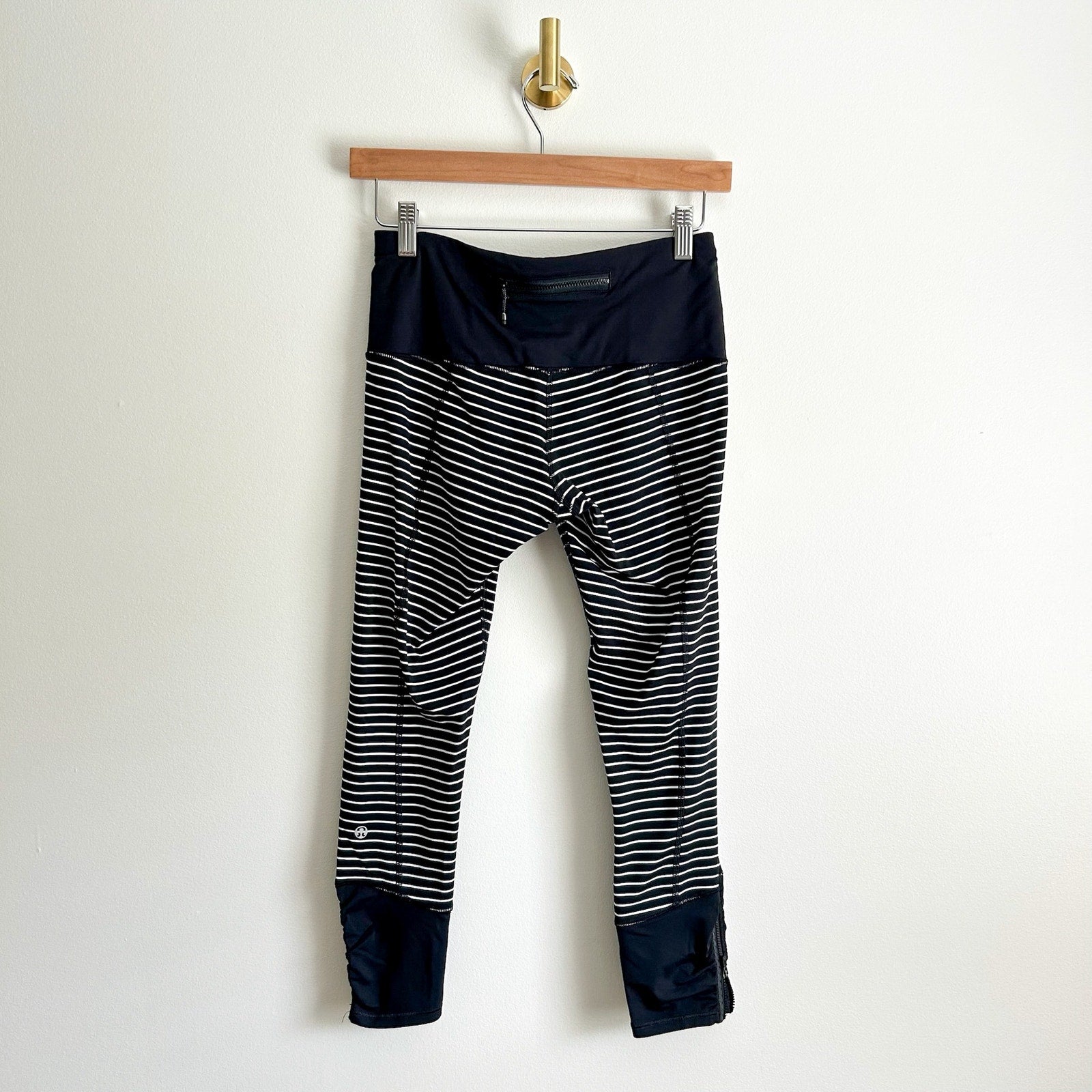 Details: Lululemon Runday Crop (First Release) Striped Running Leggings - Size: 4- Color: Black/White (Parallel Stripe Black White / Black)- Material: - Features: Mid-rise waist, cropped, pull on, striped pattern, stretch, wide waistband, elastic waist, logo, three-pocket waistband, reflective leg panels, drawcord waist to adjust, comfort, breathable, casual, activewear.