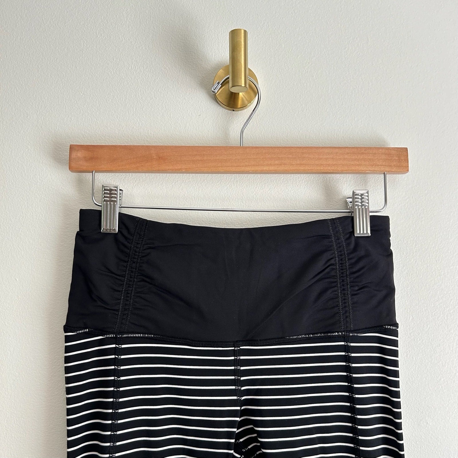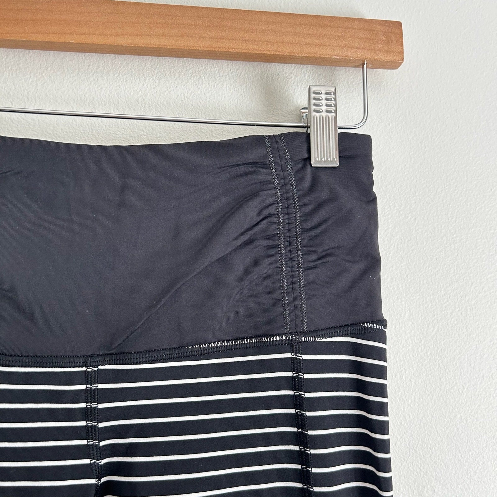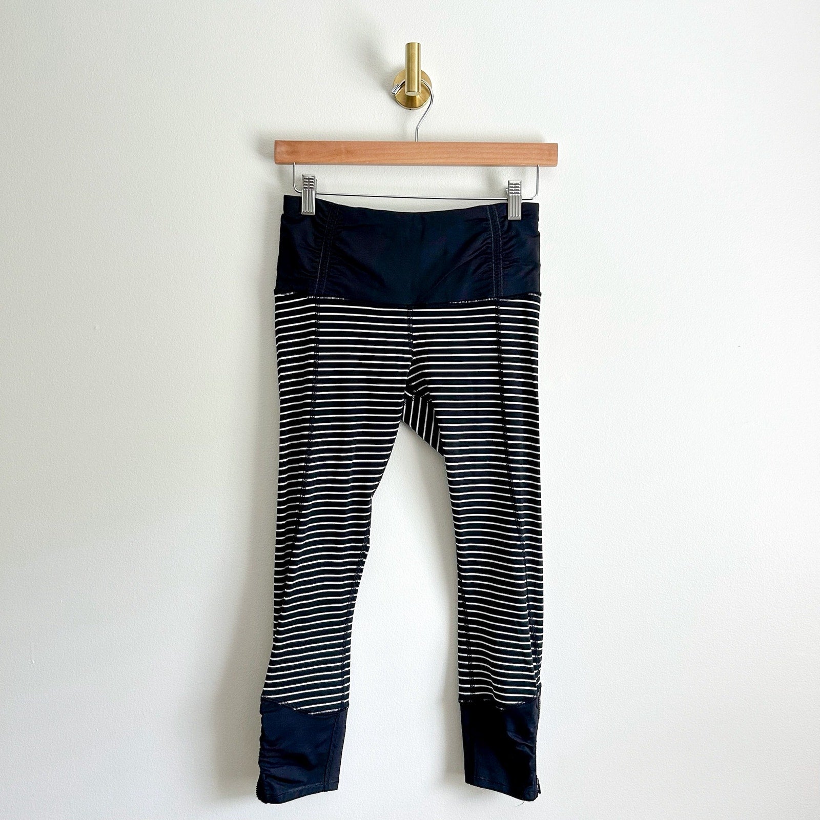 Details: Lululemon Runday Crop (First Release) Striped Running Leggings - Size: 4- Color: Black/White (Parallel Stripe Black White / Black)- Material: - Features: Mid-rise waist, cropped, pull on, striped pattern, stretch, wide waistband, elastic waist, logo, three-pocket waistband, reflective leg panels, drawcord waist to adjust, comfort, breathable, casual, activewear.