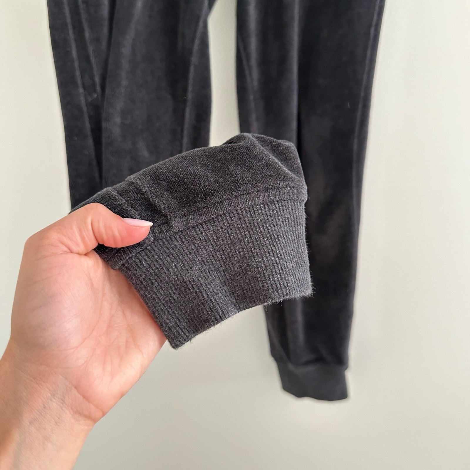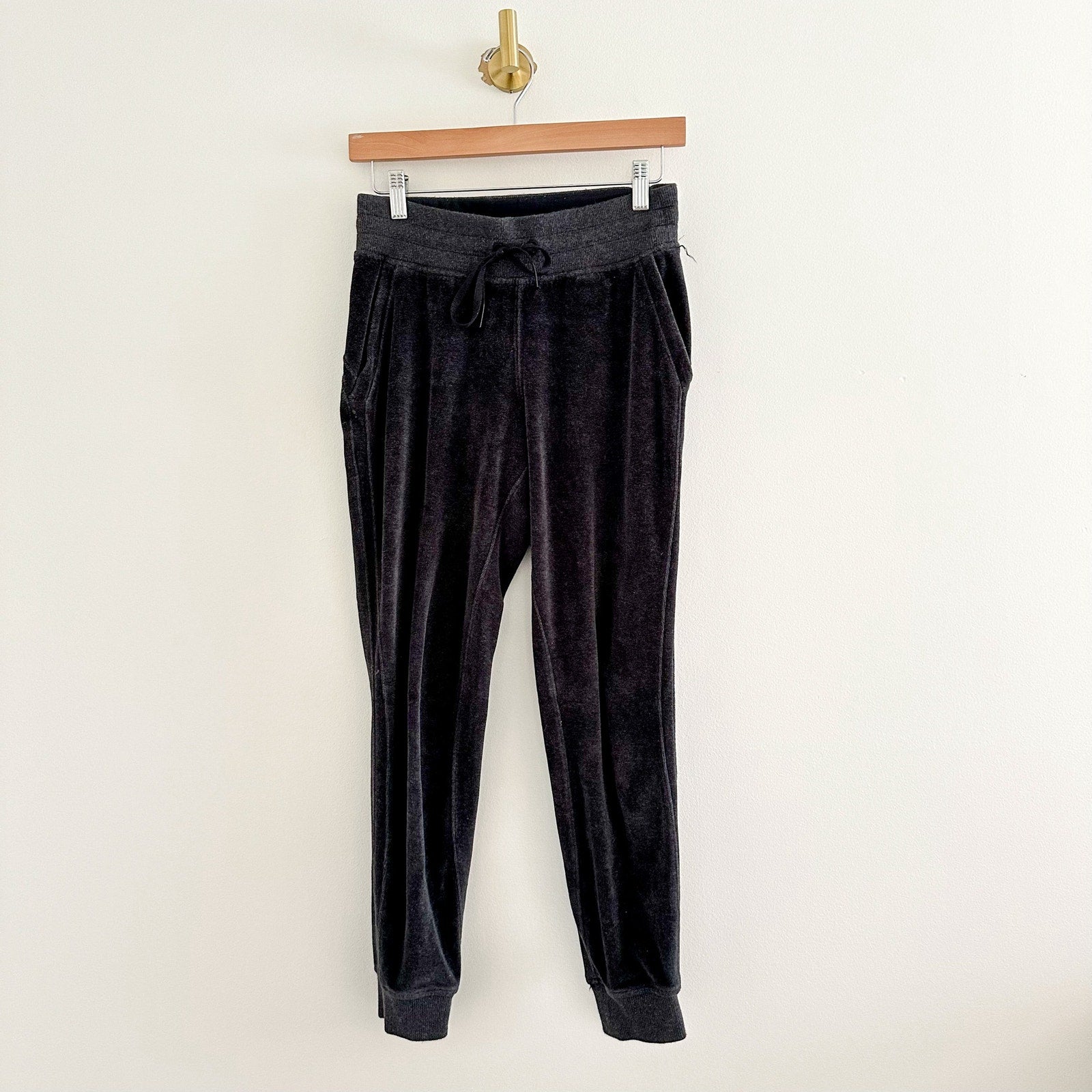Details: Lululemon Warm Down Jogger *Velour - Size: 4 - Color: Black (Heathered Black)- Material: 80% Cotton, 20% Polyester- Features: Drawcord waist, mid rise waist, pockets, logo, machine wash, elastic waist, velour fabric, comfort, breathable, casual, activewear.