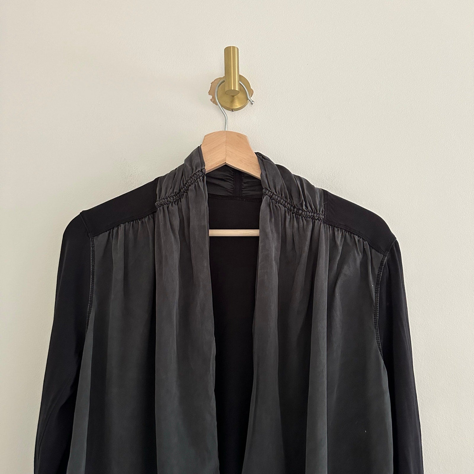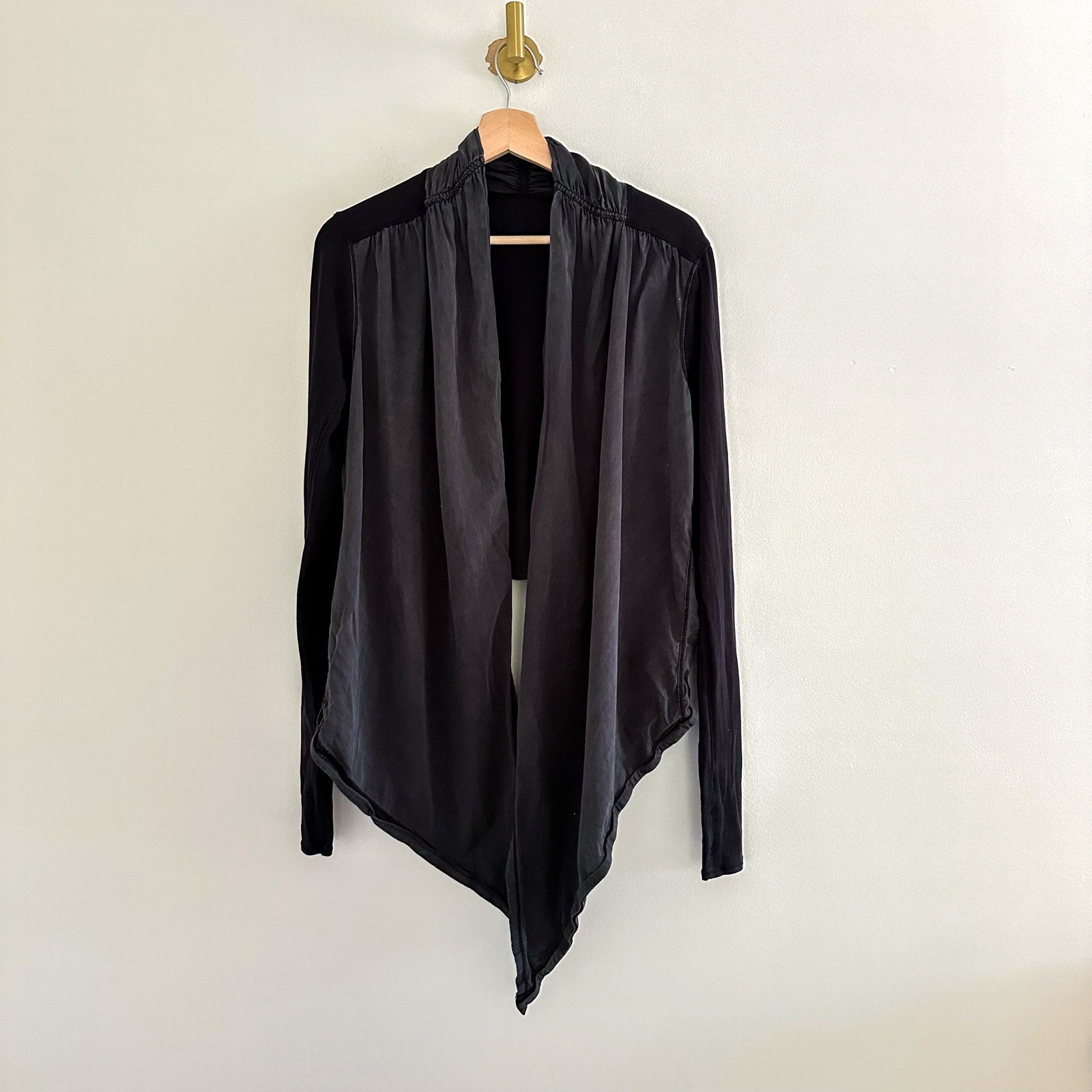 Details: Lululemon Washable Silk Draped Open-Front Wrap Cardigan - Size: 4 - Color: Black- Material: Silk blend, multi media - Features: Breath easy all the way to your yoga class in this lightweight and versatile wrap tencel® is derived from wood pulp and is soft, light and breathable Vitasea™ is a cotton, Seacell® and spandex blend, that is breathable, soft and feels awesome against the skin Long front of wrap allows for multiple wrap options, play and come up with your very own Thumbholes keep sleeves down and hands warm. Stock image created by AI