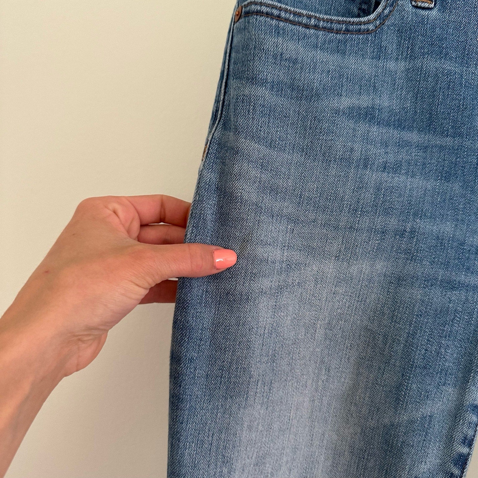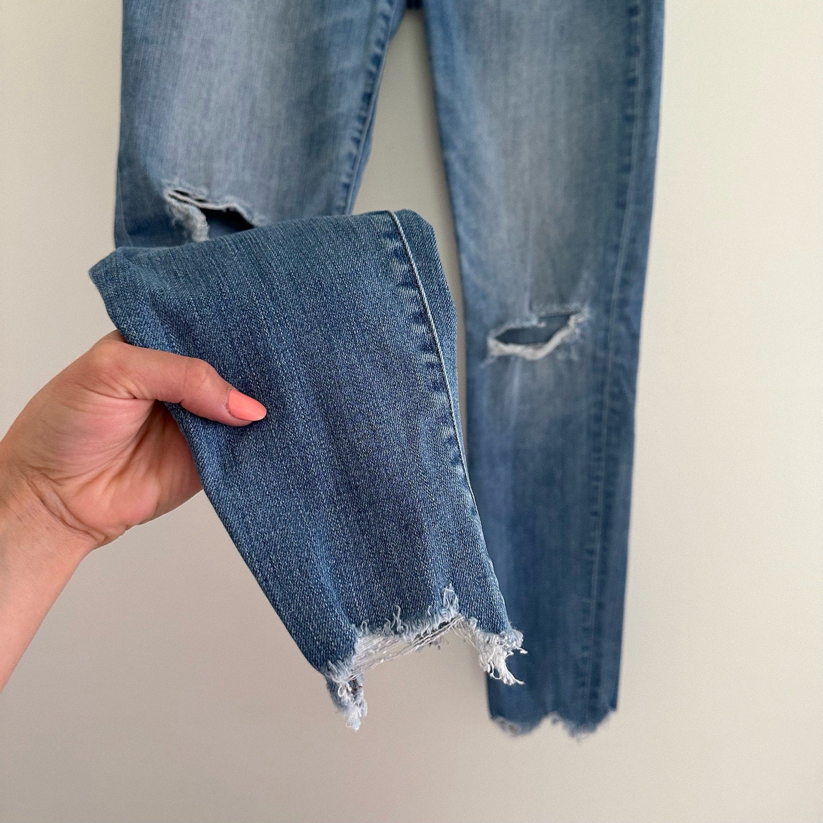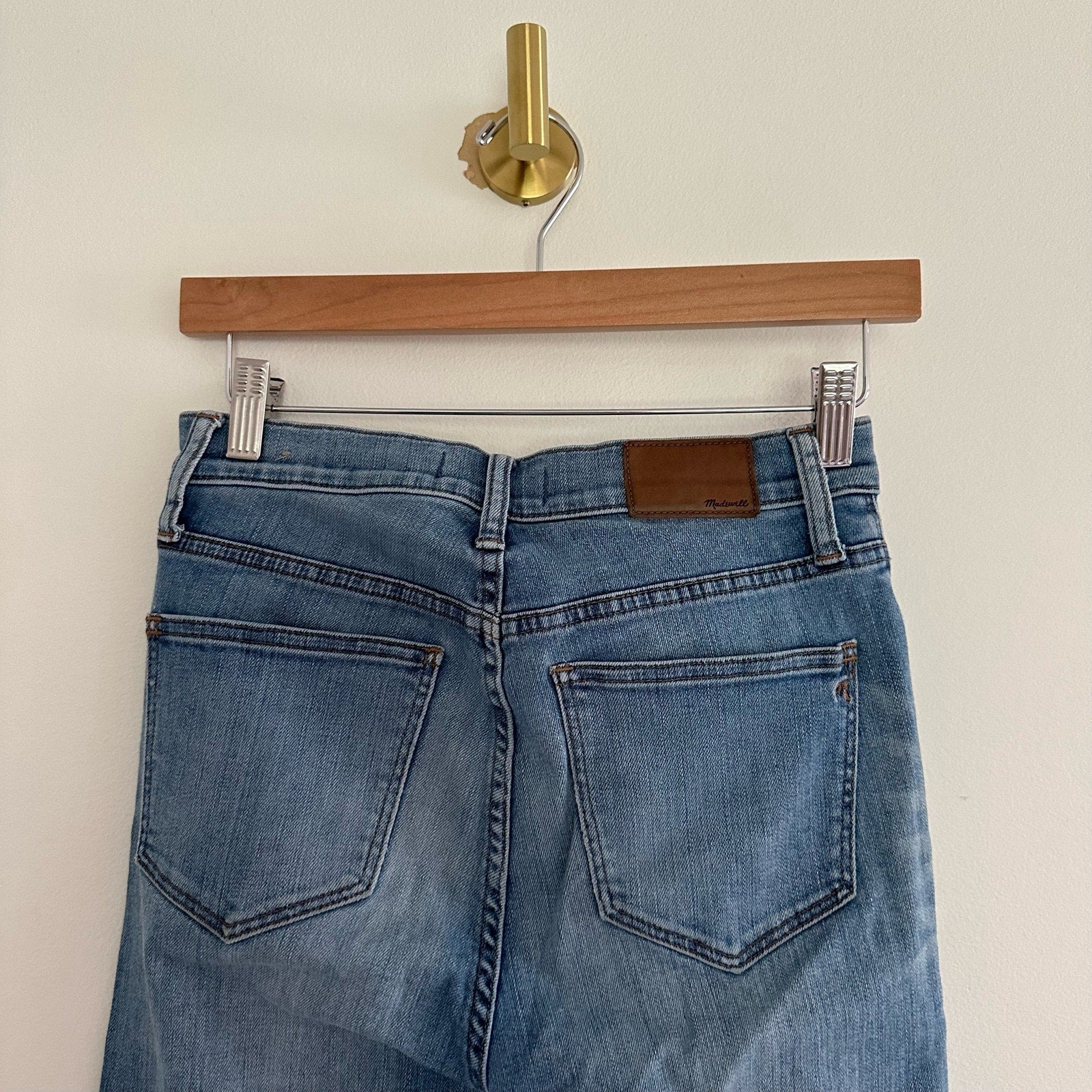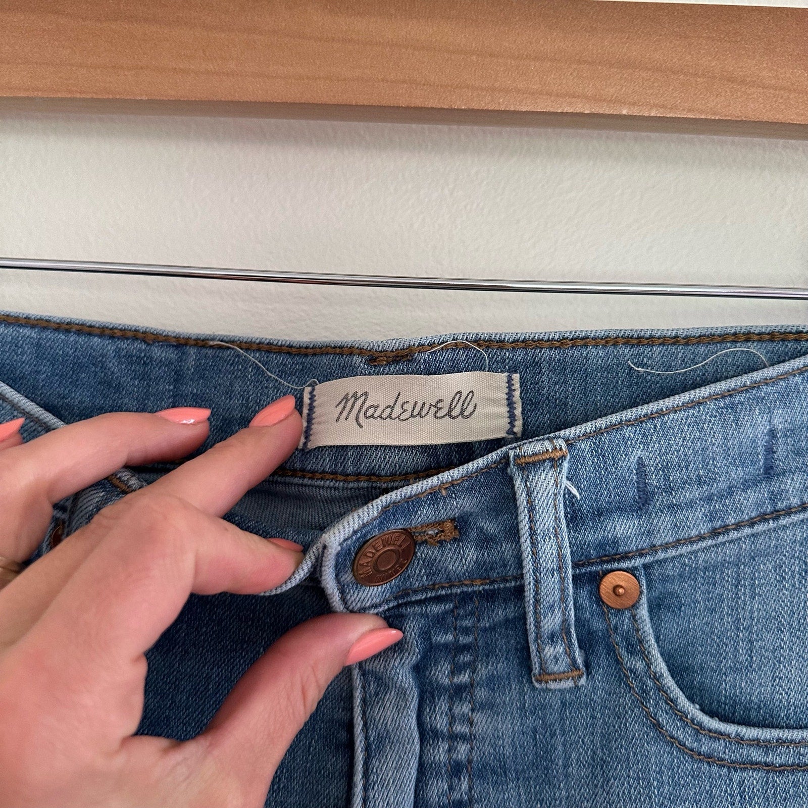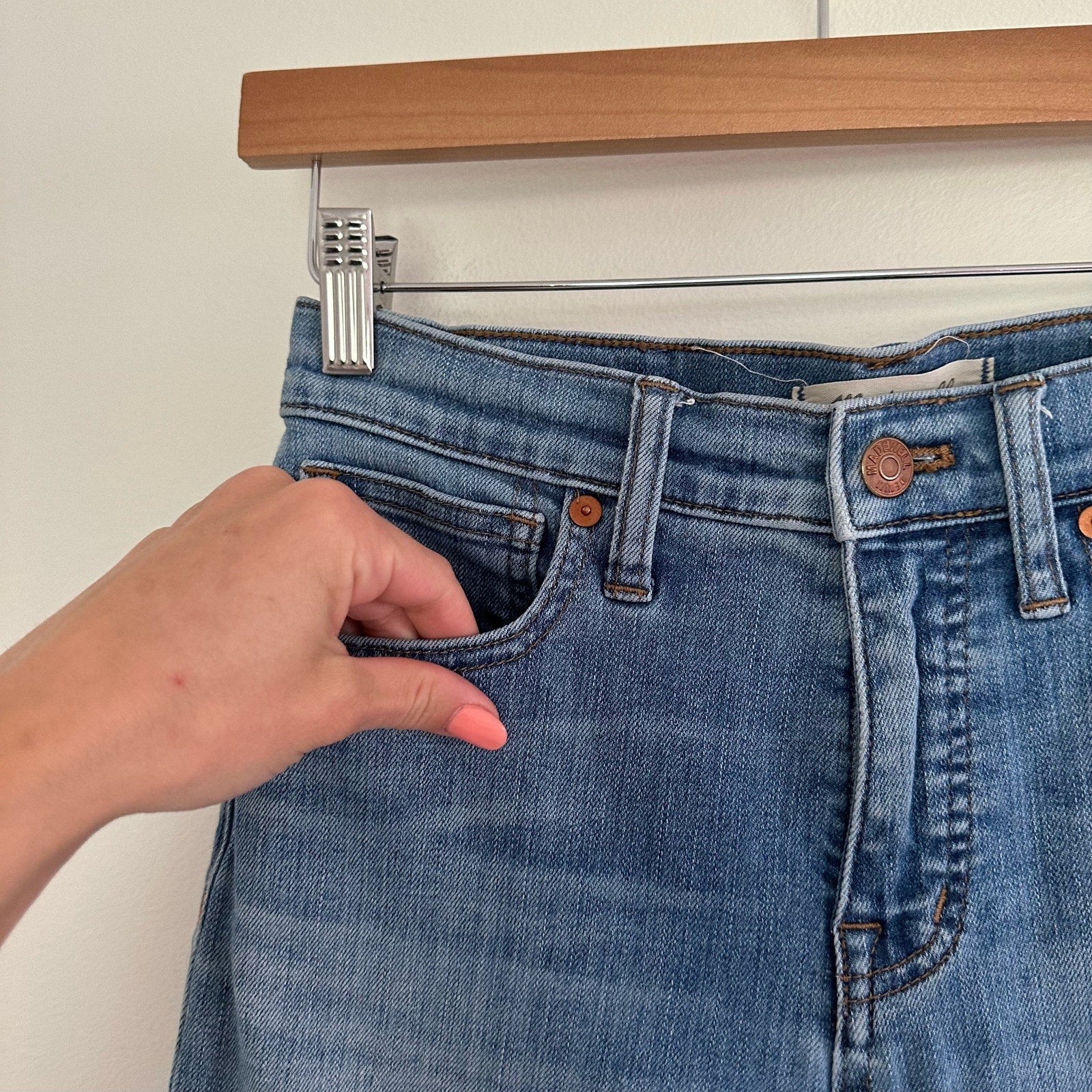 Details: Madewell 9" High-Rise Distressed Denim Medium Wash Skinny Jeans - Size: 26- Color: Blue- Features: High rise waist, distressed, denim, medium wash, skinny leg, belt loops, zipper fly with button waist, 5-pocket styling, logo, comfort, breathable, casual. Raw hem. Stock image created by AI.