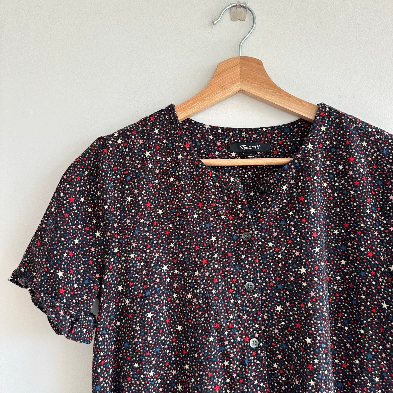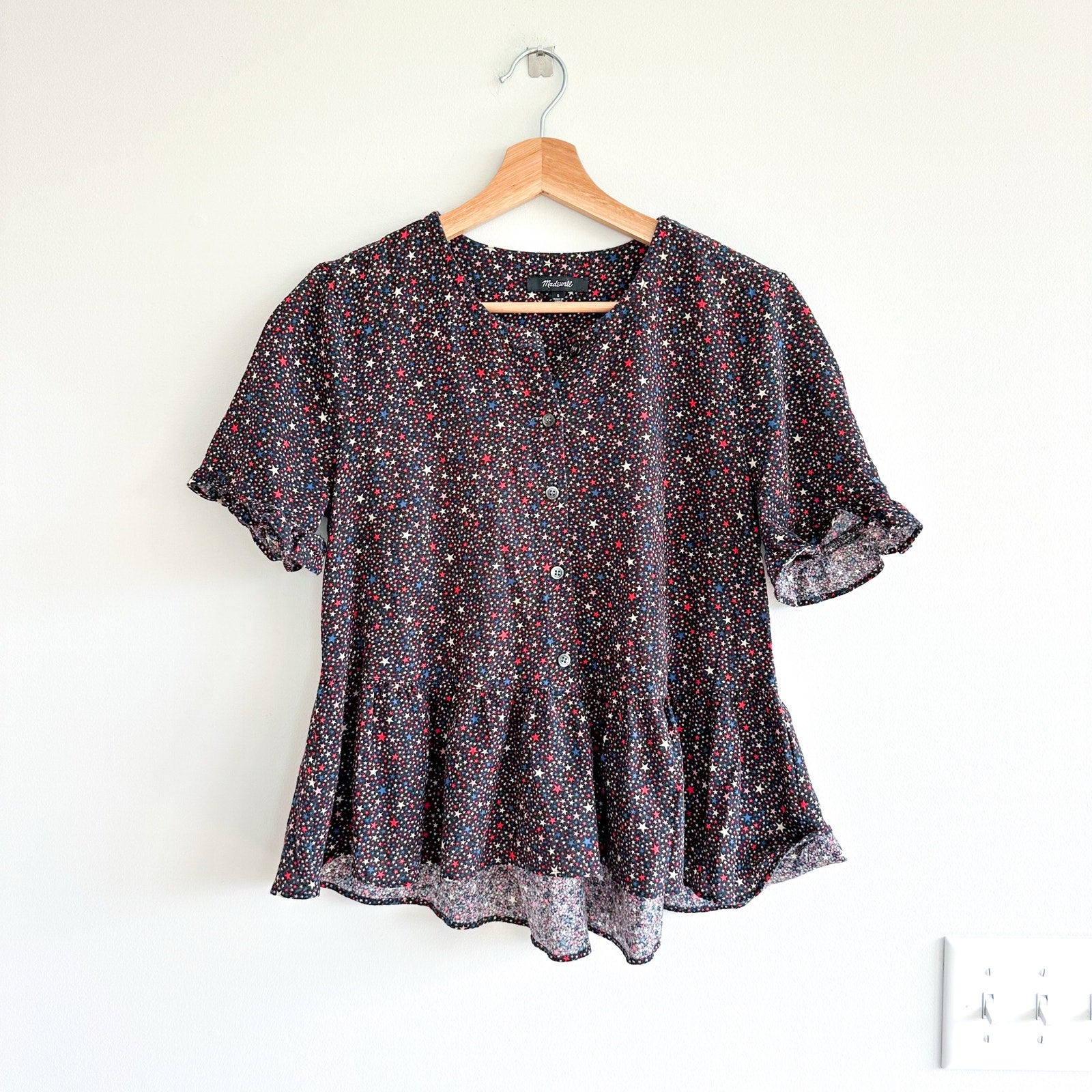 This Madewell Studio Ruffle-Hem Top in Starry Night is the perfect addition to your wardrobe! With its charming star print and flattering peplum silhouette, it's sure to become a favorite. The ruffled sleeves add a touch of femininity, making it a versatile piece that can be dressed up or down. Get ready to update your jeans with this breezy and stylish top!