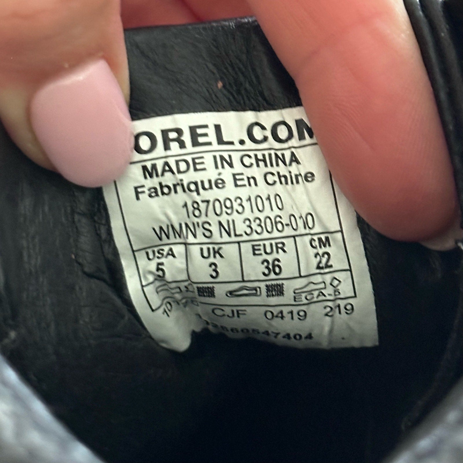 Details: Sorel Blake Lace Up Block Heel Leather Bootie - Size: 5- Color: Black/Brown- Material: Leather- Features: Lace up closure, block heel, round toe, rubber outsole, logo, comfort, outdoor, casual.