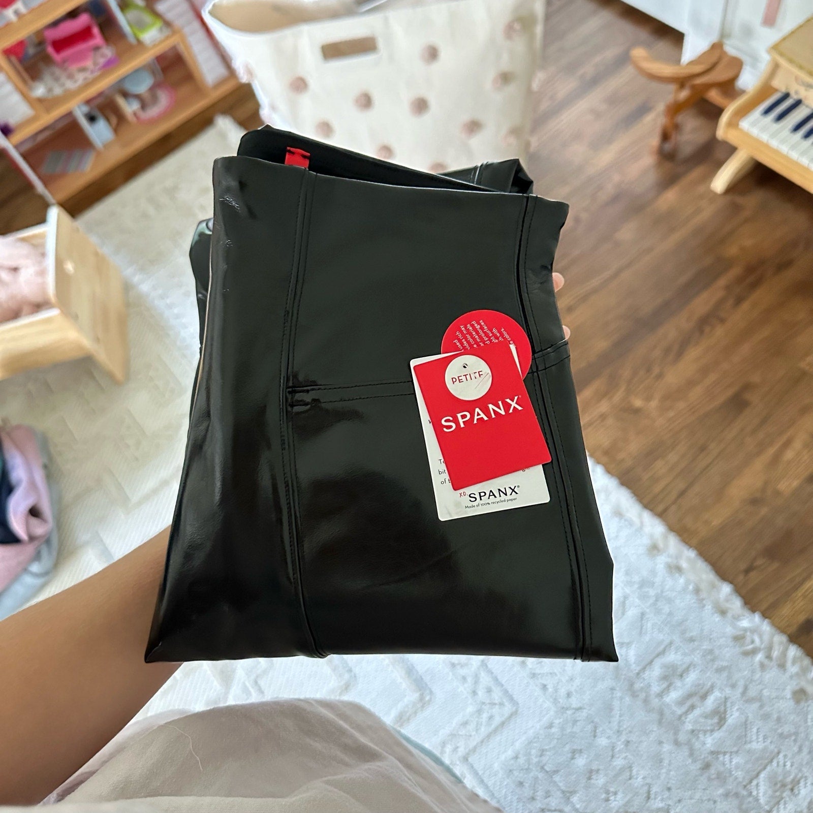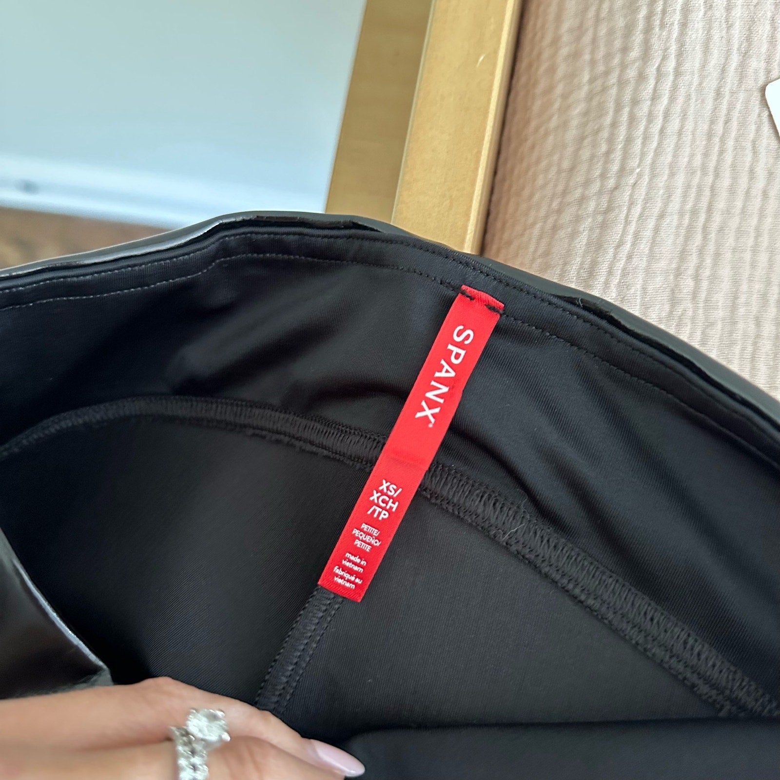 Details: Spanx Faux Patent Leather High Rise Pull On Leggings - Size: XS- Color: Black- Material: 94% Polyester, 6% Elastane- Features: Faux patent leather, high rise waist, pull on, elastic waist, stretch, machine wash, comfort, breathable, casual.