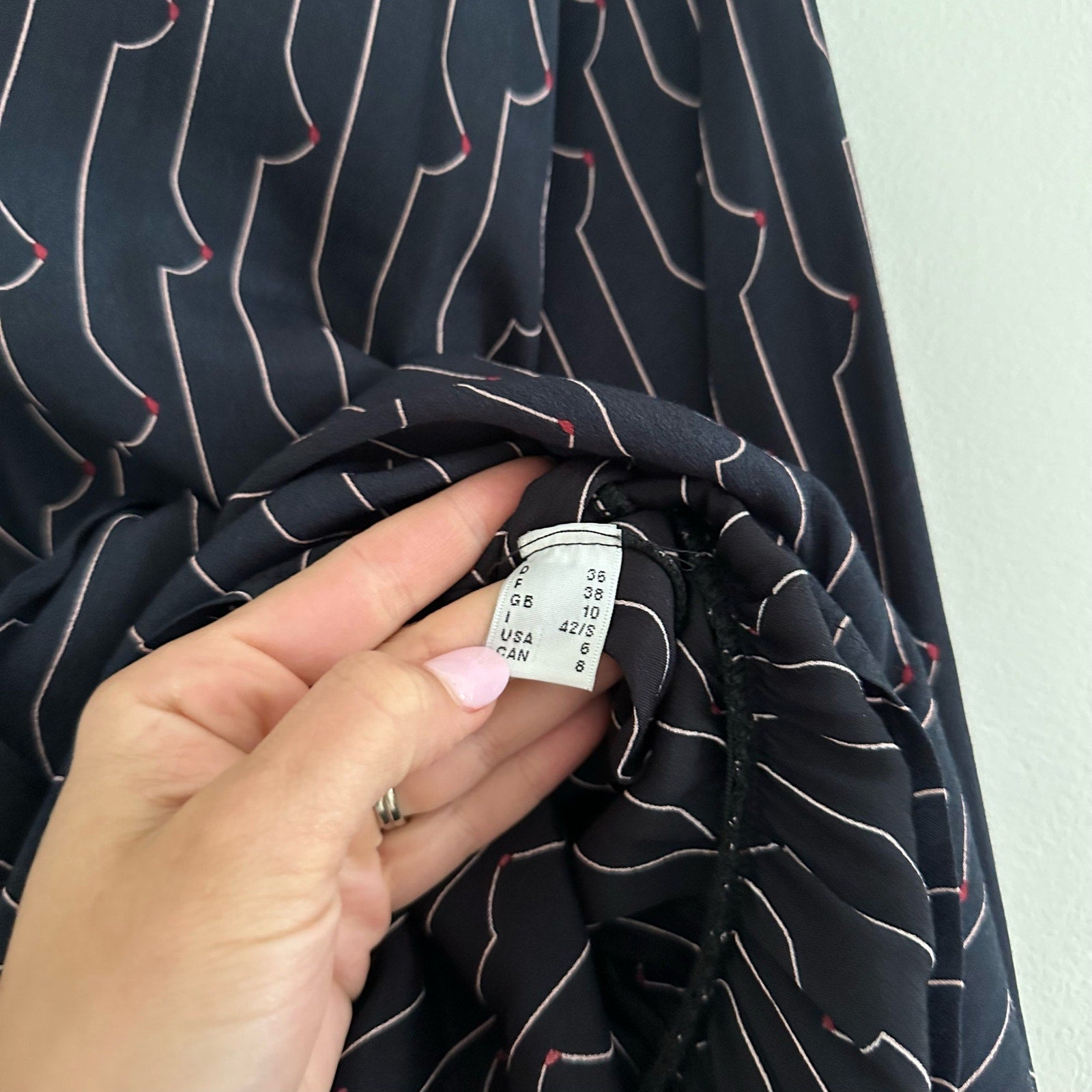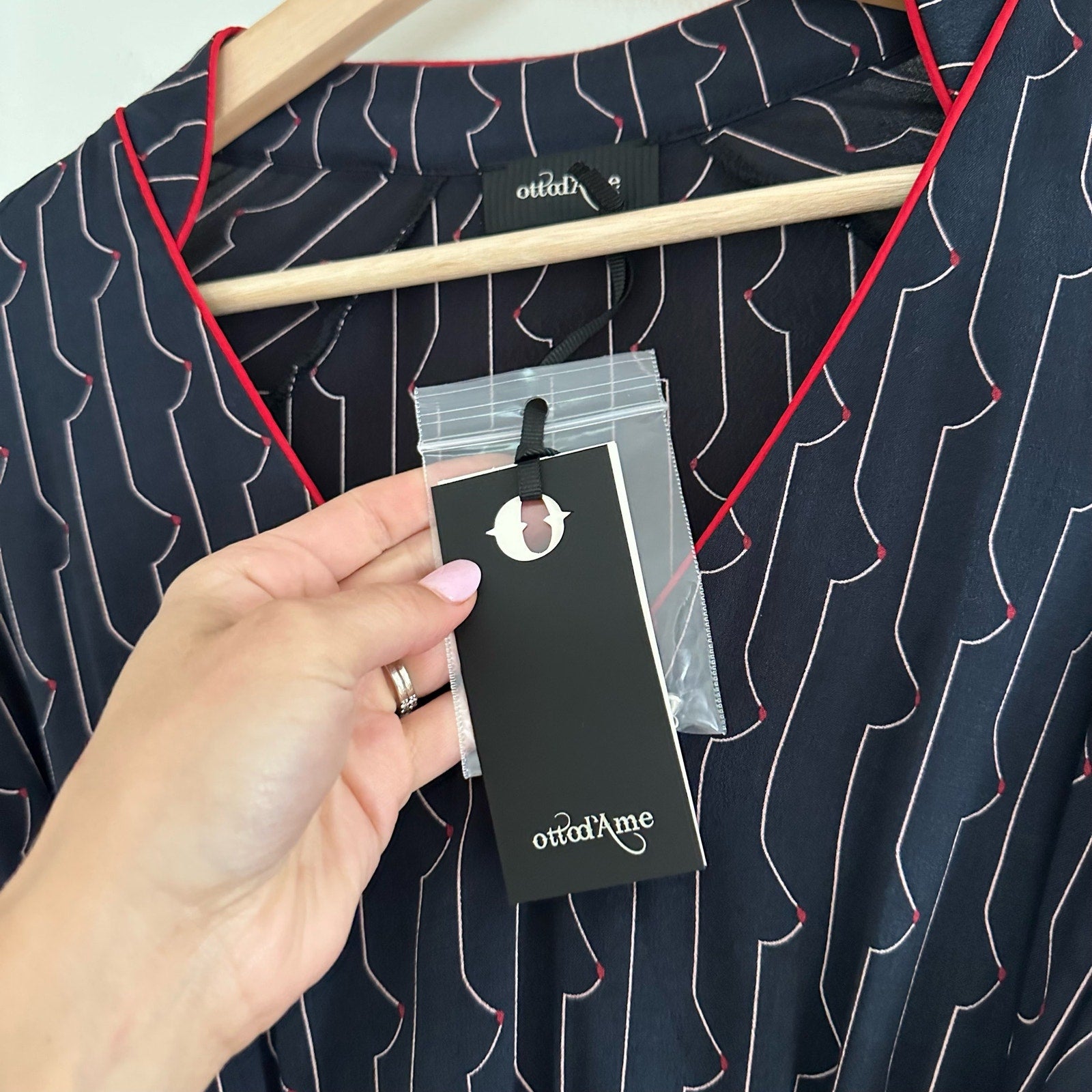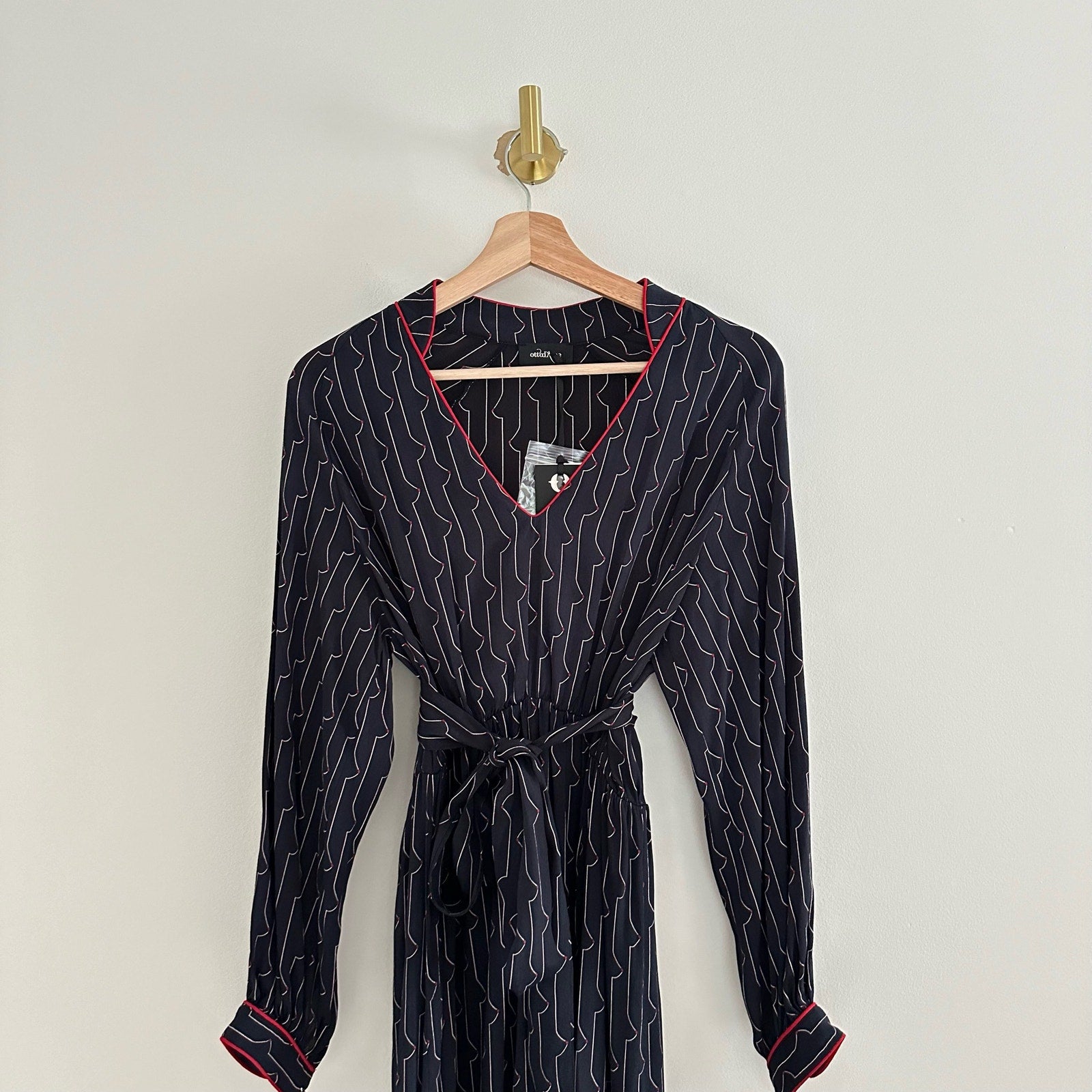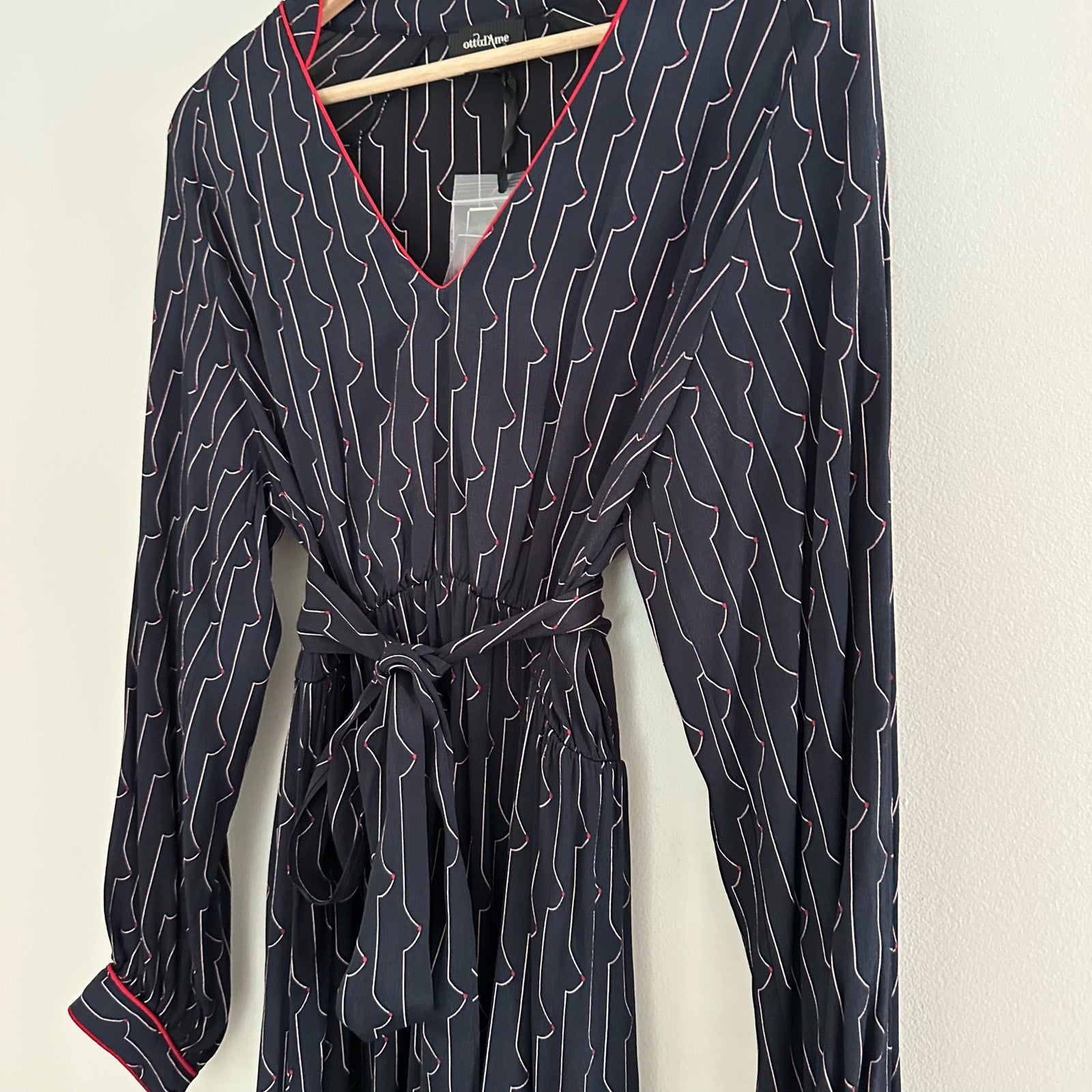 Details: OTTOD'AME Patterned Long Sleeve V-Neck Casual Midi Dress- Size: 6- Color: Midnight Blue- Features: Patterned, long sleeve, V-neck, pullover, midi length, button sleeve, belted, comfort, breathable, casual. crepe, no appliqués, multicolor pattern, mandarin collar, long sleeves, multipockets, buttoned cuffs, front closure, button closing, fully lined