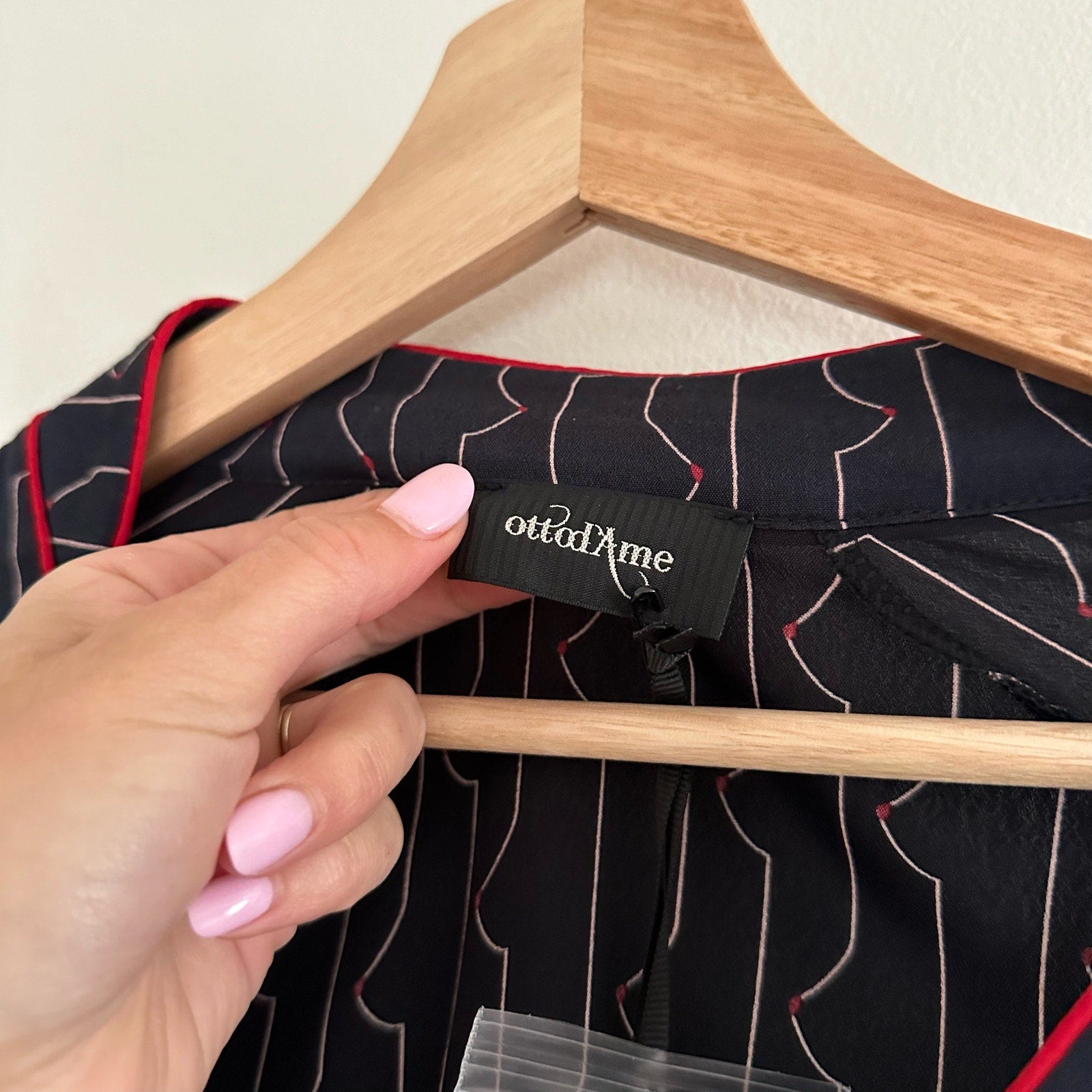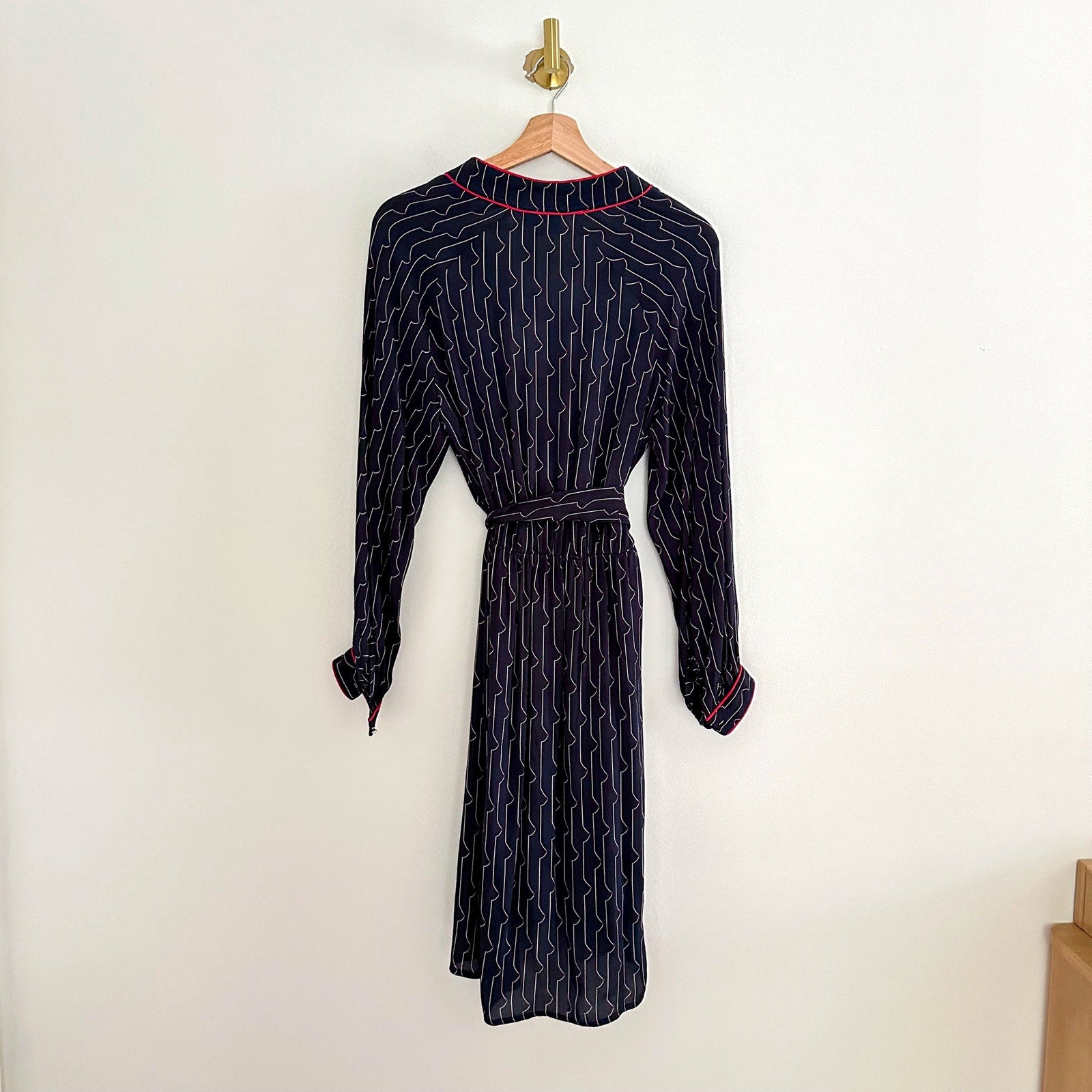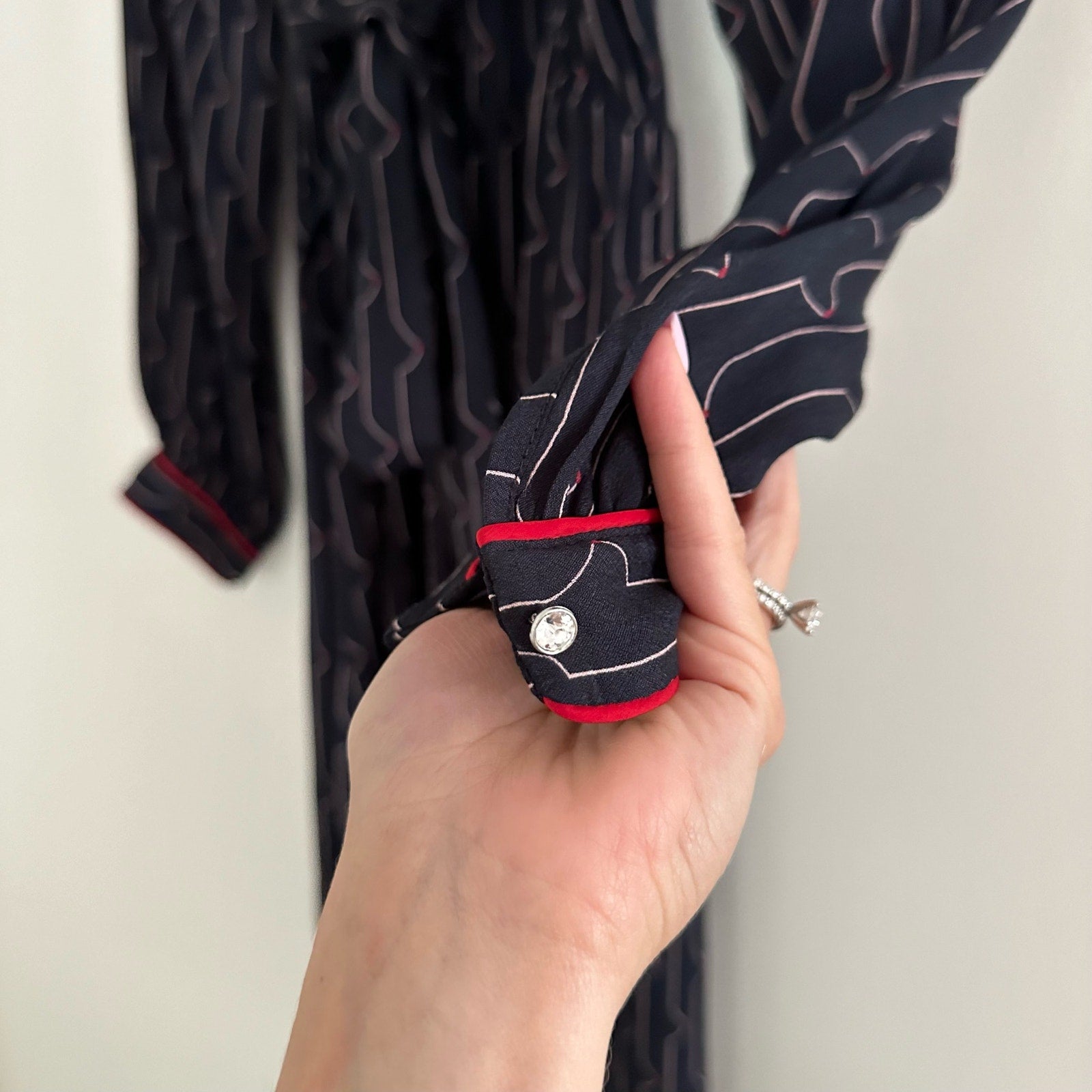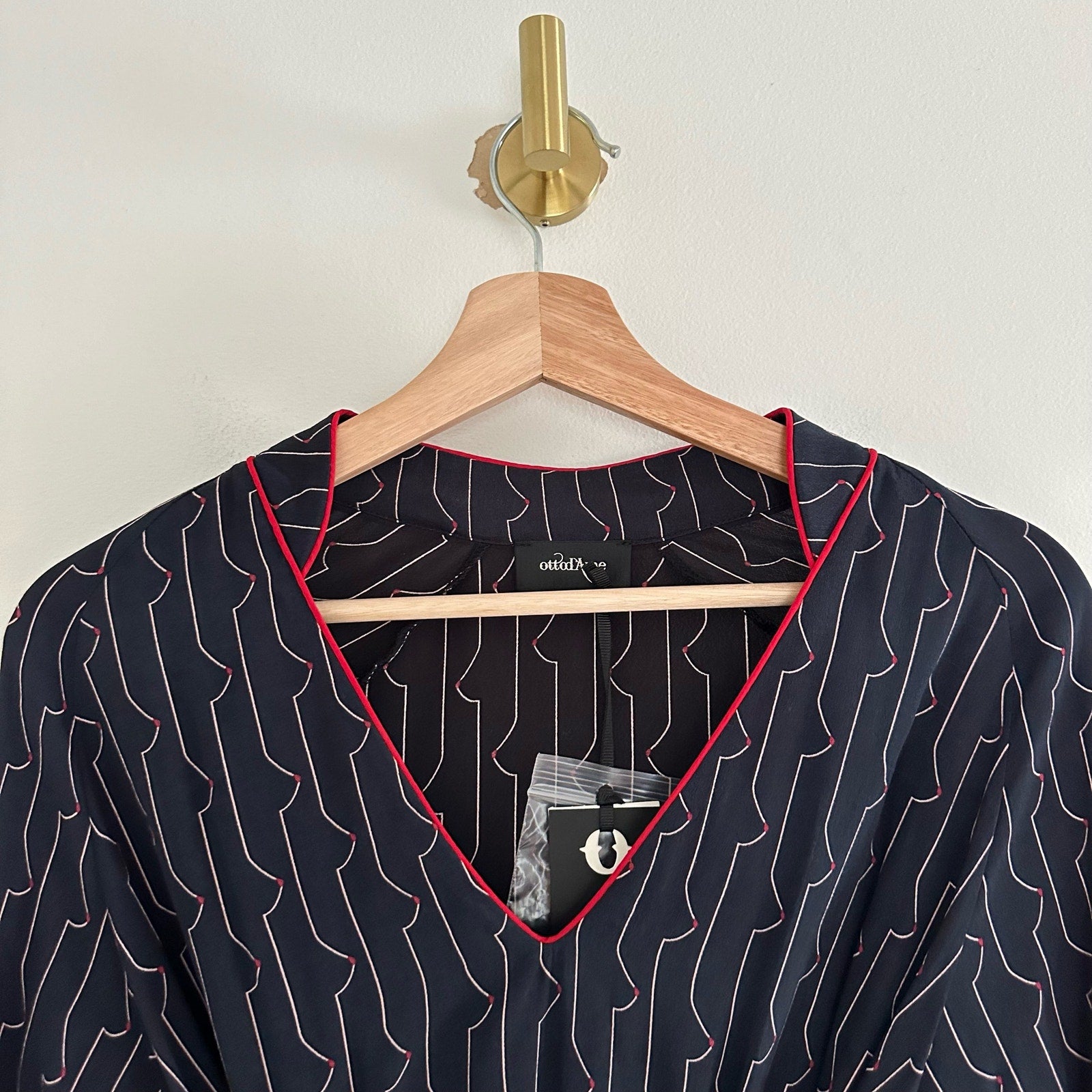 Details: OTTOD'AME Patterned Long Sleeve V-Neck Casual Midi Dress- Size: 6- Color: Midnight Blue- Features: Patterned, long sleeve, V-neck, pullover, midi length, button sleeve, belted, comfort, breathable, casual. crepe, no appliqués, multicolor pattern, mandarin collar, long sleeves, multipockets, buttoned cuffs, front closure, button closing, fully lined