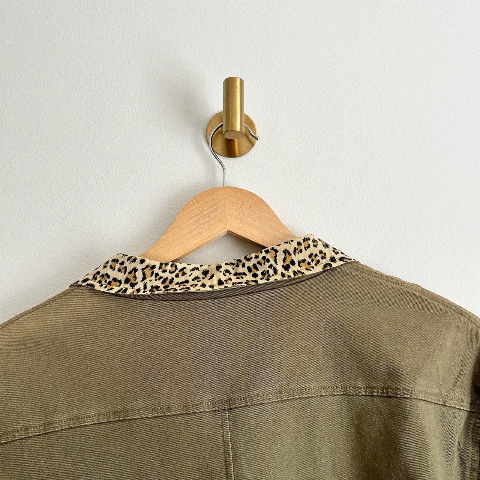 Details: Peyton Jensen Leopard Print Button Front Safari Military Jacket - Size: S- Color: Green- Material: 97% Cotton, 3% Spandex- Features: Leopard print lining, button closure, long sleeve, pockets, leopard print lining, hand wash collared, everyday, basic, comfort, breathable, casual. Leopard print lining