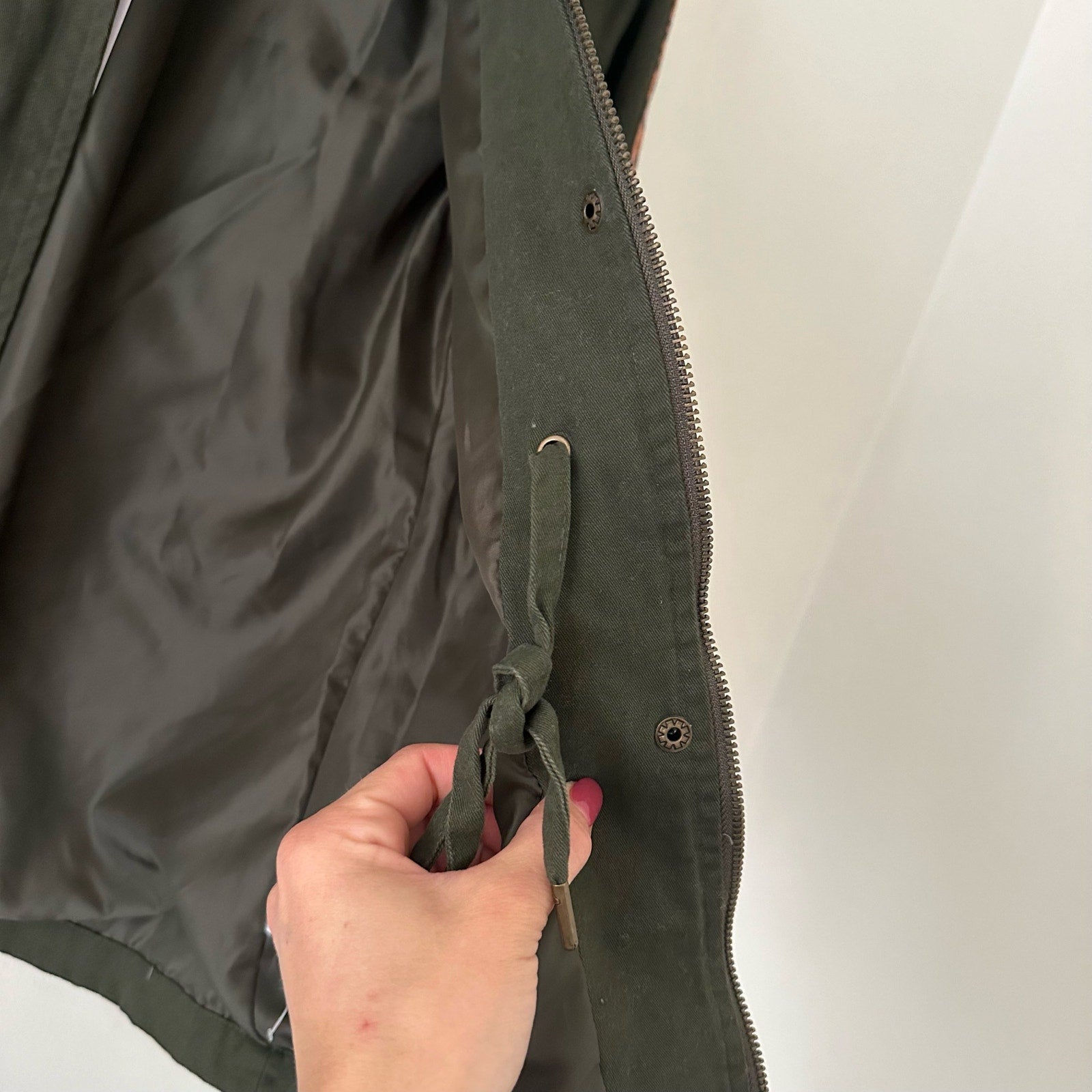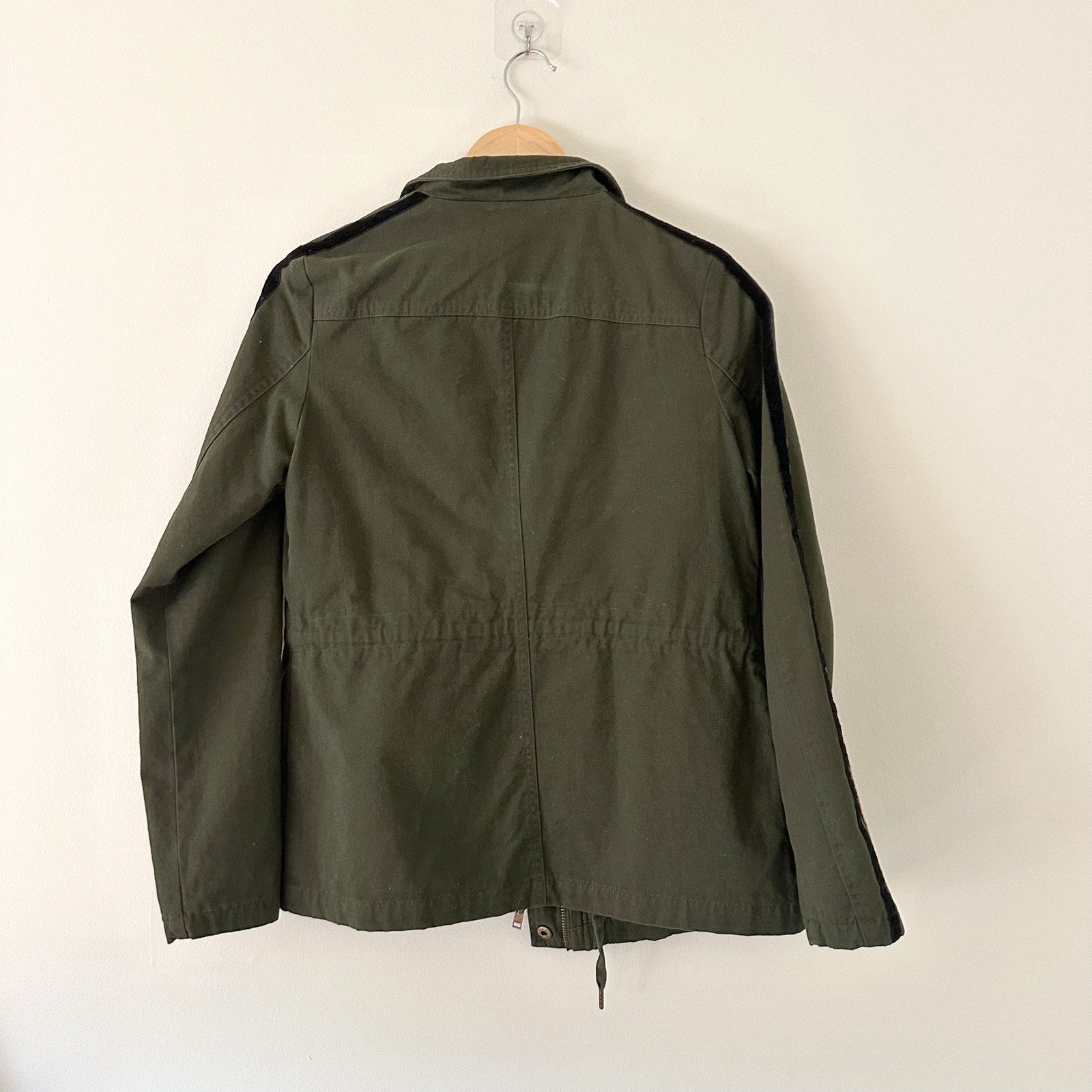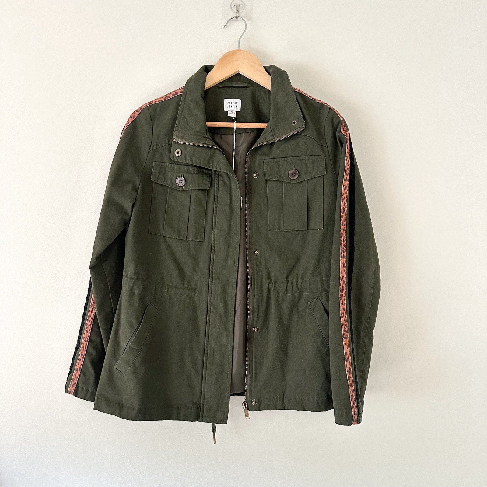 Details: Peyton Jensen x Evereve Animal Print Sleeve Utility Jacket - Size: S- Color: Green- Material: 100% Cotton- Features: Animal print on sleeve, zipper with button closure, lined, pockets, drawcord waist, machine wash, comfort, breathable, casual. PA019803HM