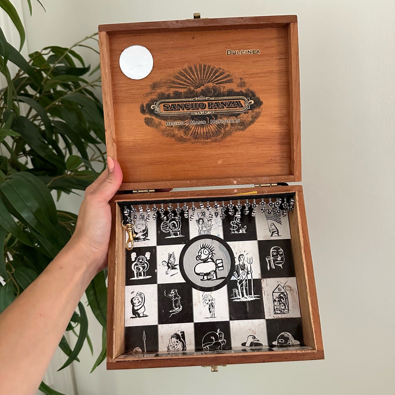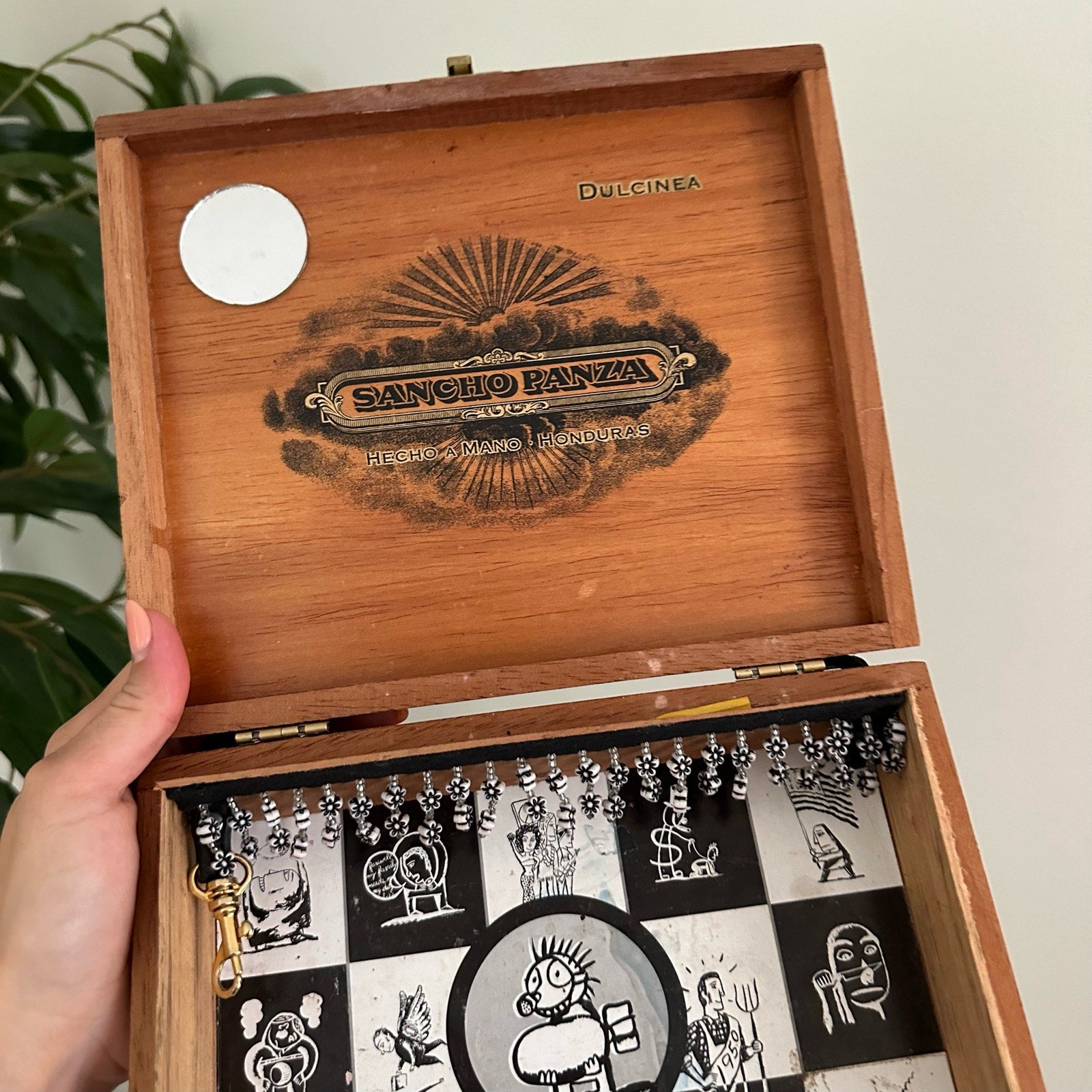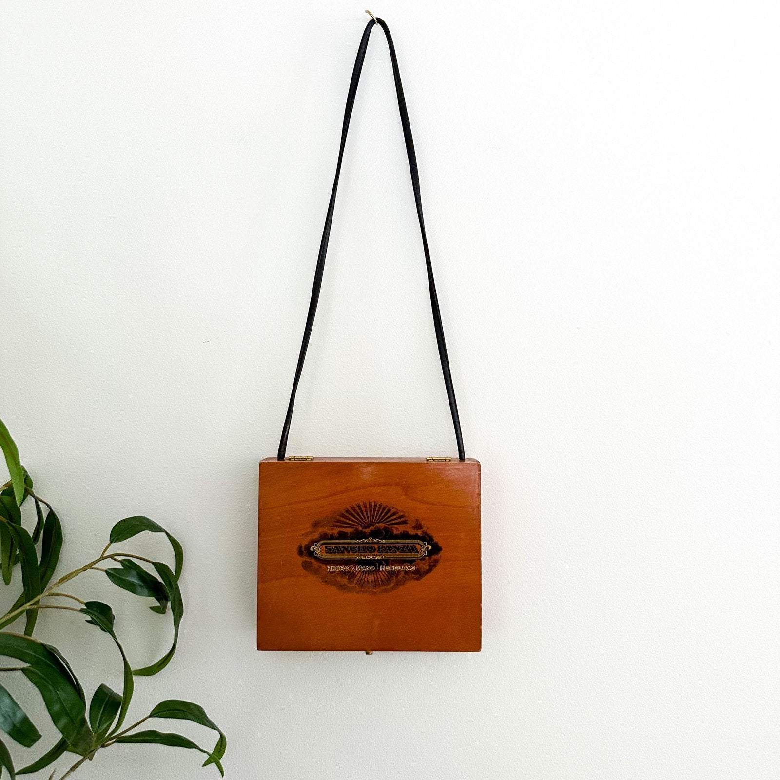 Details: Sancho Panza Wood Cigar Box With Leather Strap - Size: - Color: Brown- Material: Wood box, leather strap - Features: Clasp closure, long strap. Patterned details.