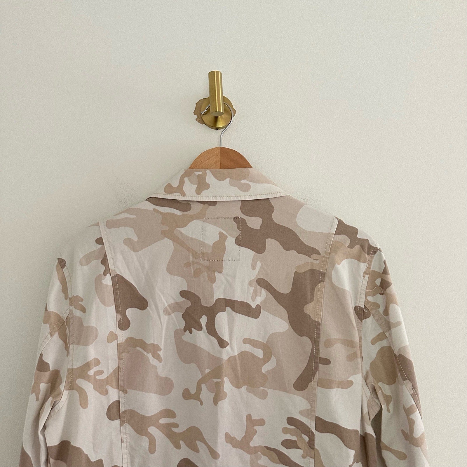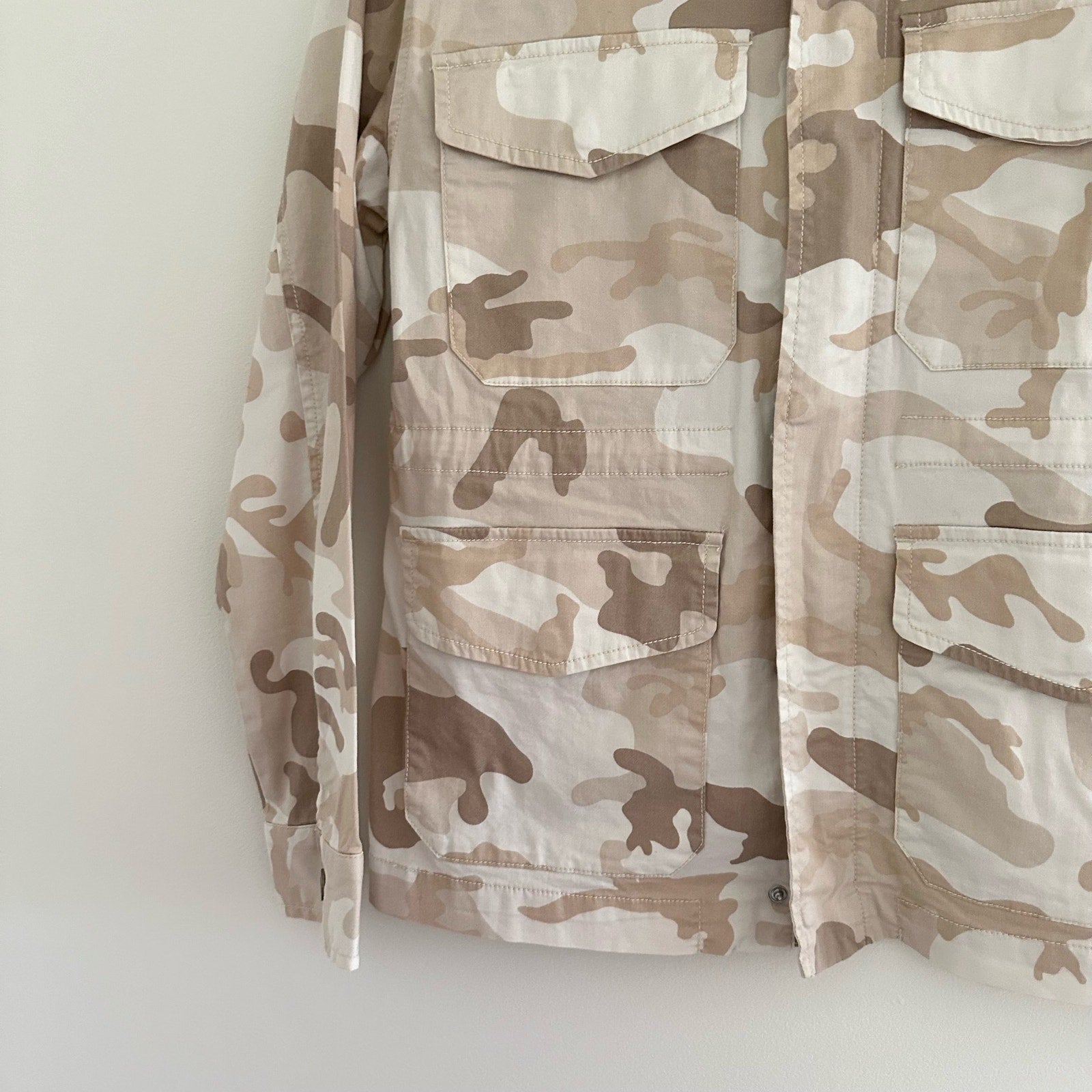 Details: Sanctuary Camouflage Snap Button Front Basic Jacket- Size: M- Color: Beige- Material: 97% Cotton, 3% Spandex- Features: Camouflage pattern, snap button closure, long sleeve, pockets, collared, machine wash, light wash, outdoor, comfort, breathable, casual. Adjustable drawcord waist from inside of jacket.