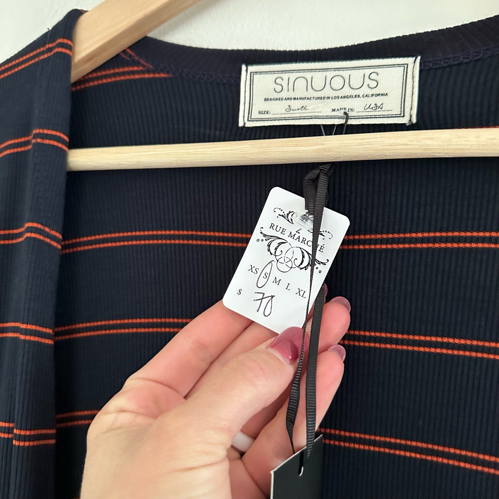 Details: Sinuous Striped Open Front Mid Length Side Slits Cardigan - Size: S- Color: Navy Blue/Red- Material: 86% Rayon, 8% Polyester, 6% Spandex- Features: Striped pattern, open front, long sleeve, hand wash, side slits, raglan sleeve, ribbed, comfort, breathable, casual.