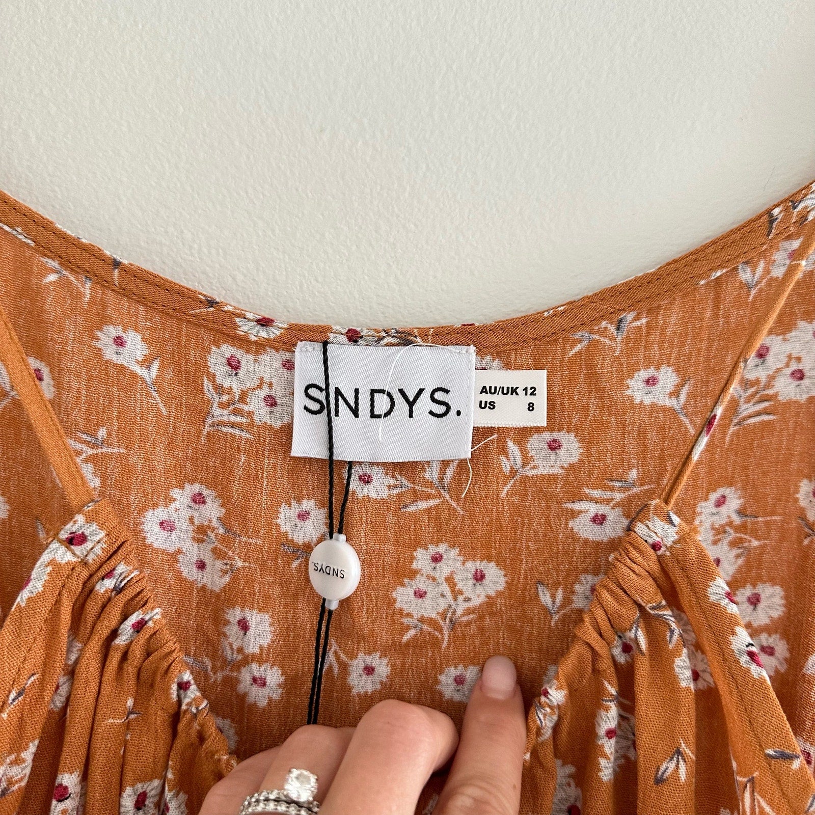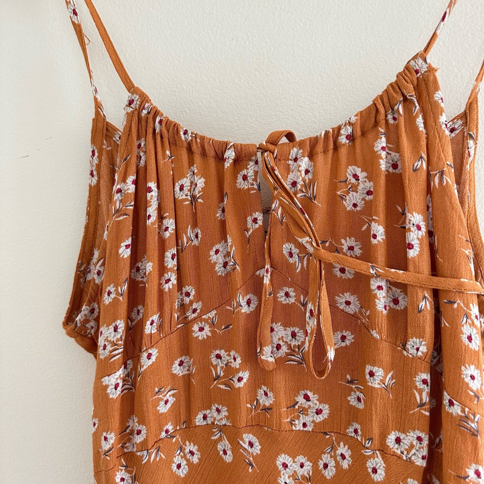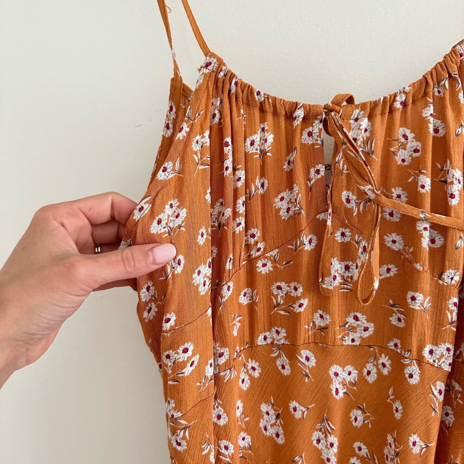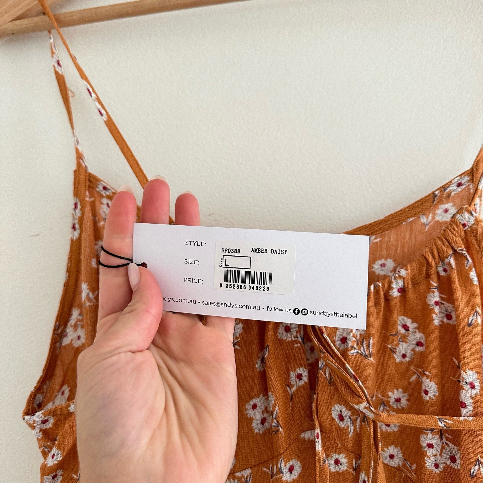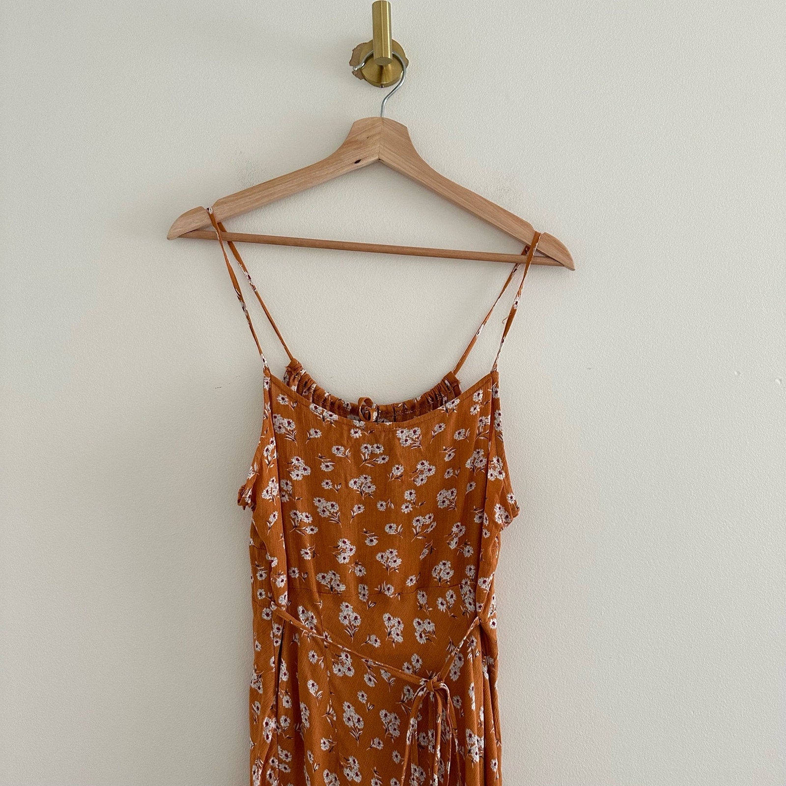 Details: SNDYS. Honolulu Sleeveless Floral Print Midi Dress - Size: L- Color: Amber Daisy Orange/Brown - Features: Sleeveless, floral print, chiffon fabric, lightweight, spaghetti strap, keyhole neck, round neck, sheer, lightweight, comfort, breathable, casual. SFD388. 100% rayon. Made in China. Hand wash. Unlined. Hidden side zipper closure. Attached waist and back tie closure. Lightweight crepe fabric. Revolve Style No. SDYS-WD32. Manufacturer Style No. SFD388.