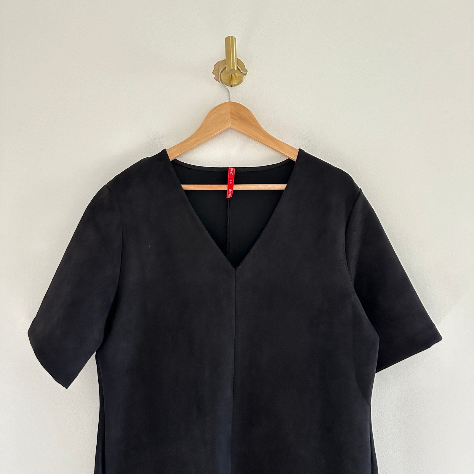XL- Color: Black- Material: 90% Polyester, 10% Elastane- Features: V-neck, pullover, short sleeve, faux suede, mini length, shift styling, comfort, casual.