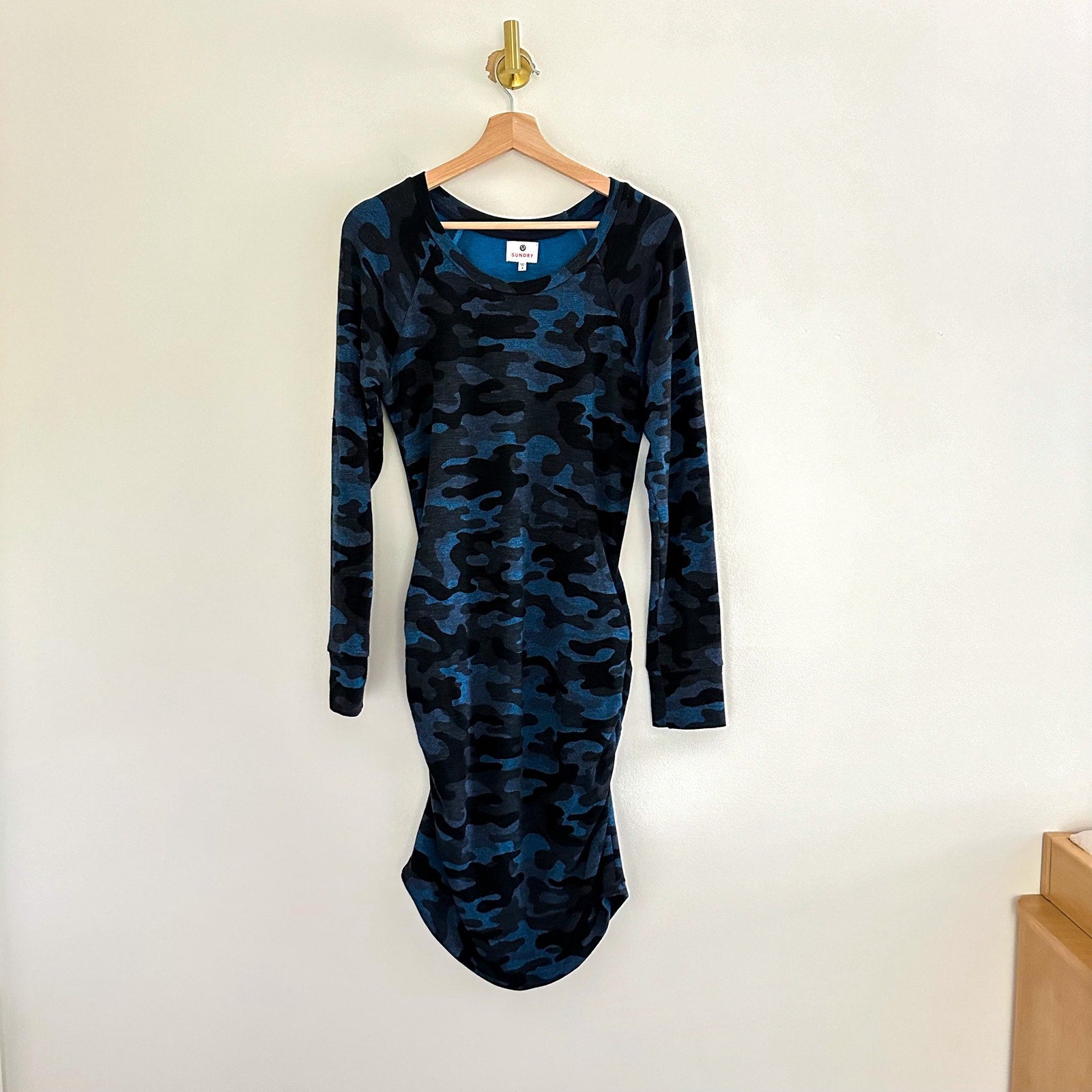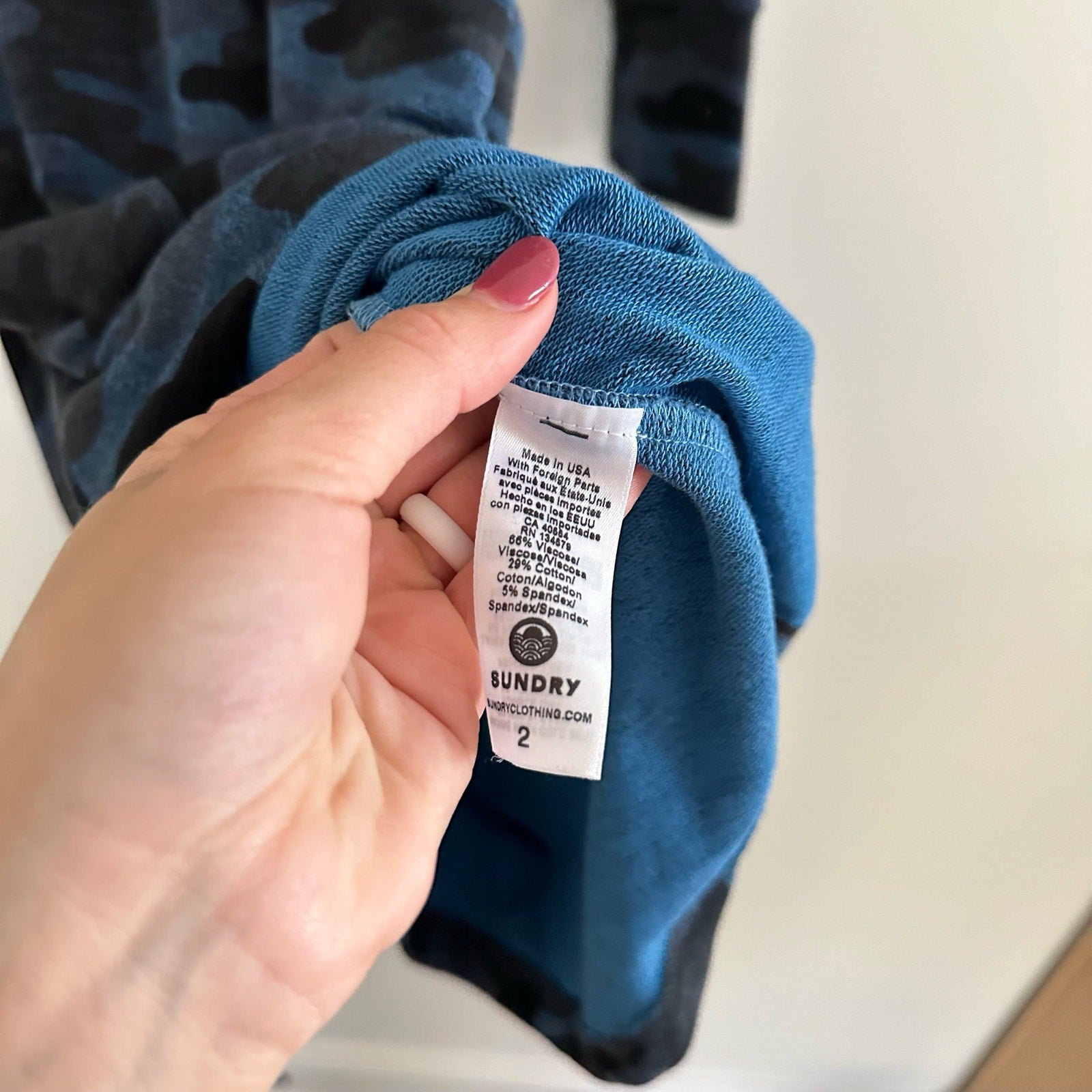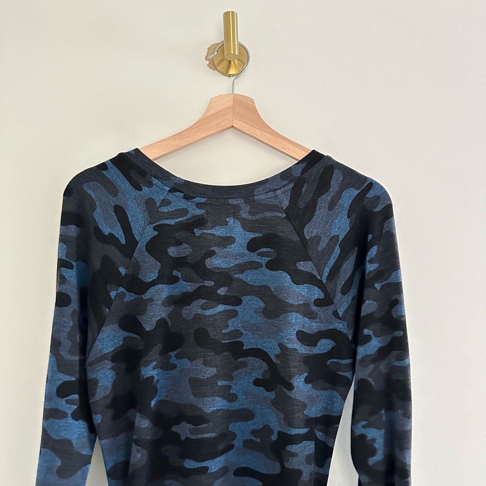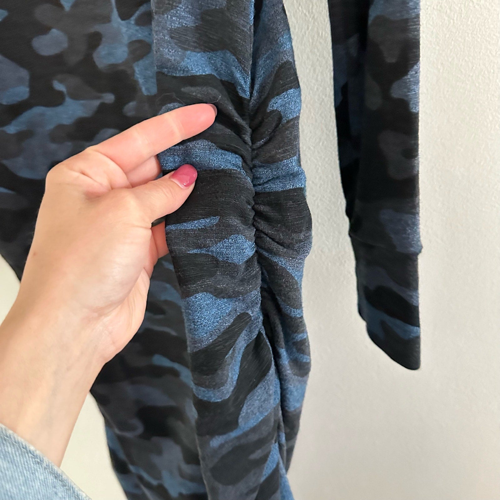 Details: Sundry x Evereve Camo Print 3/4 Sleeve Knee Length Round Neck Sweater Dress- Size: 2 (M) - Color: Blue/Black- Material: 66% Viscose, 29% Cotton, 5% Spandex- Features: Camo print, 3/4 sleeve, raglan sleeve, knee length, round neck, pullover, stretch, ruched side, bodycon, comfort, breathable, casual.