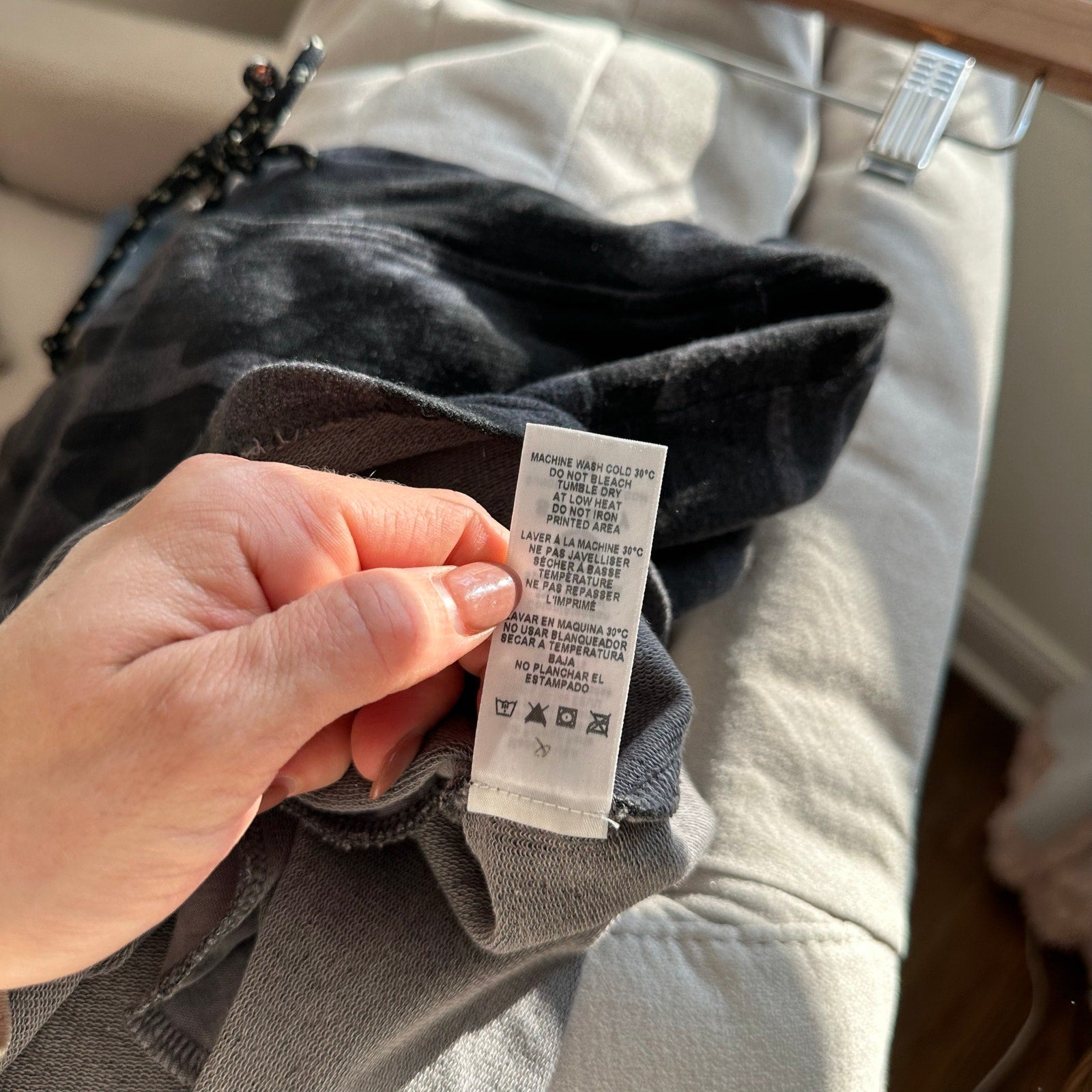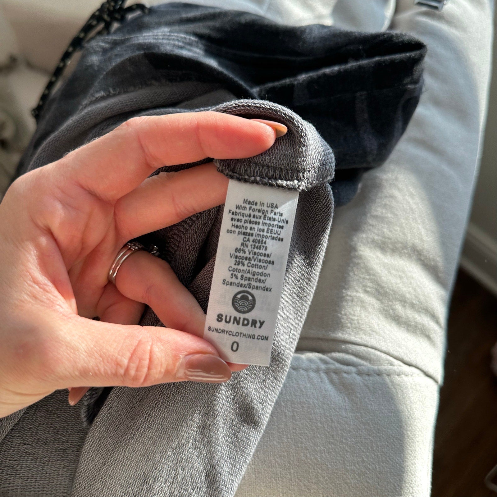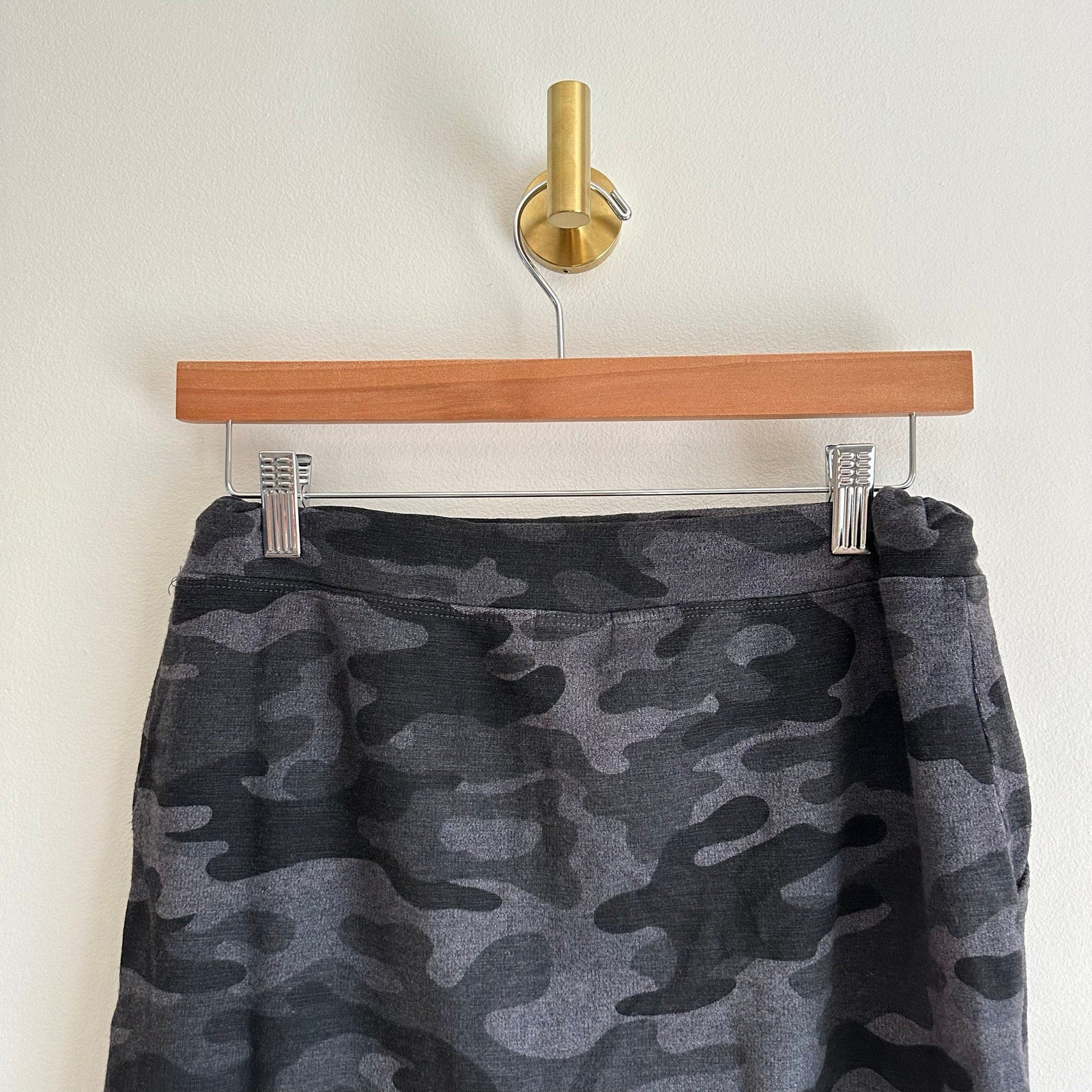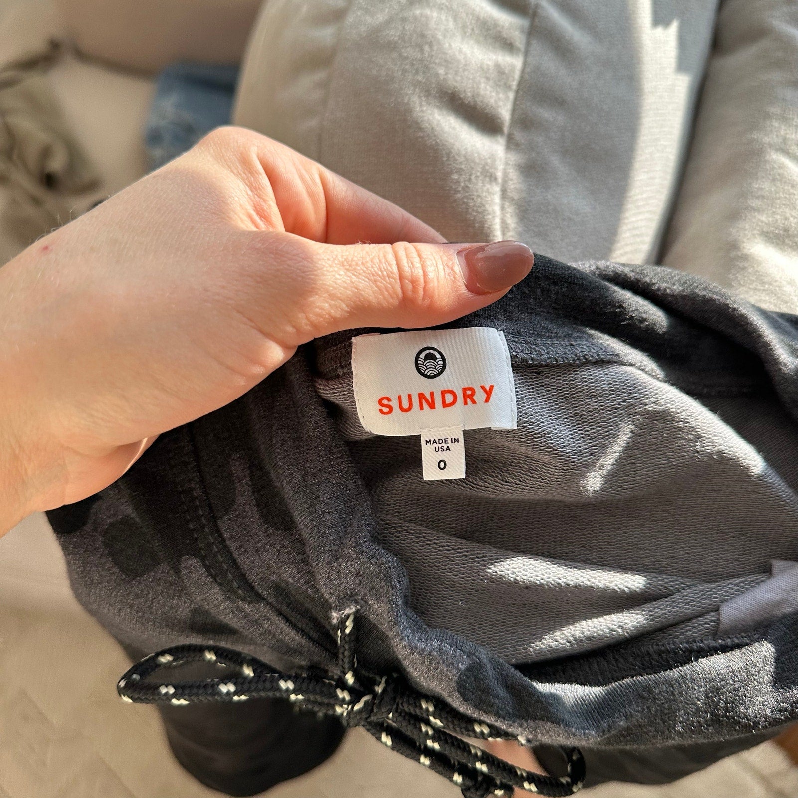 Details: Sundry Camo Print Drawcord Mid Rise Waist Mini Skirt - Size: 0 (XS) - Color: Gray - Material: 66% Viscose, 29% Cotton, 5% Spandex- Features: Camo print, drawcord waist, mid rise waist, pockets, stretch, machine wash, curvy hem, comfort, casual.