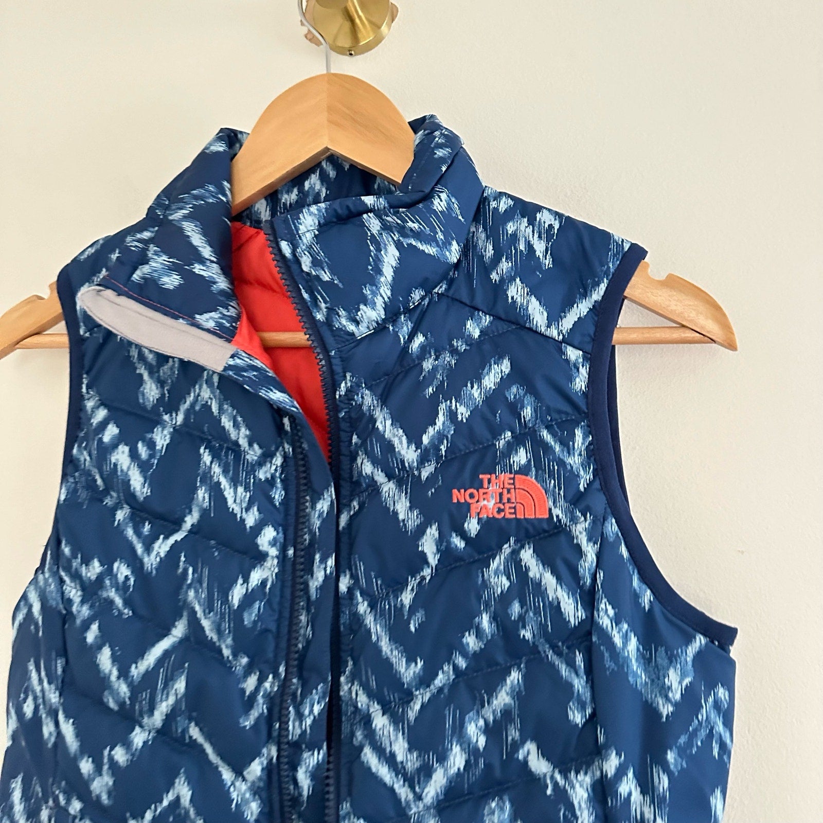Details: The North Face Flare Down Patterned Zip Up Mock Neck Puffer Vest - Size: XS- Color: Blue- Material: 100% Polyester- Features: Zipper closure, mock neck, embroidered, logo, lined, insulated, zip pockets, comfort, breathable, outdoor, casual.