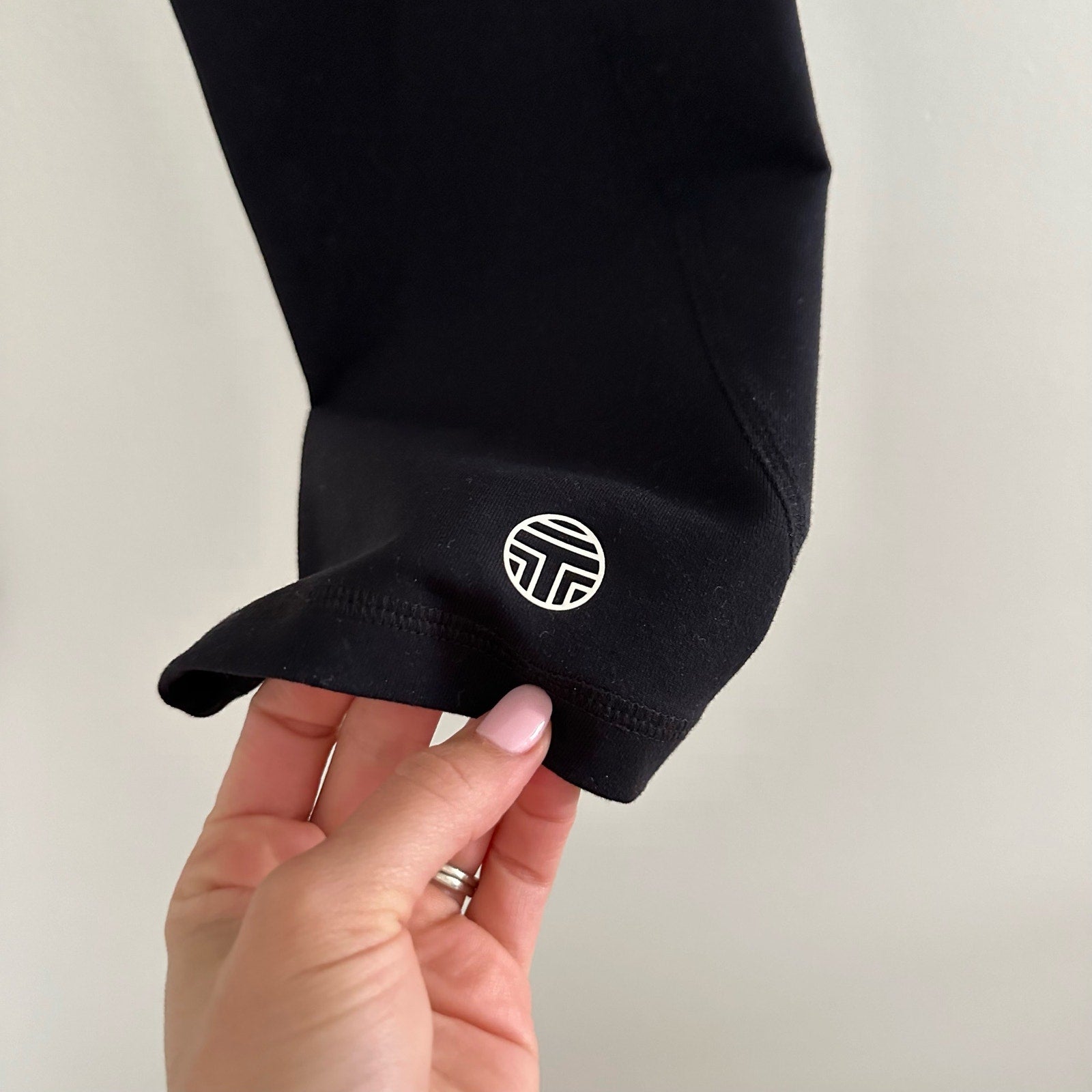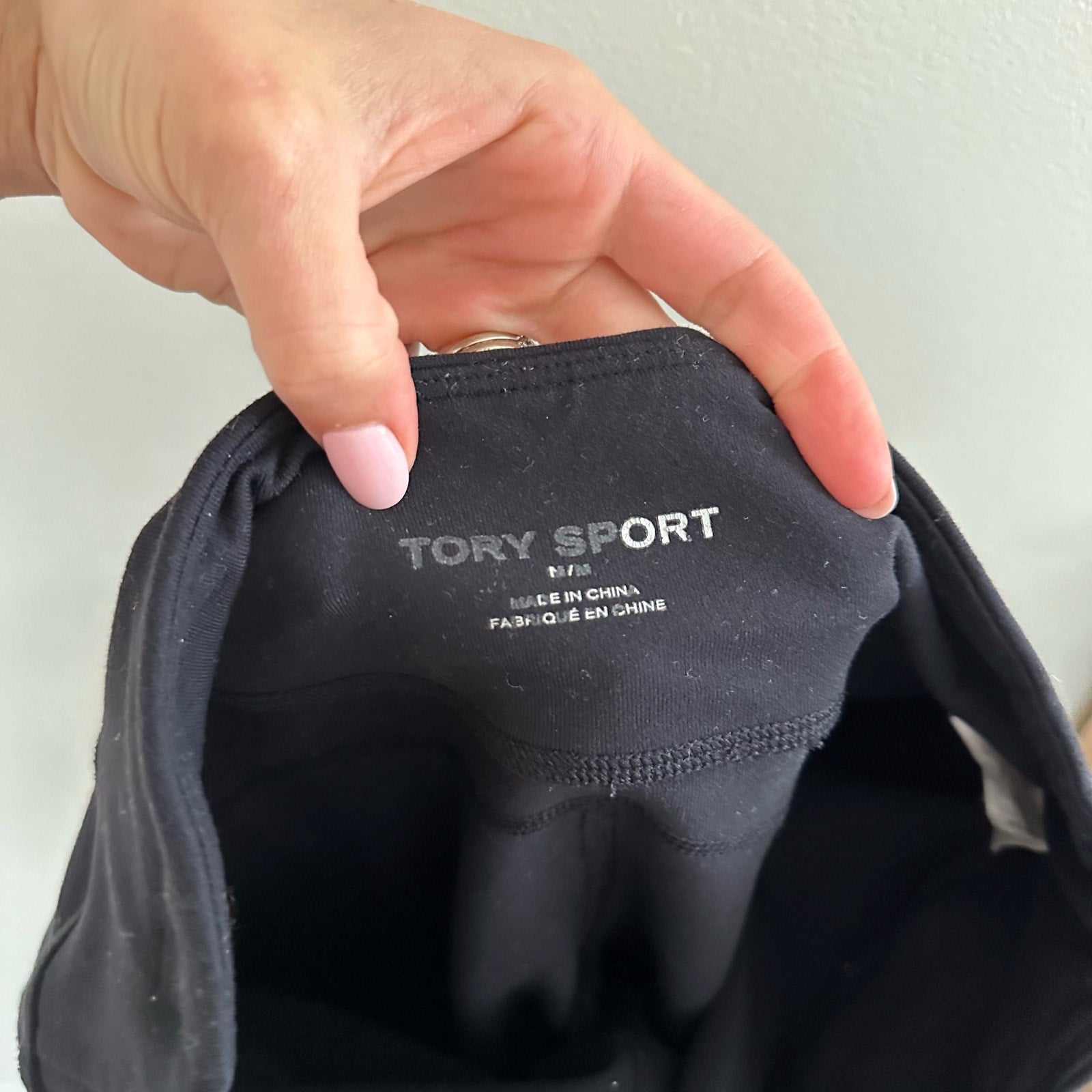 Details: Tory Sport Cropped Pull On Mid Rise Activewear Leggings - Size: M- Color: Black- Material: 81% Supplex Nylon, 19% Lycra Spandex- Features: Cropped, pull on, mid rise waist, solid pattern, logo, wide waistband, machine wash, elastic waist, comfort, breathable, casual, activewear.
