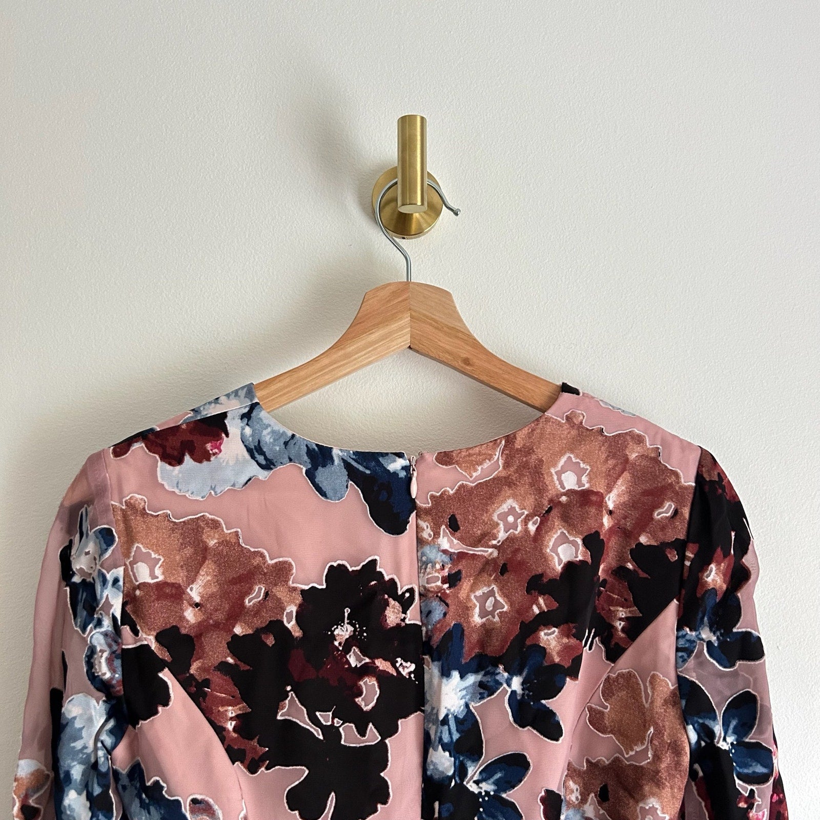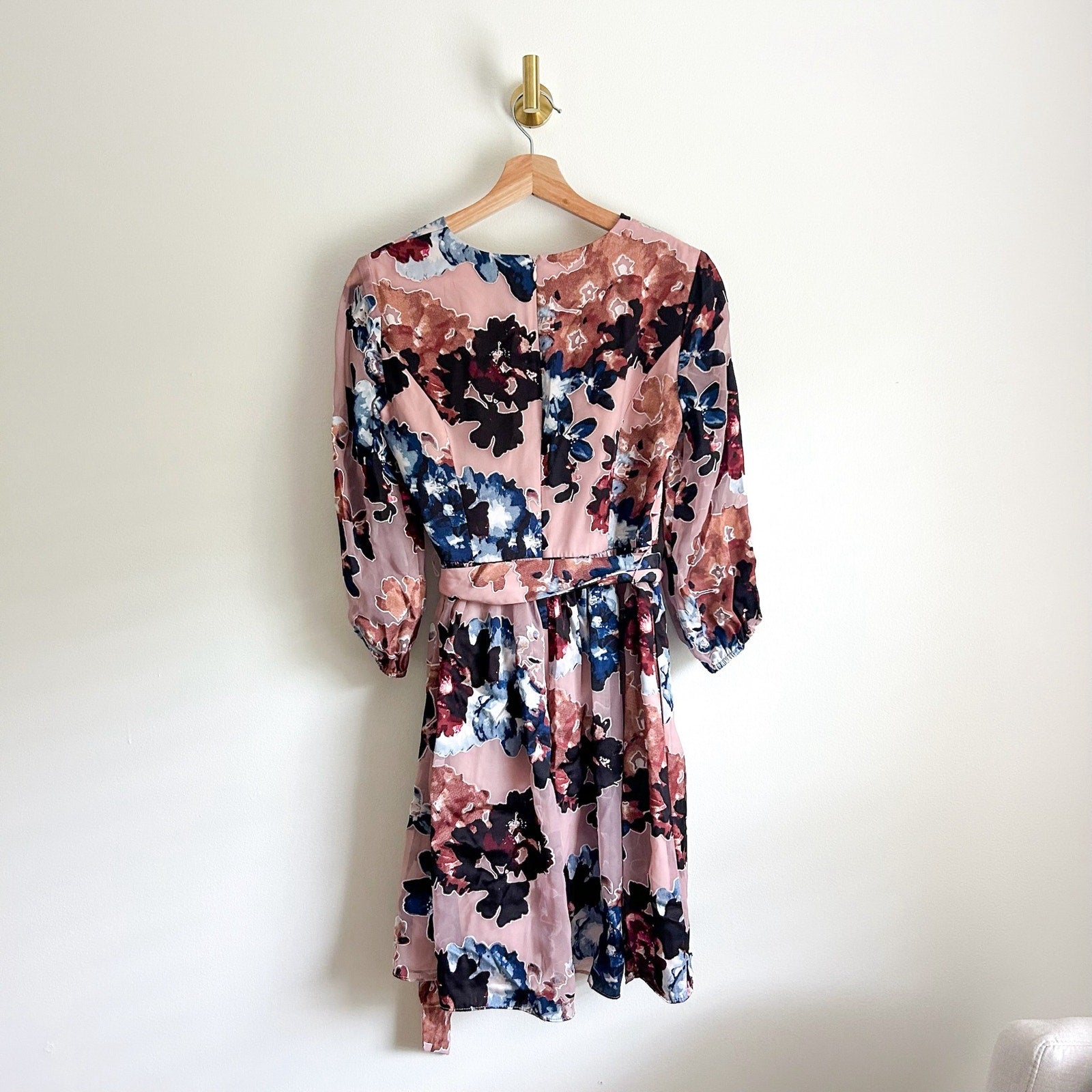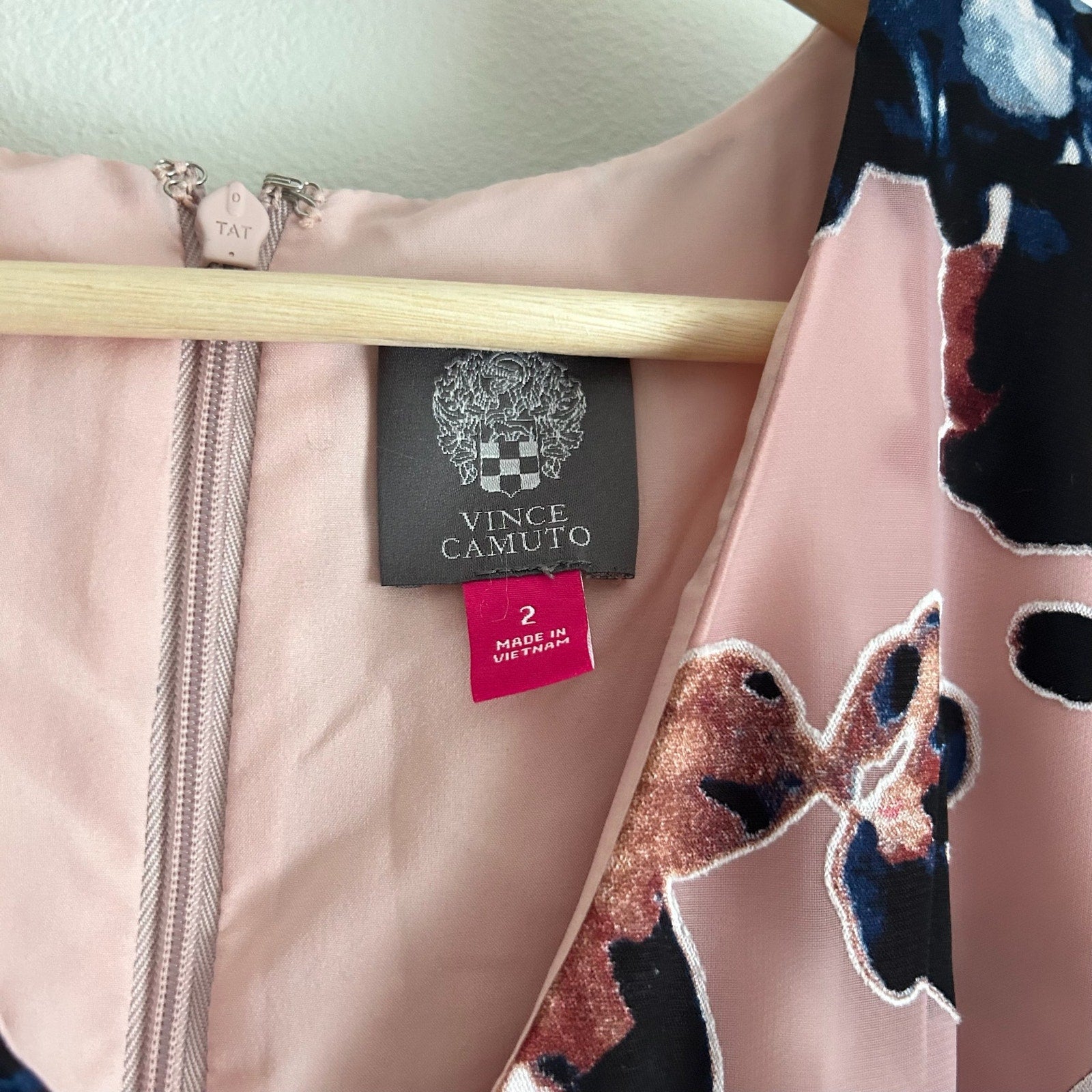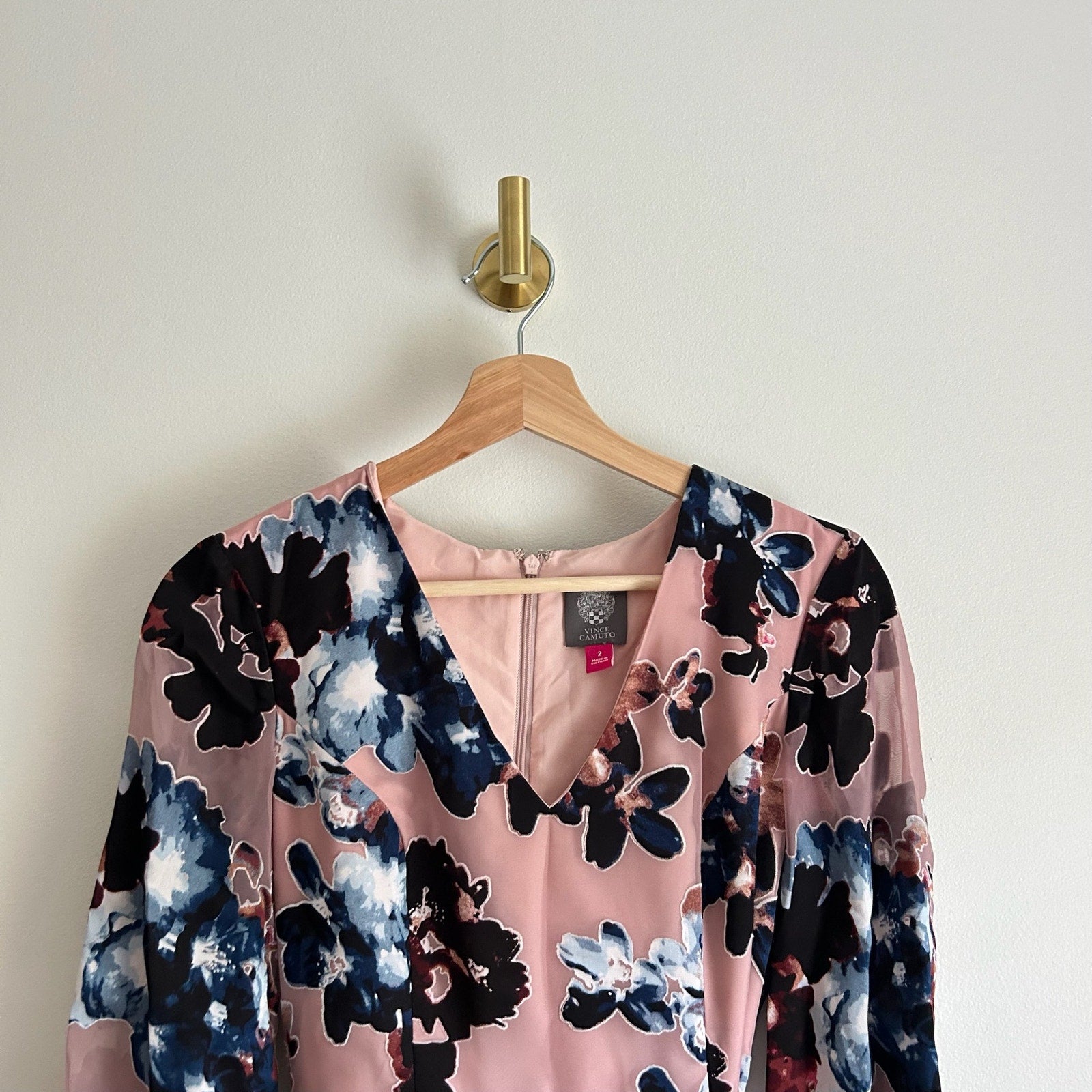 Details: Vince Camuto Floral Pattern V-Neck Long Sleeve Mini Dress - Size: 2- Color: Pink, Navy - Features: Floral pattern, V-neck, long sleeve, mini length, belted, belt loops, zipper closure, lined, elasticized cuffs, comfort, breathable, casual.