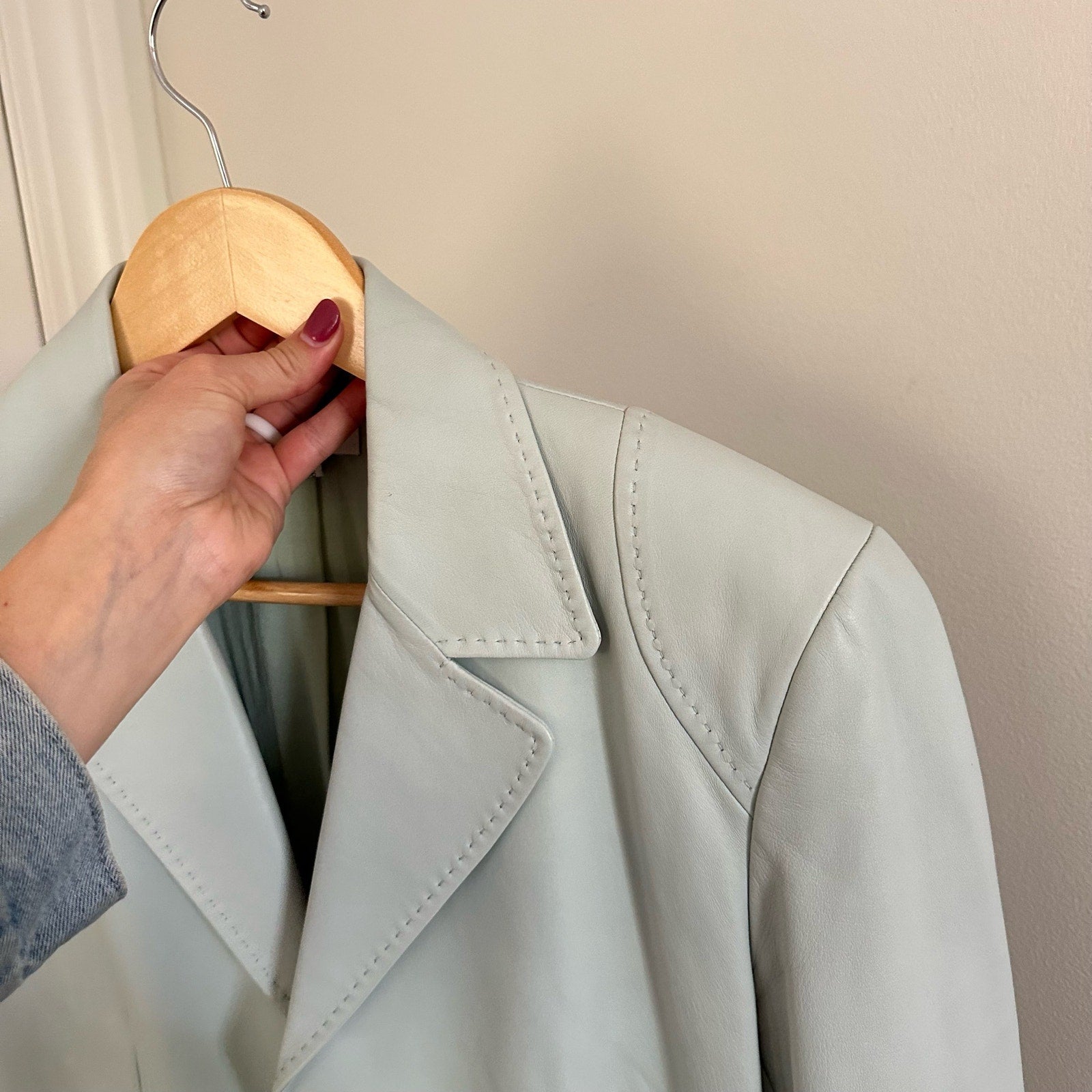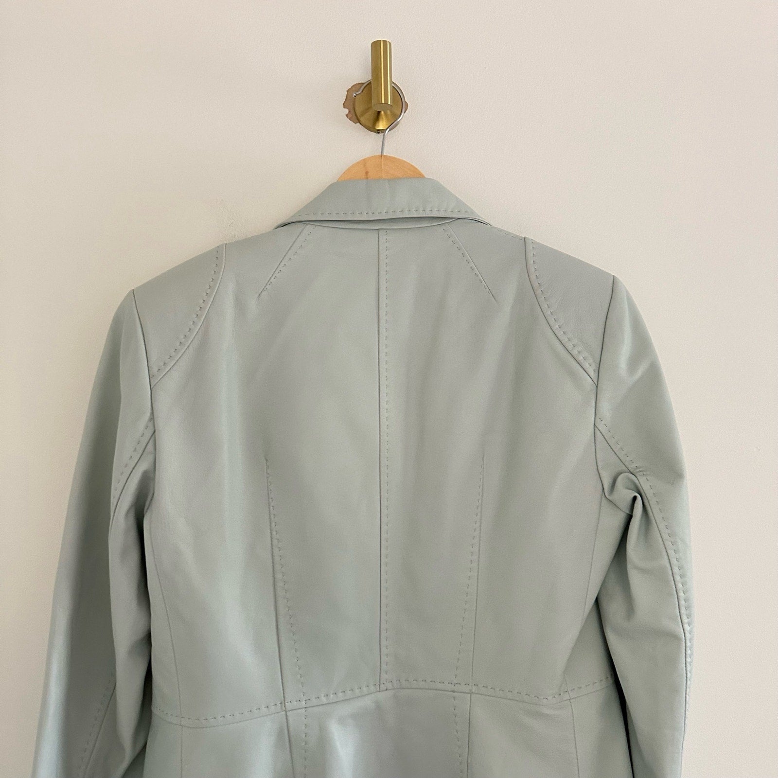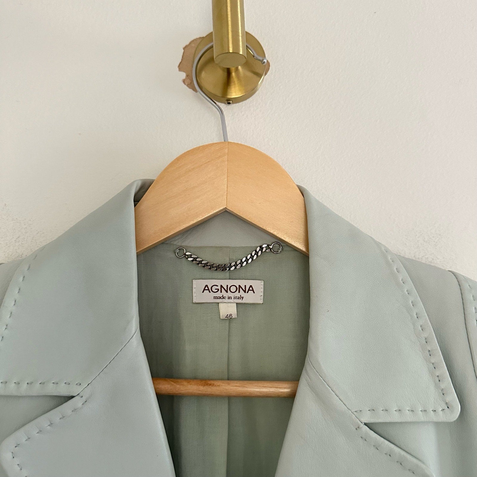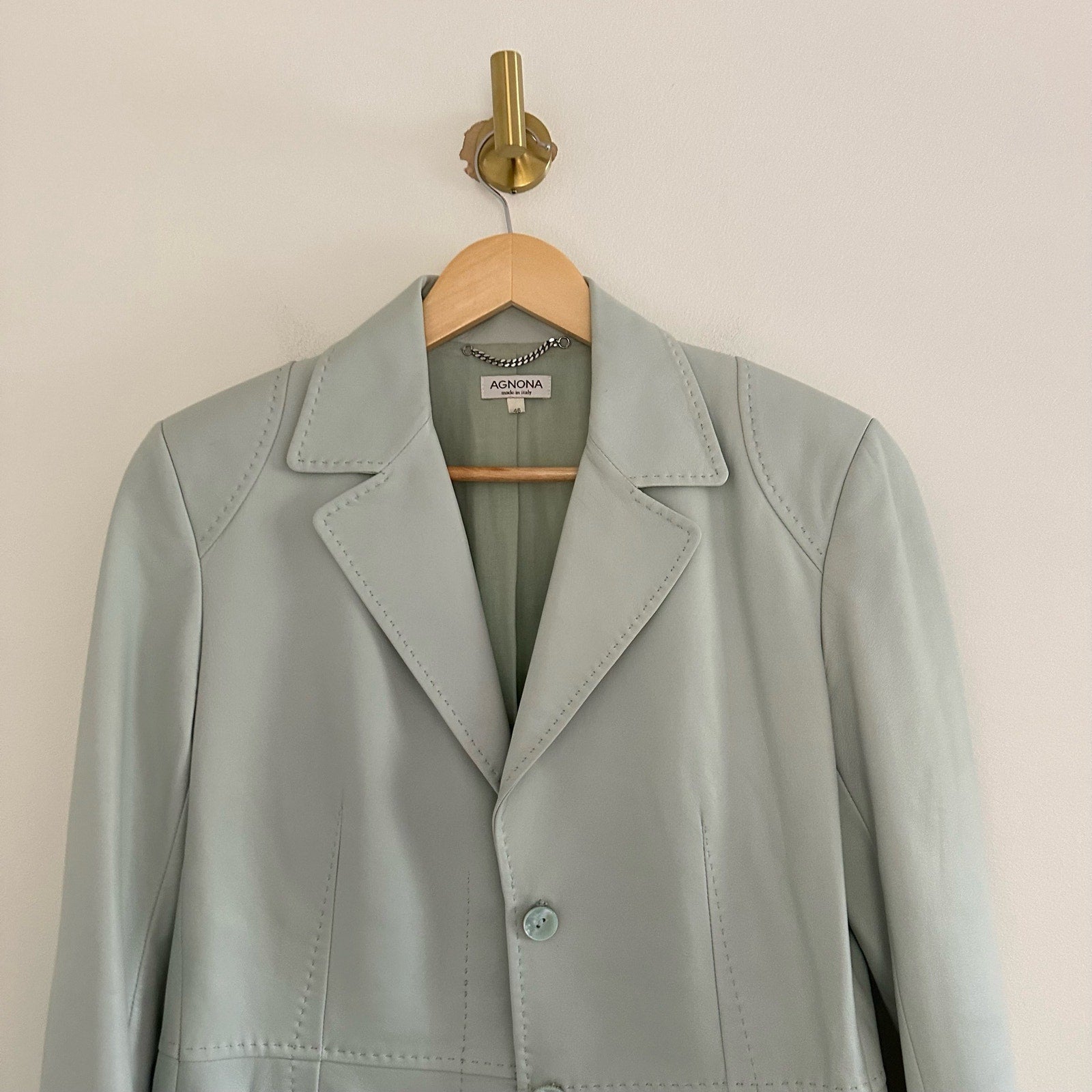 Details: Agnona Leather Single-Breasted Lined Blazer - Size: 46- Color: Pastel Sage Green - Material: Leather - Features: Single-breasted, lined, long sleeve, button closure, pockets.