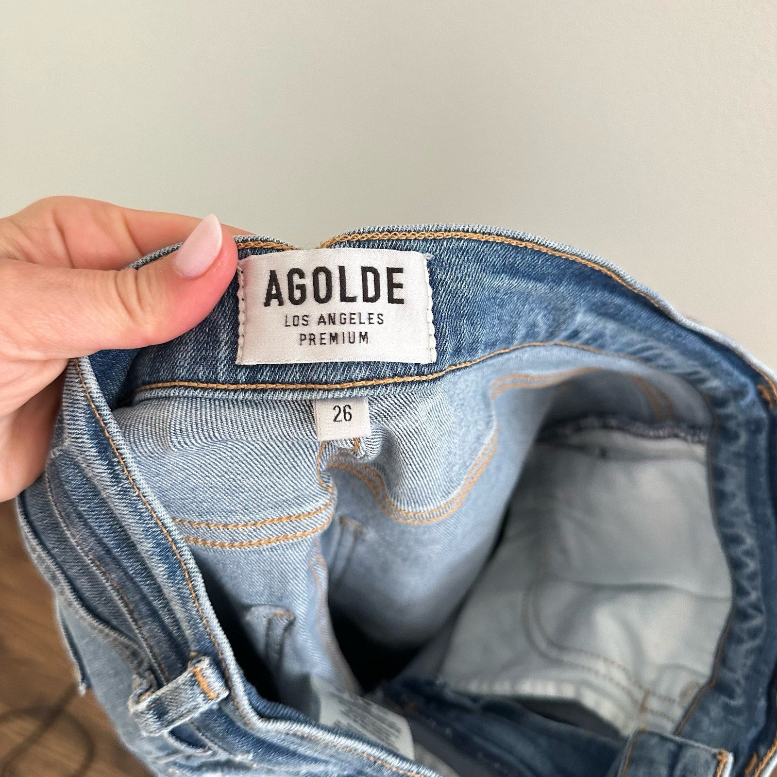 Details: AGOLDE Distressed High Rise Denim Medium Wash Skinny Jeans - Size: 26- Color: Blue- Material: 94% Cotton, 4% Polyester, 2% Elastane- Features: Distressed, high rise waist, denim, medium wash, zipper fly with button waist, 5-pocket styling, belt loops, logo, skinny leg, machine wash, comfort, breathable, casual. Stock image by AI.