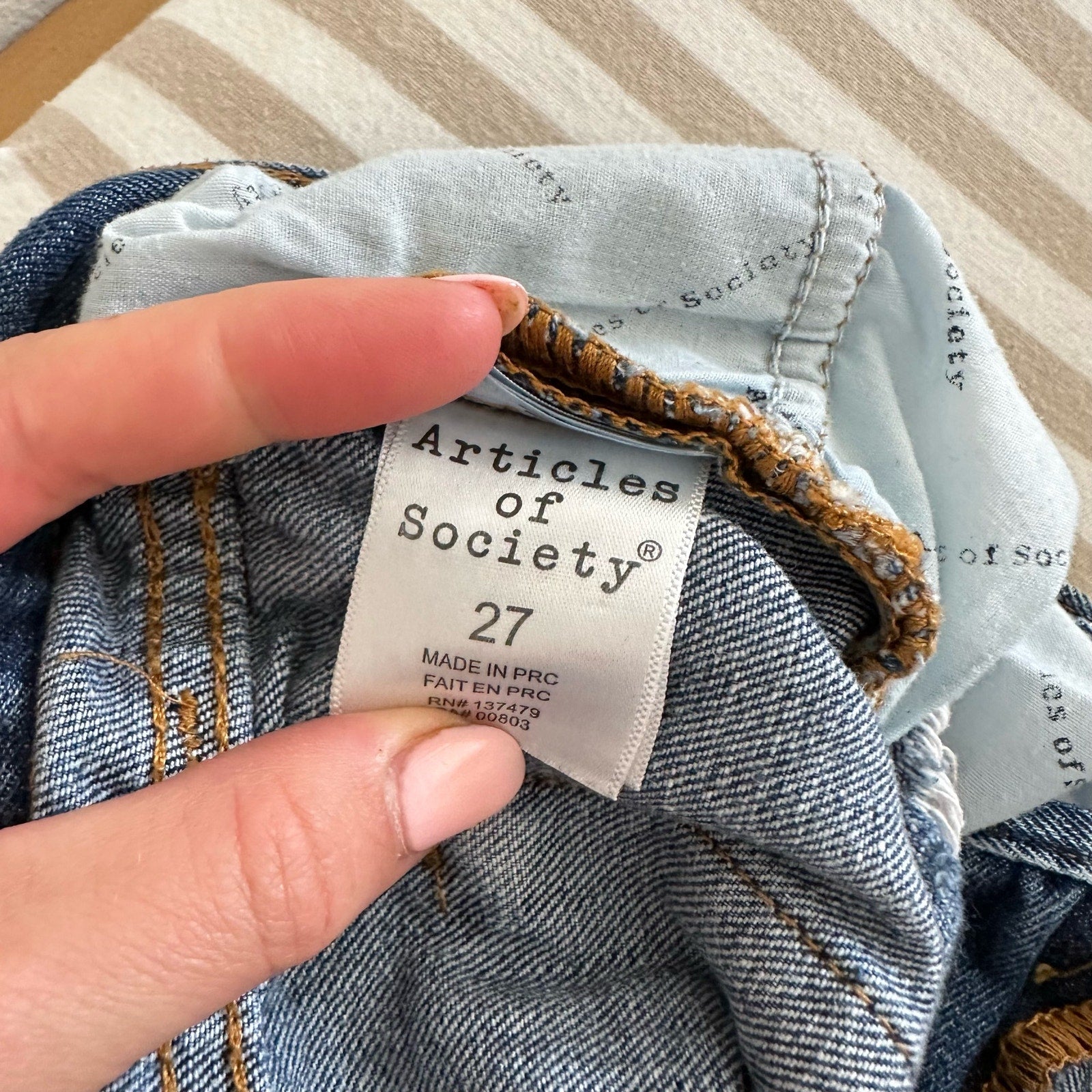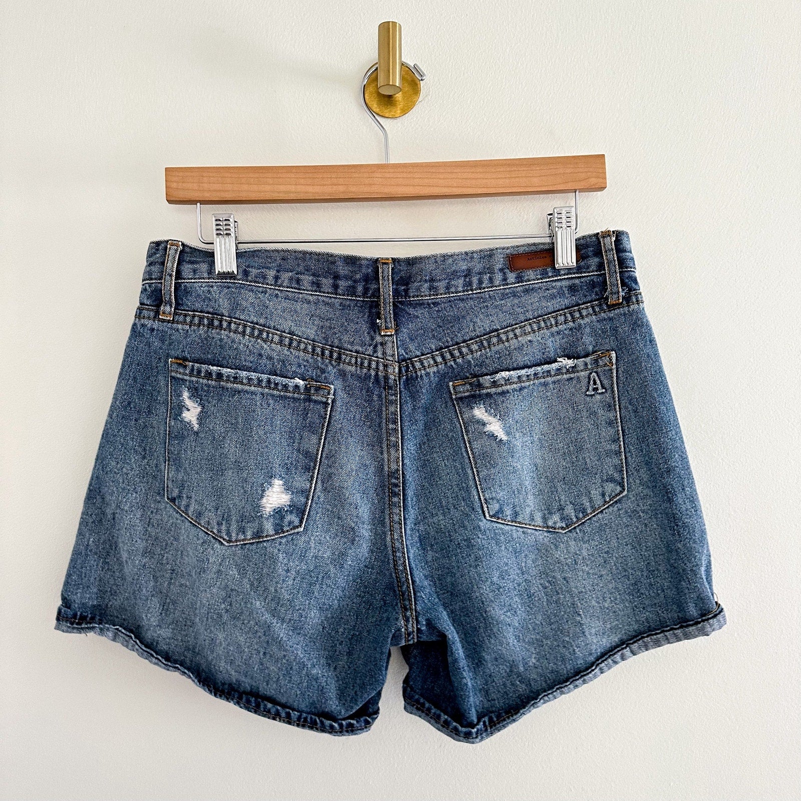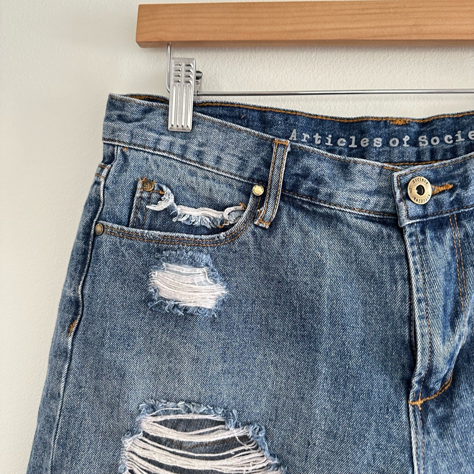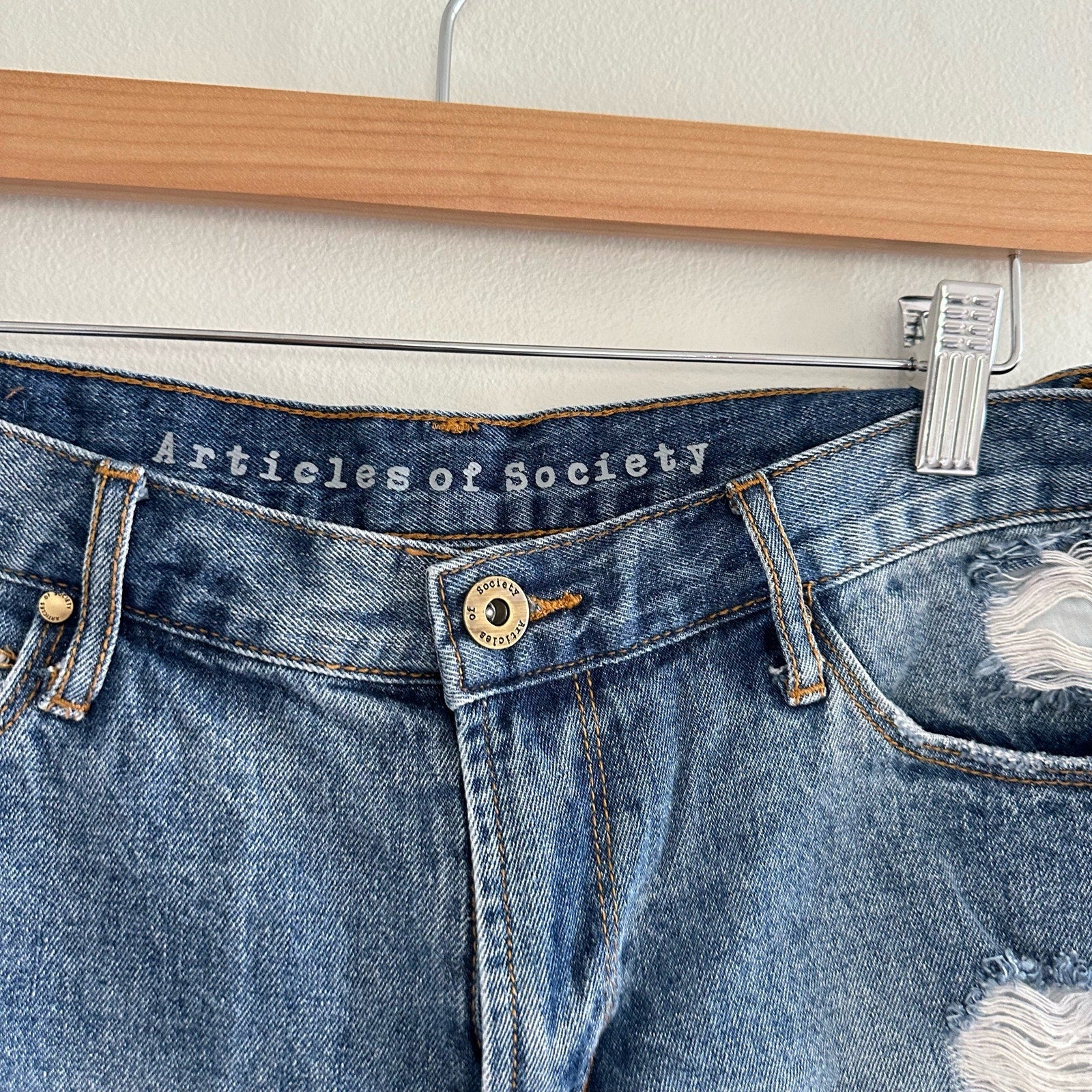 Details: Articles Of Society Distressed Denim Dark Wash Mid Rise Shorts- Size: 27- Color: Blue- Material: 100% Cotton- Features: Distressed, mid rise waist, denim, dark wash, belt loops, logo, zipper fly with button waist, 5-pocket styling, hand or machine wash, comfort, breathable, casual.