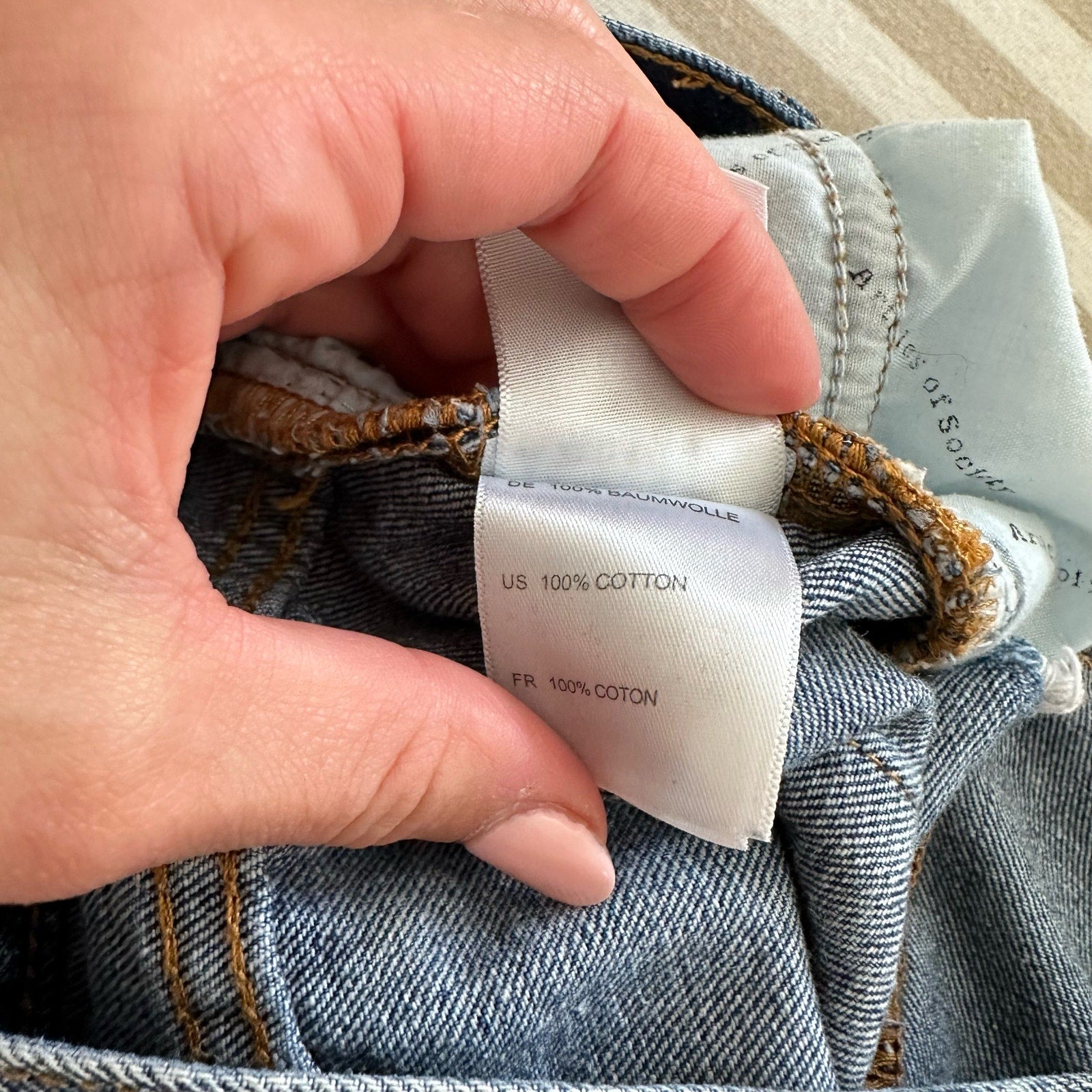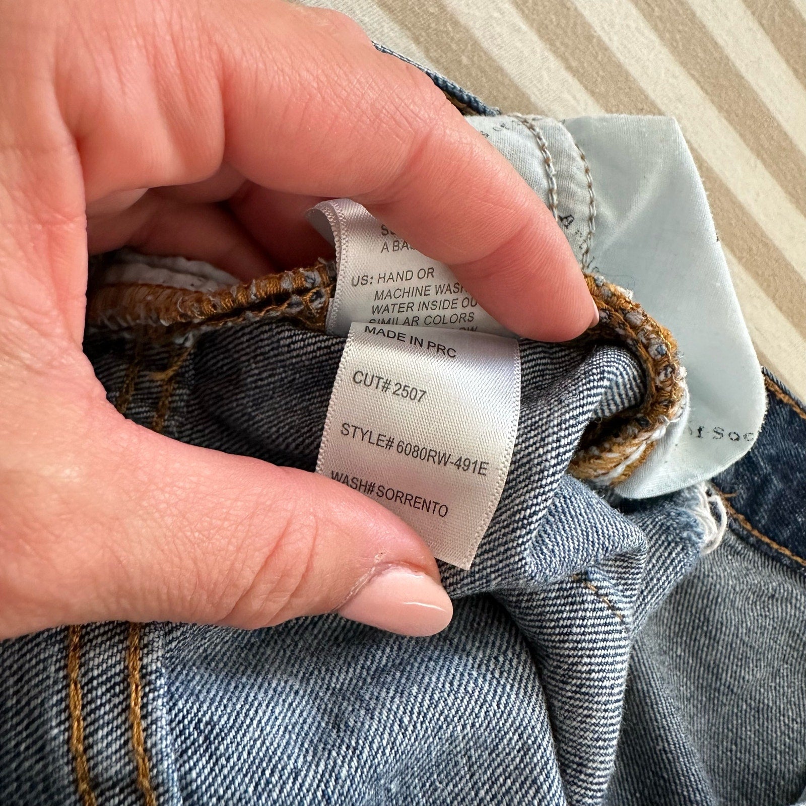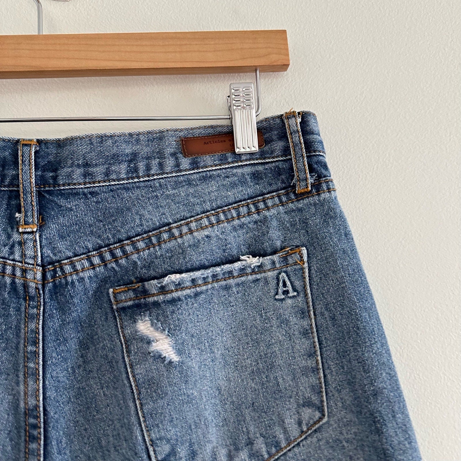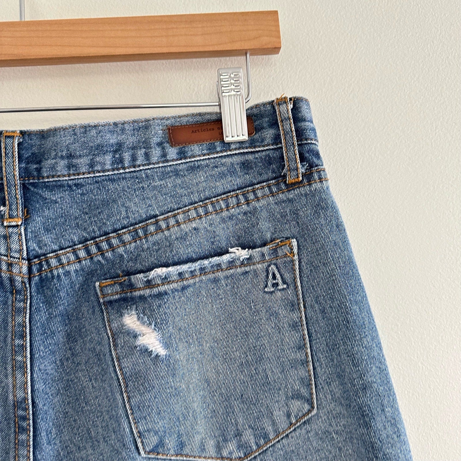 Details: Articles Of Society Distressed Denim Dark Wash Mid Rise Shorts- Size: 27- Color: Blue- Material: 100% Cotton- Features: Distressed, mid rise waist, denim, dark wash, belt loops, logo, zipper fly with button waist, 5-pocket styling, hand or machine wash, comfort, breathable, casual.