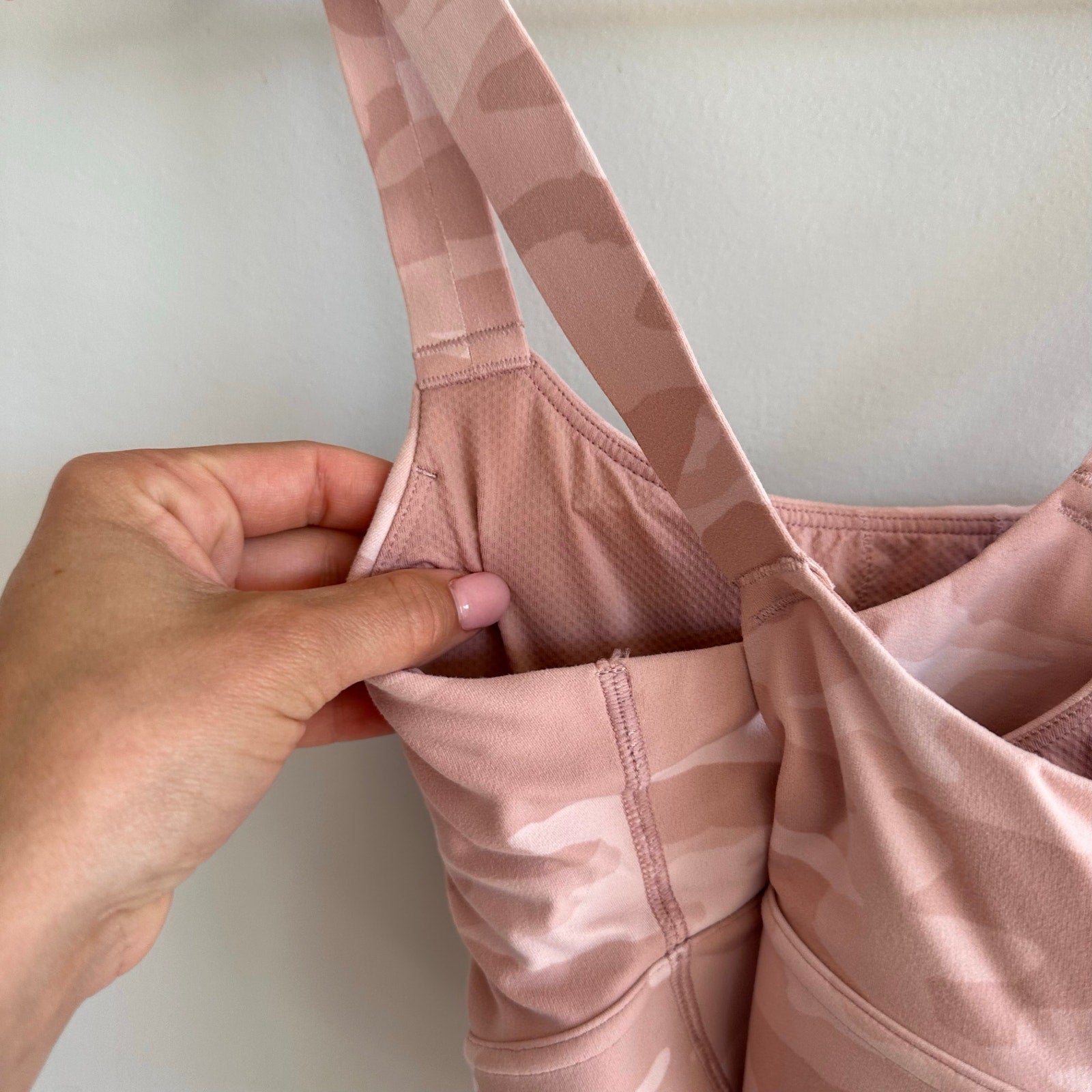- Features: Camo print, cross back straps, athletic, performance