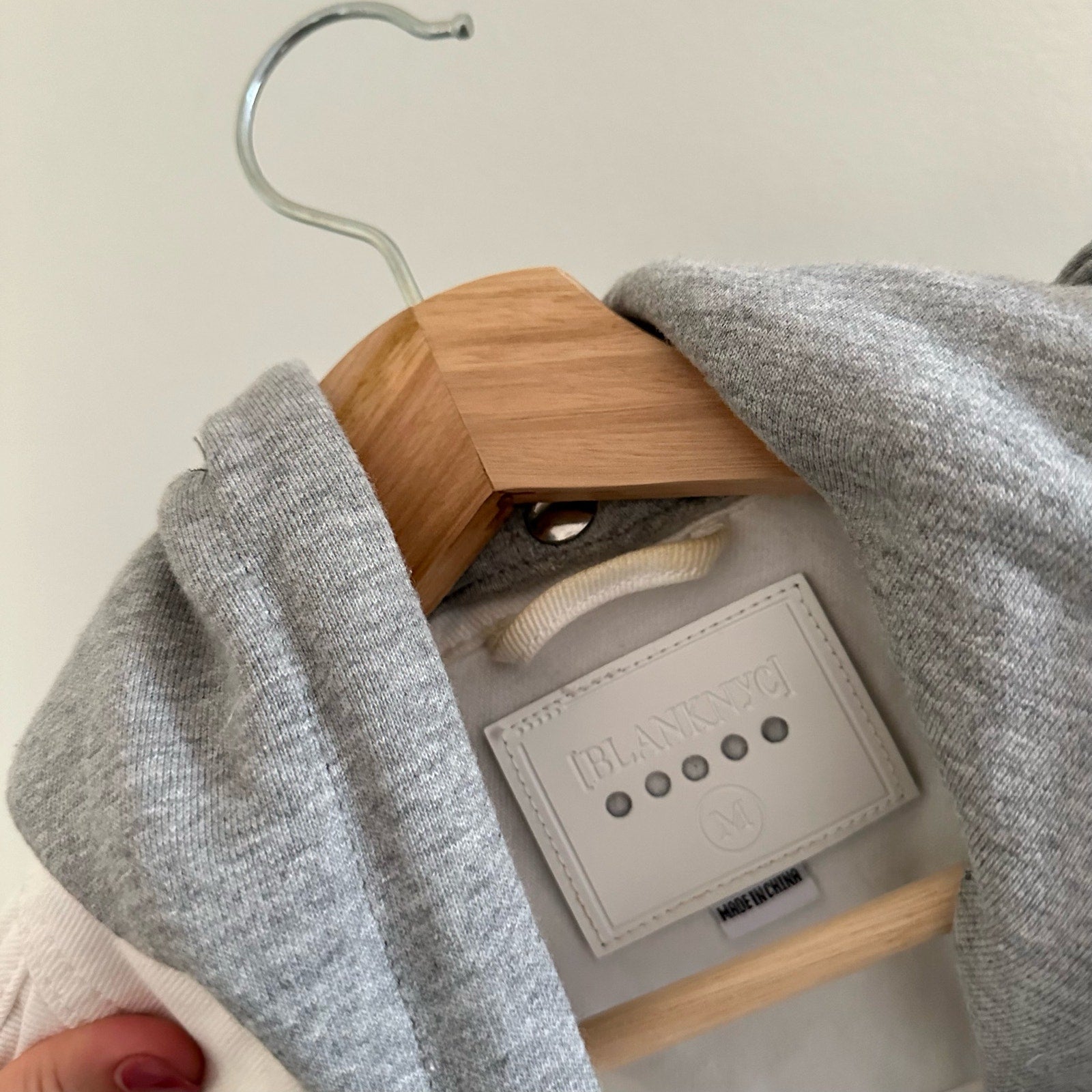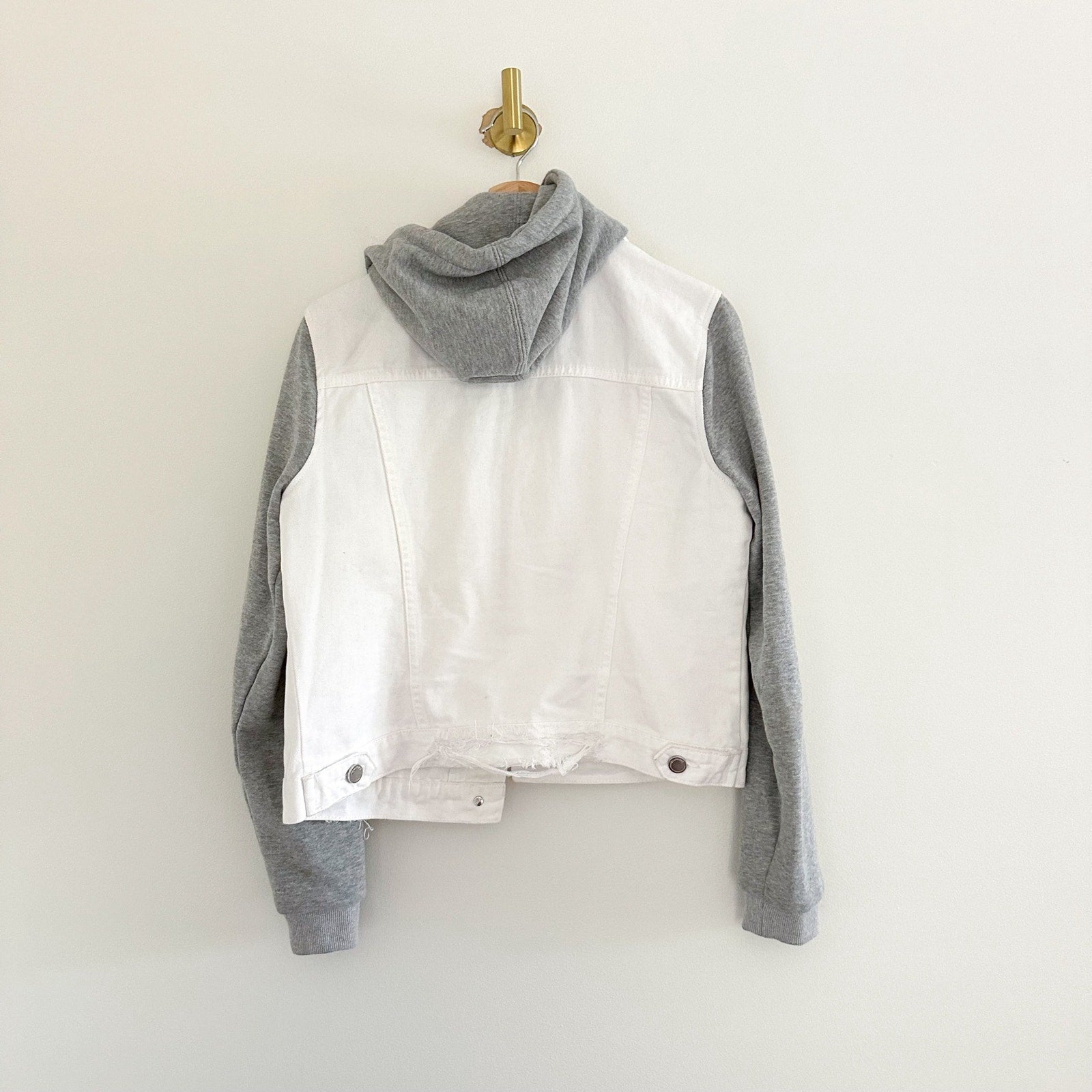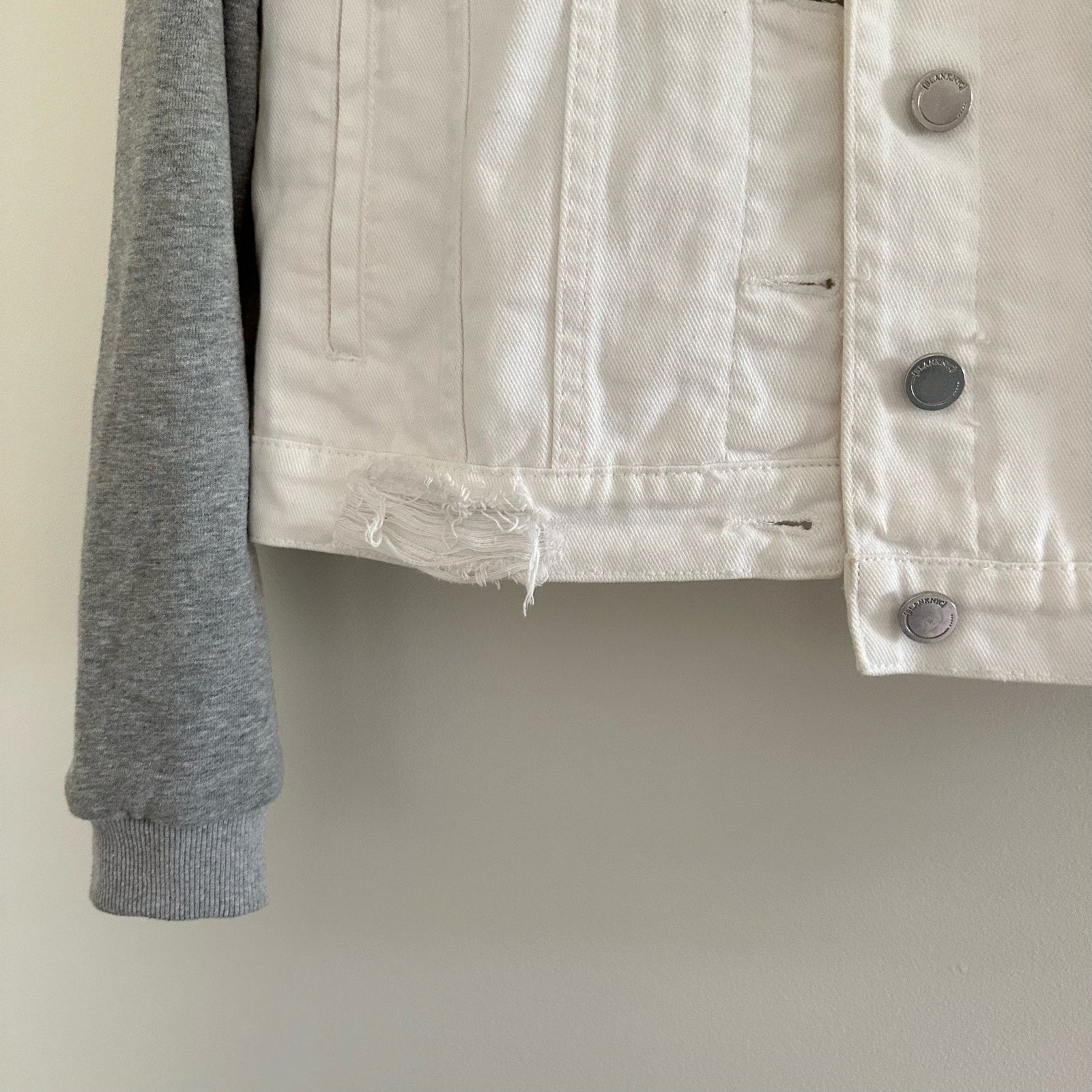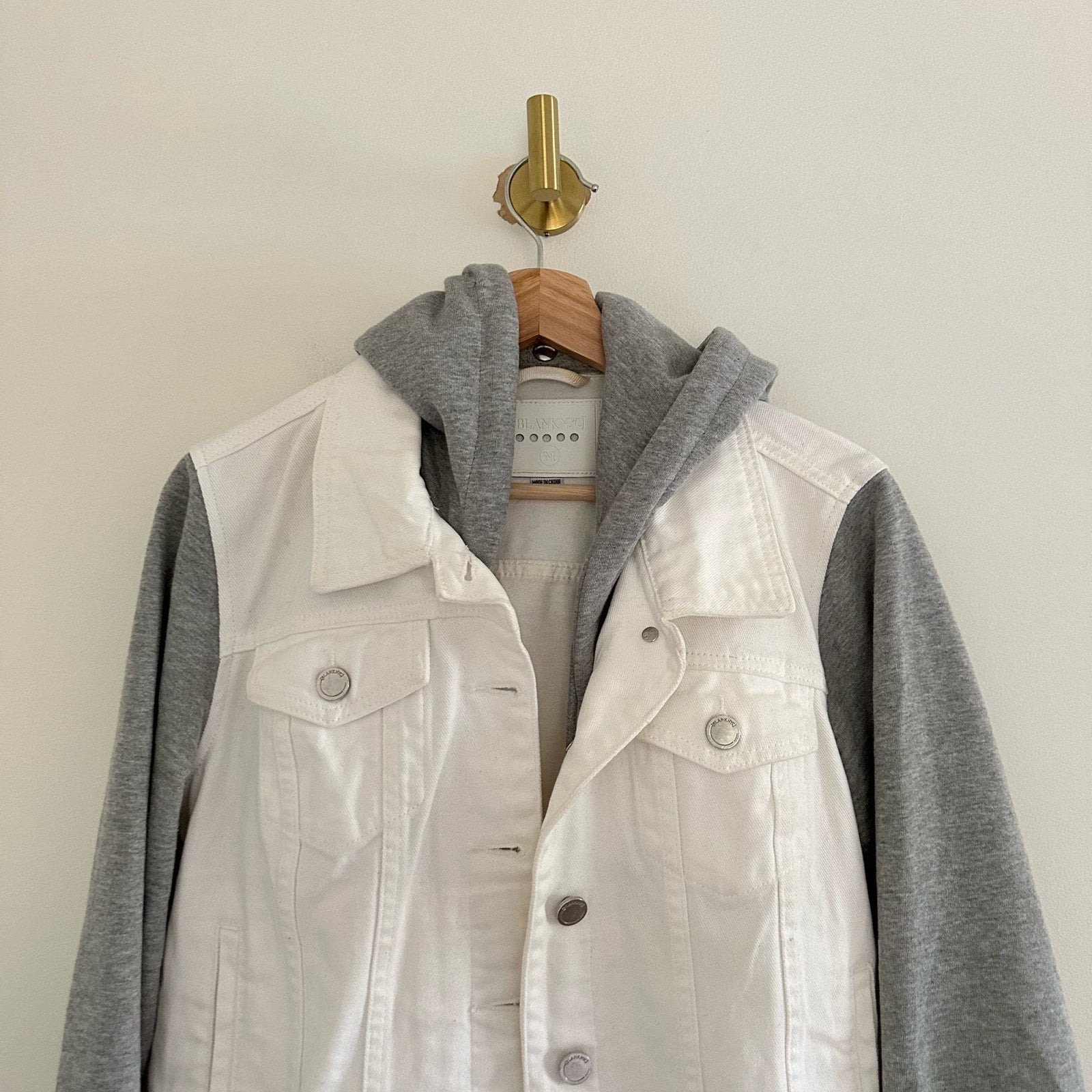 Details: Blank NYC Lightbox Hooded Denim Jacket - Size: M- Color: White/Gray- Material: 100% Cotton- Features: Button closure, hooded, pockets, distressed, denim, machine wash, collared, light wash, comfort, breathable, casual.