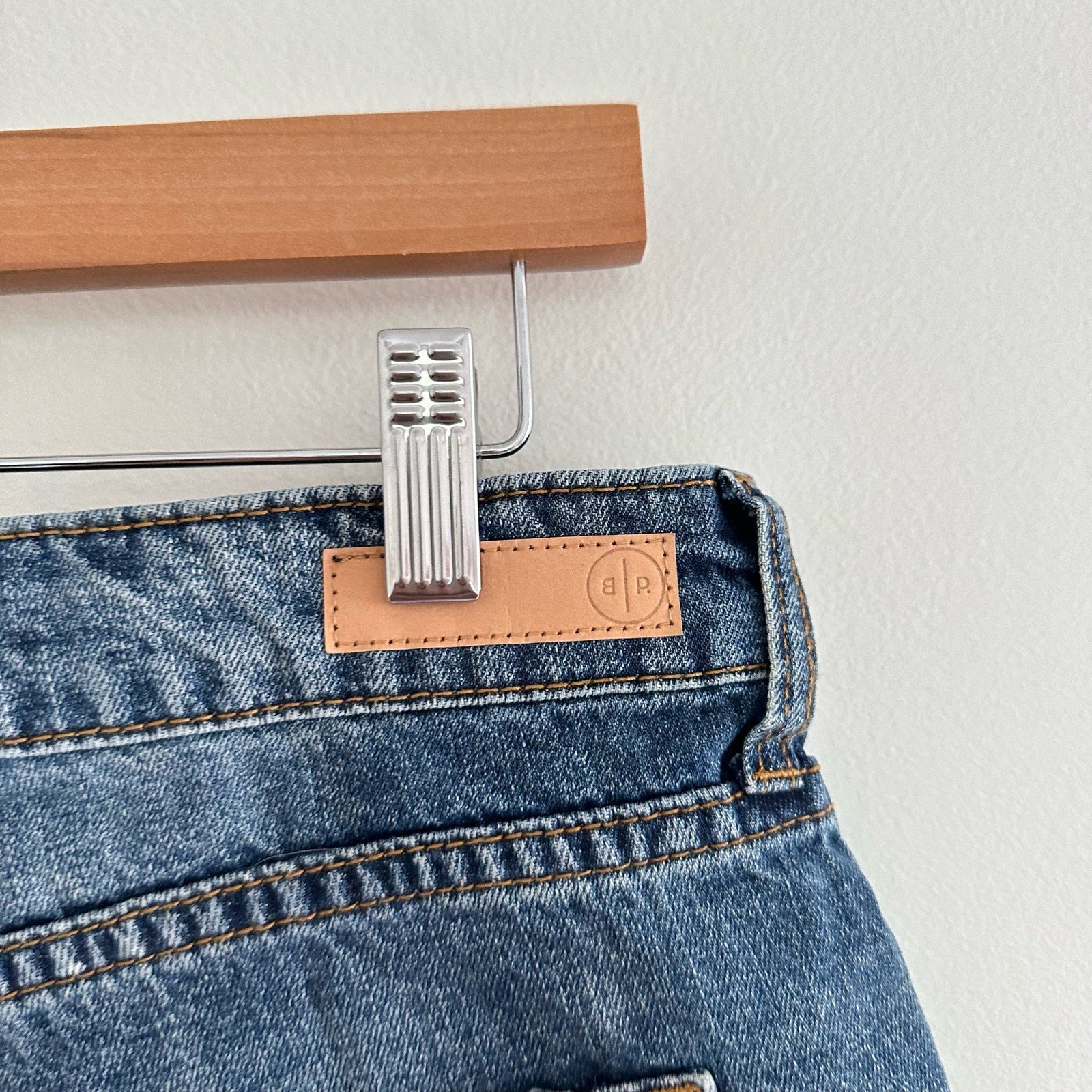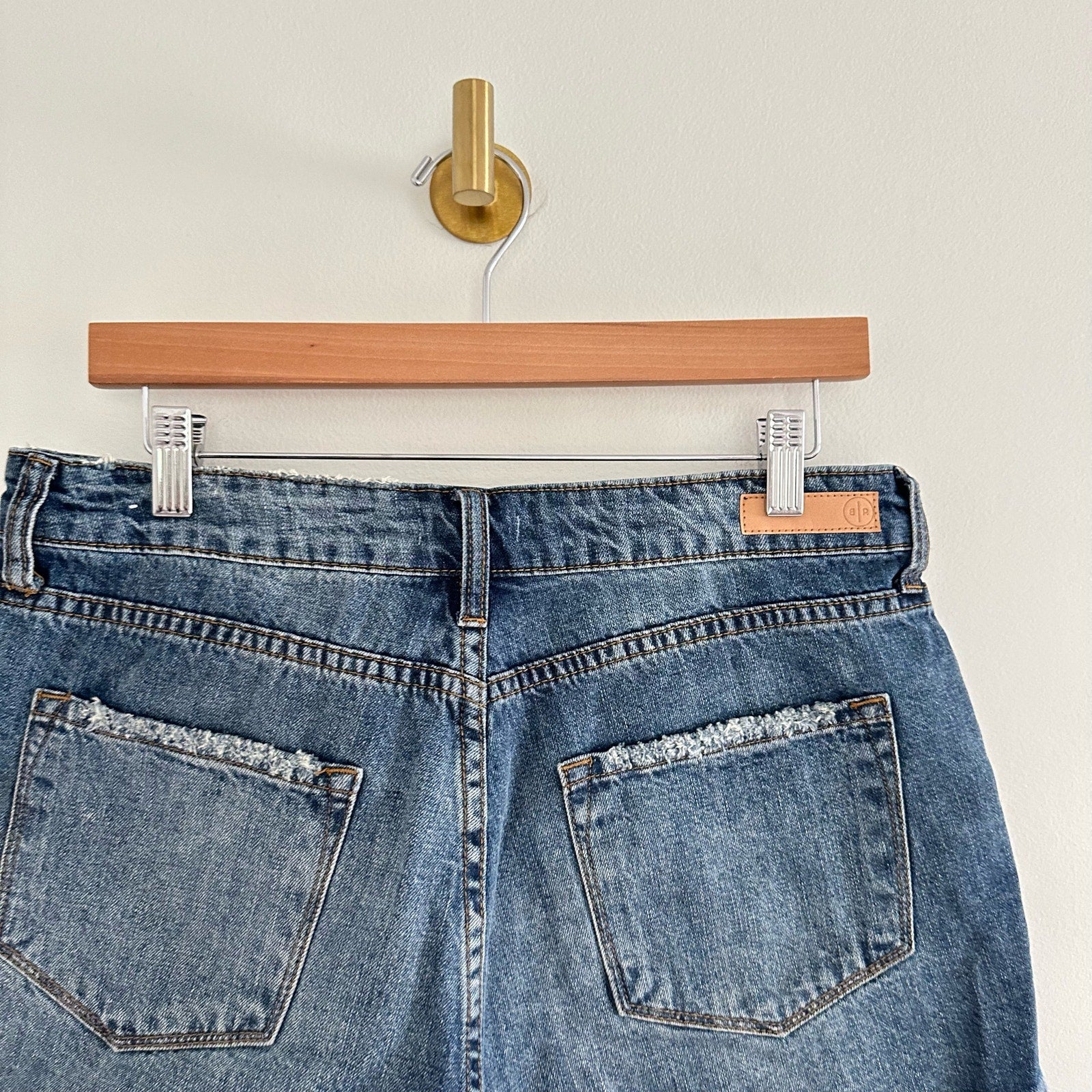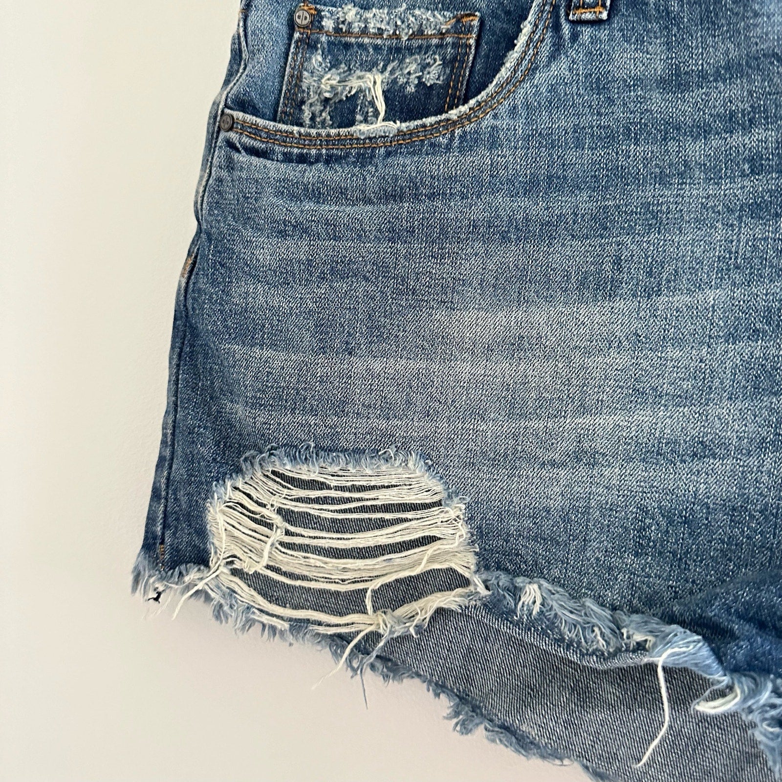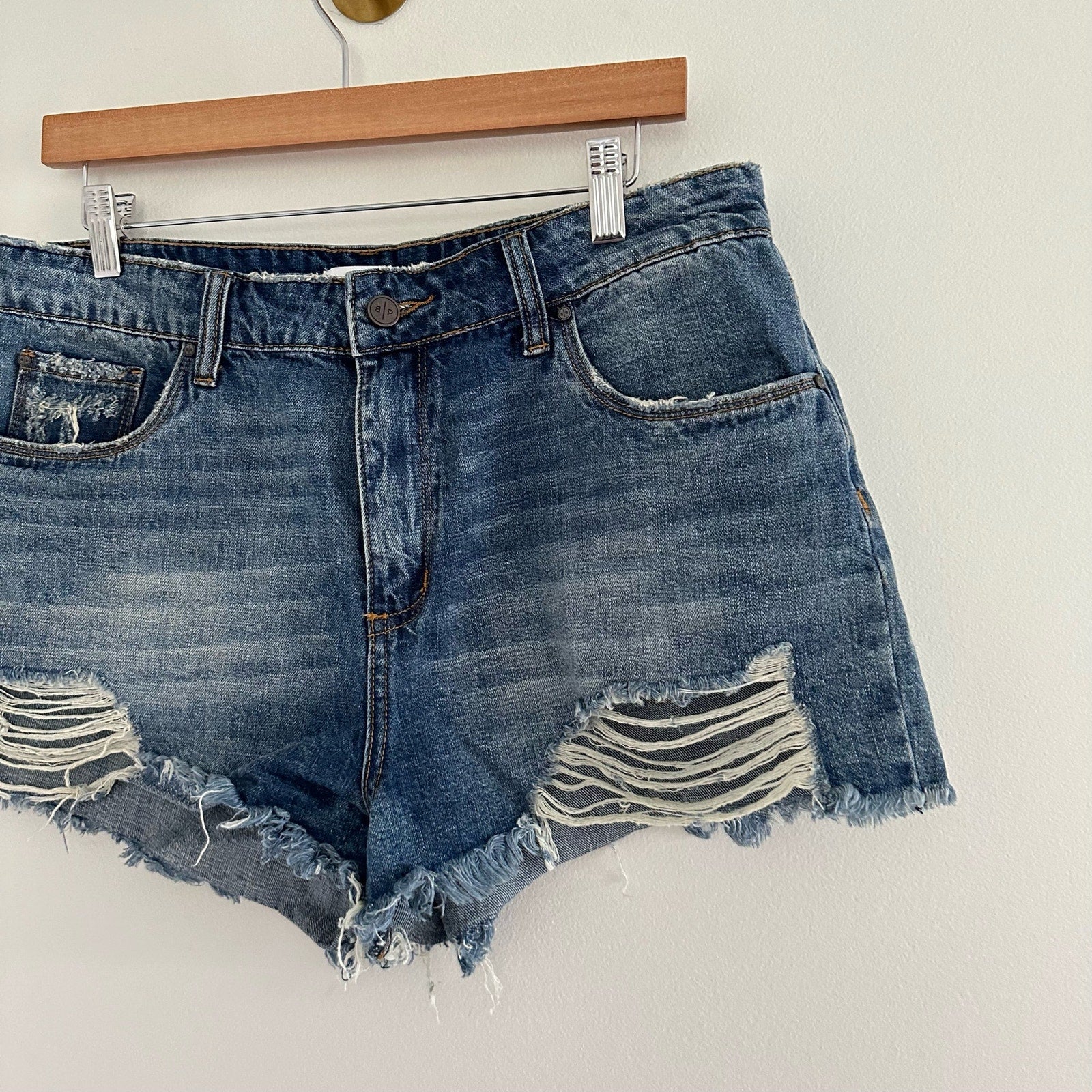 Details: BP. Distressed Denim Mid Rise Dark Wash Cut-Off Shorts - Size: 31- Color: Blue- Material: 100% Cotton- Features: Denim, mid rise waist, dark wash, cut-off style, belt loops, zipper fly with button waist, 5-pocket styling, logo, comfort, breathable, casual.