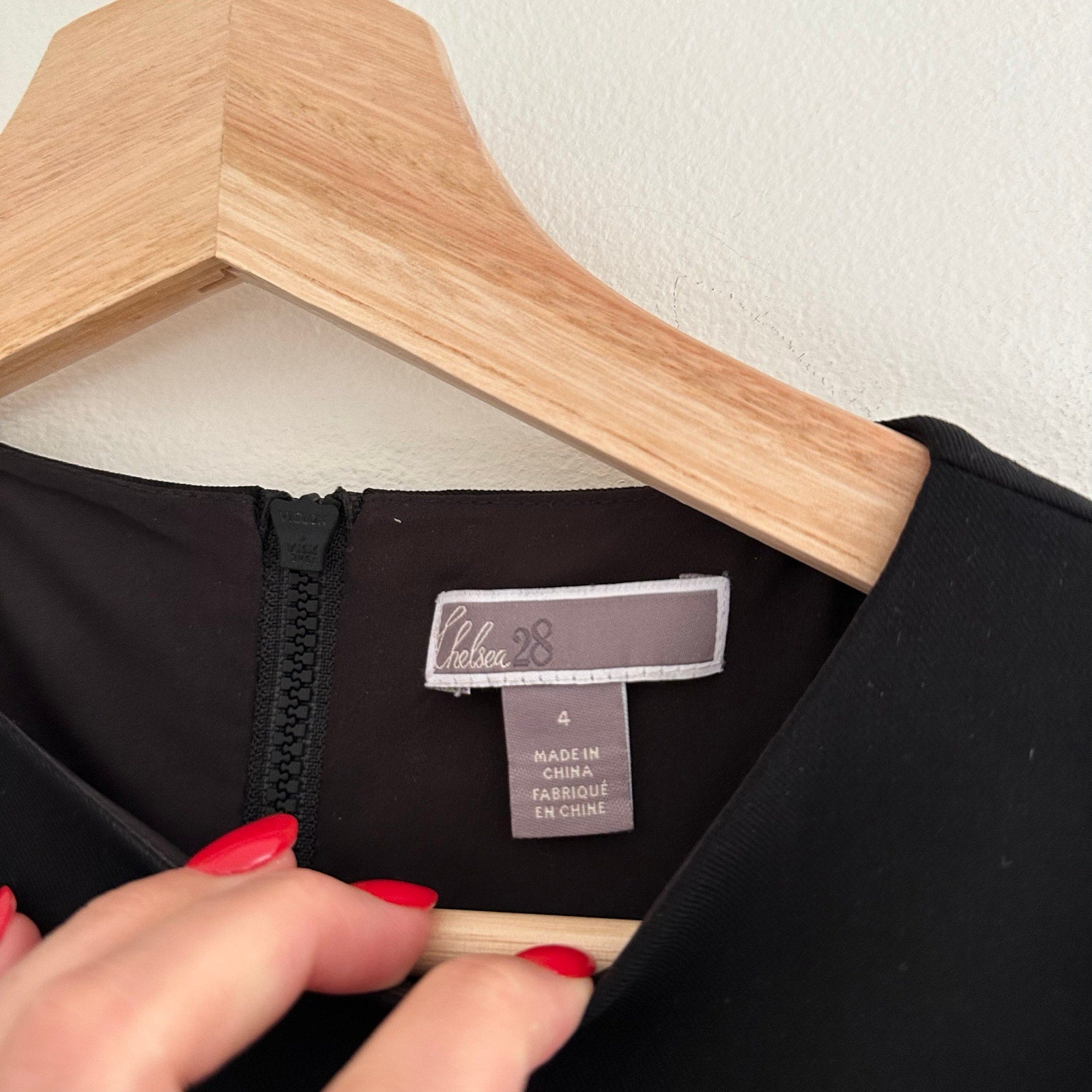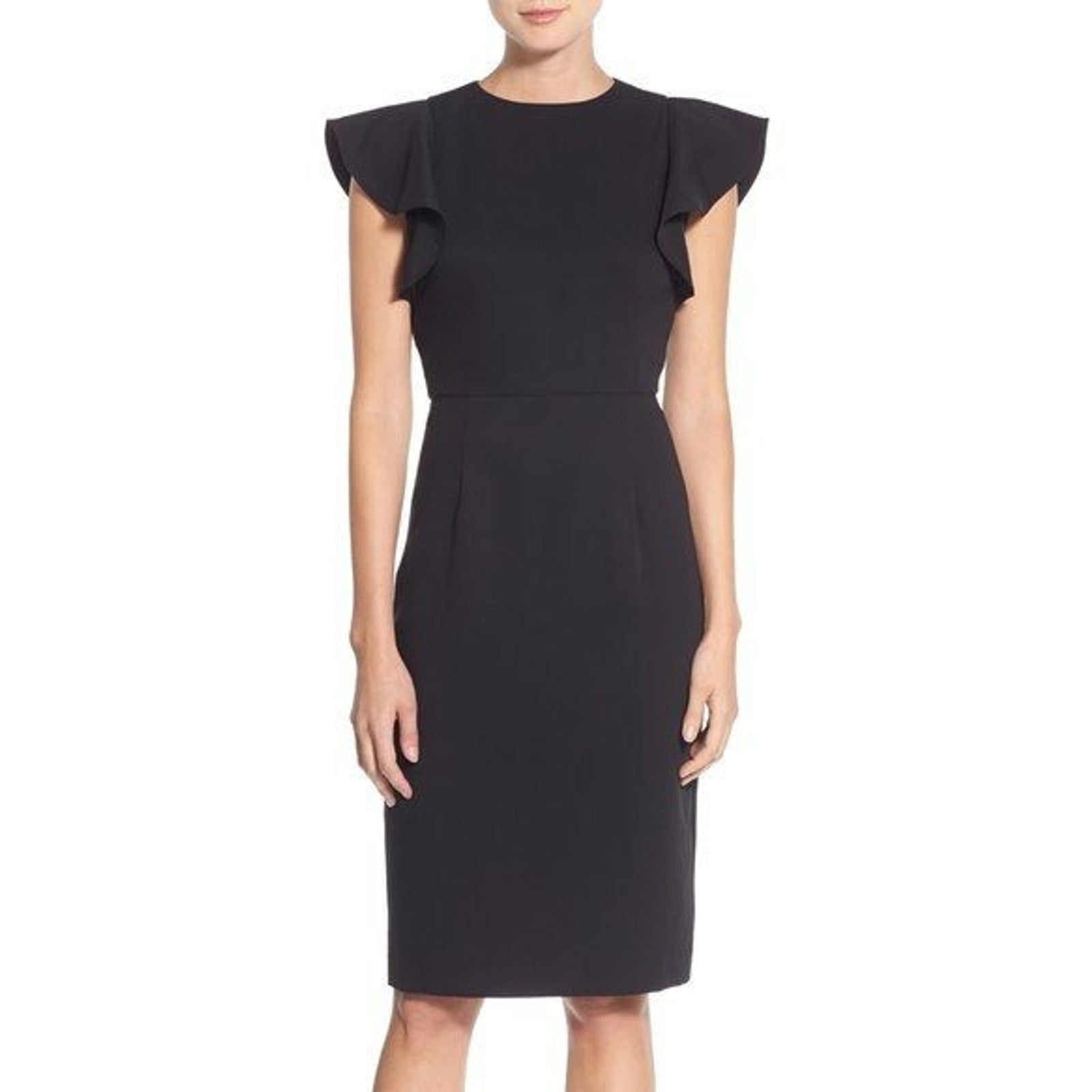 Details: Chelsea28 Crew Neck Flutter Sleeve Mini Sheath Dress - Size: 4- Color: Black- Material: 100% Polyester- Features: Crew neck, flutter sleeve, mini length, sheath styling, lined, machine wash, zipper closure, comfort, casual.