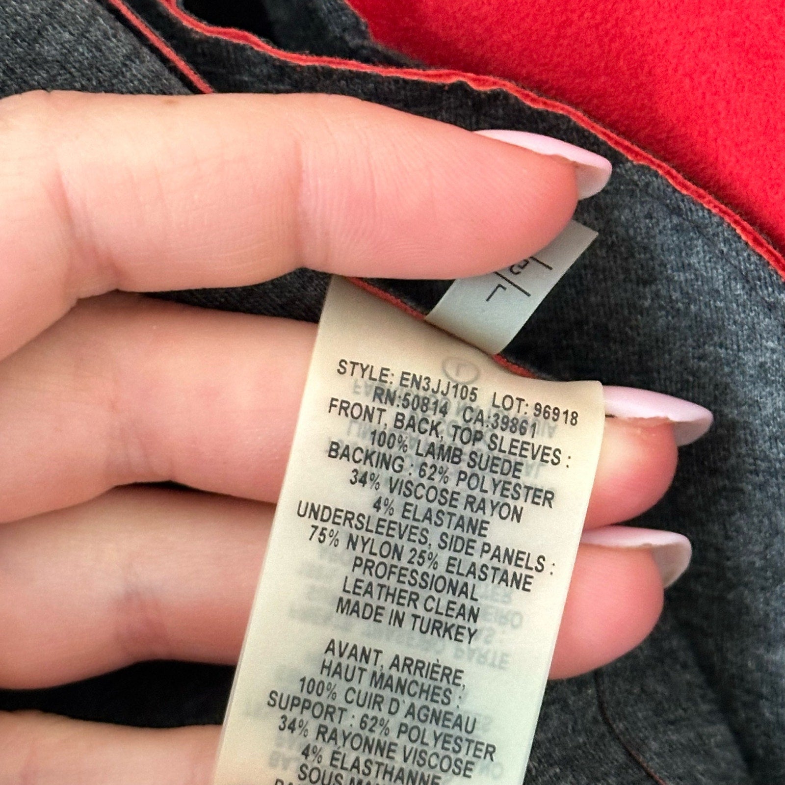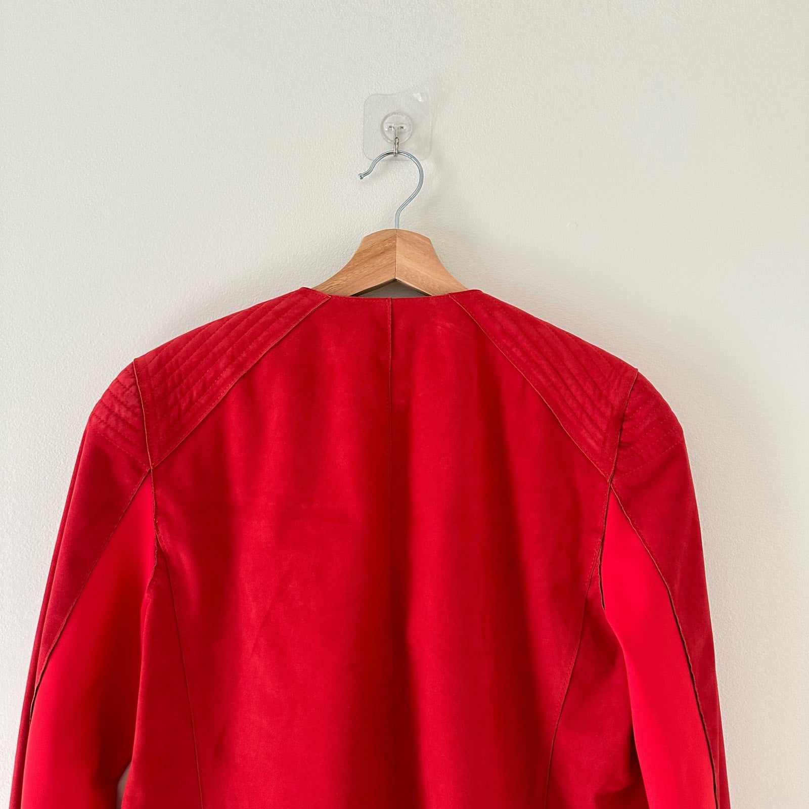 Details: Elie Tahari Lamb Suede Asymmetrical Zip Moto Jacket - Size: L- Color: Red- Material: 100% Lamb Suede- Features: Zipper closure, round neck, lined, professional leather clean, zip pockets, comfort, breathable, casual. Style: EN3JJ105