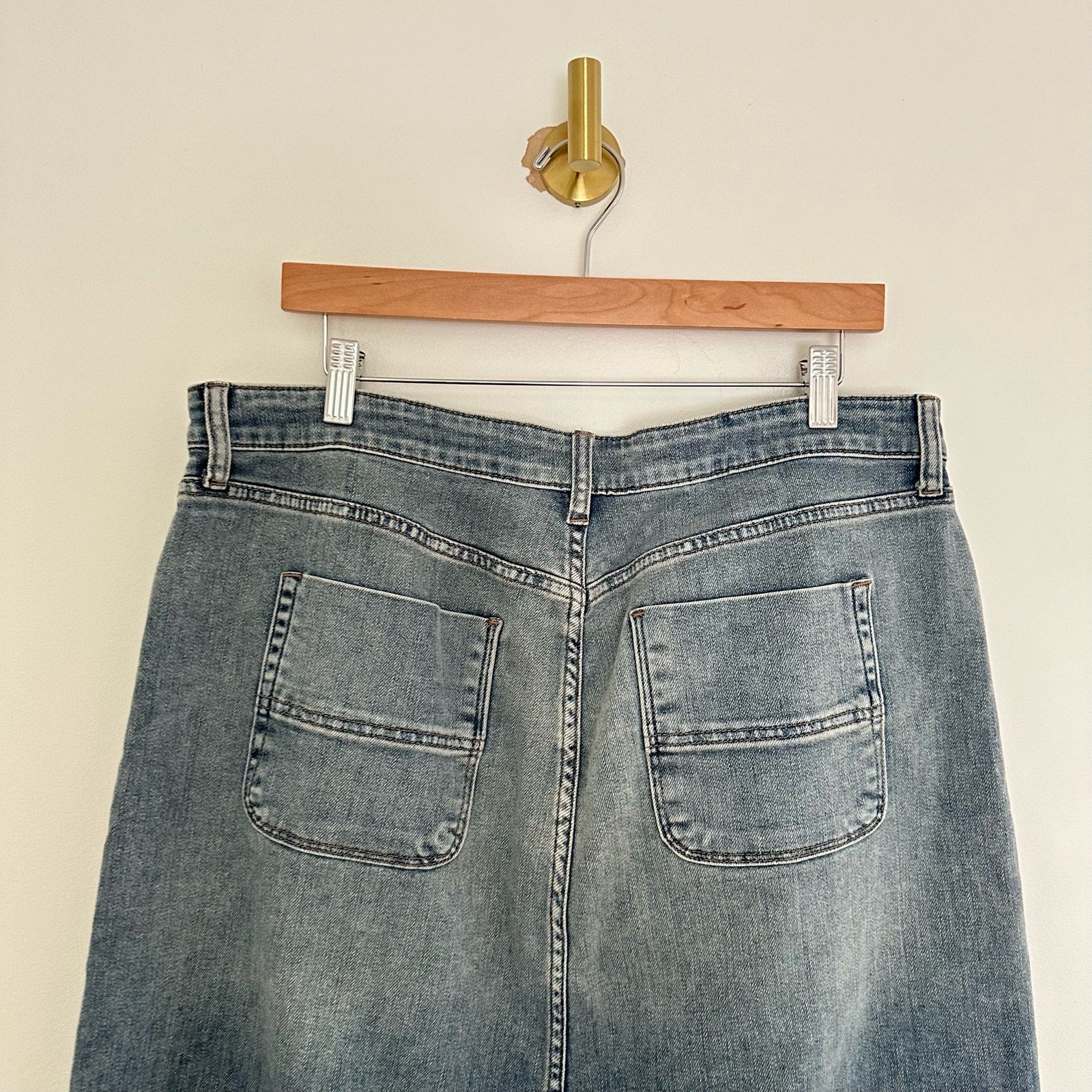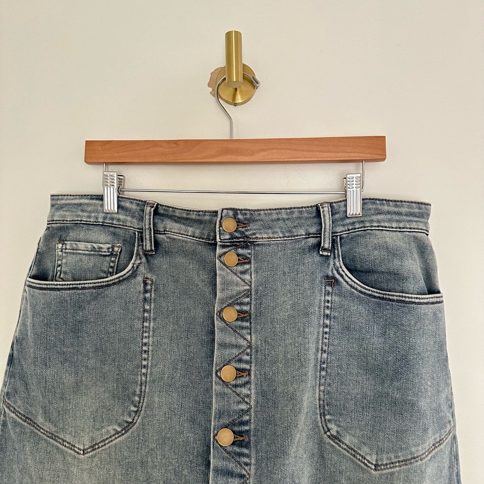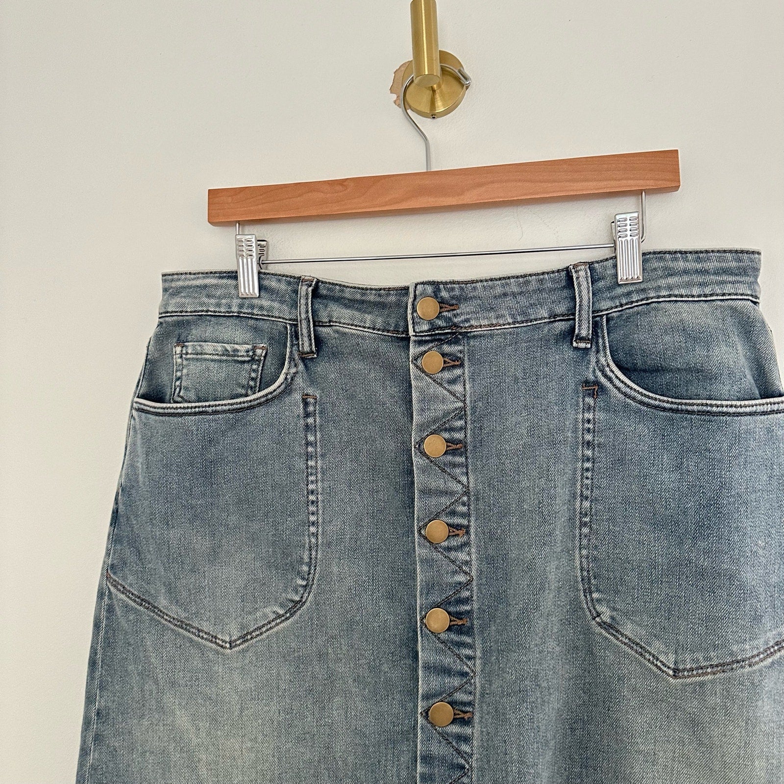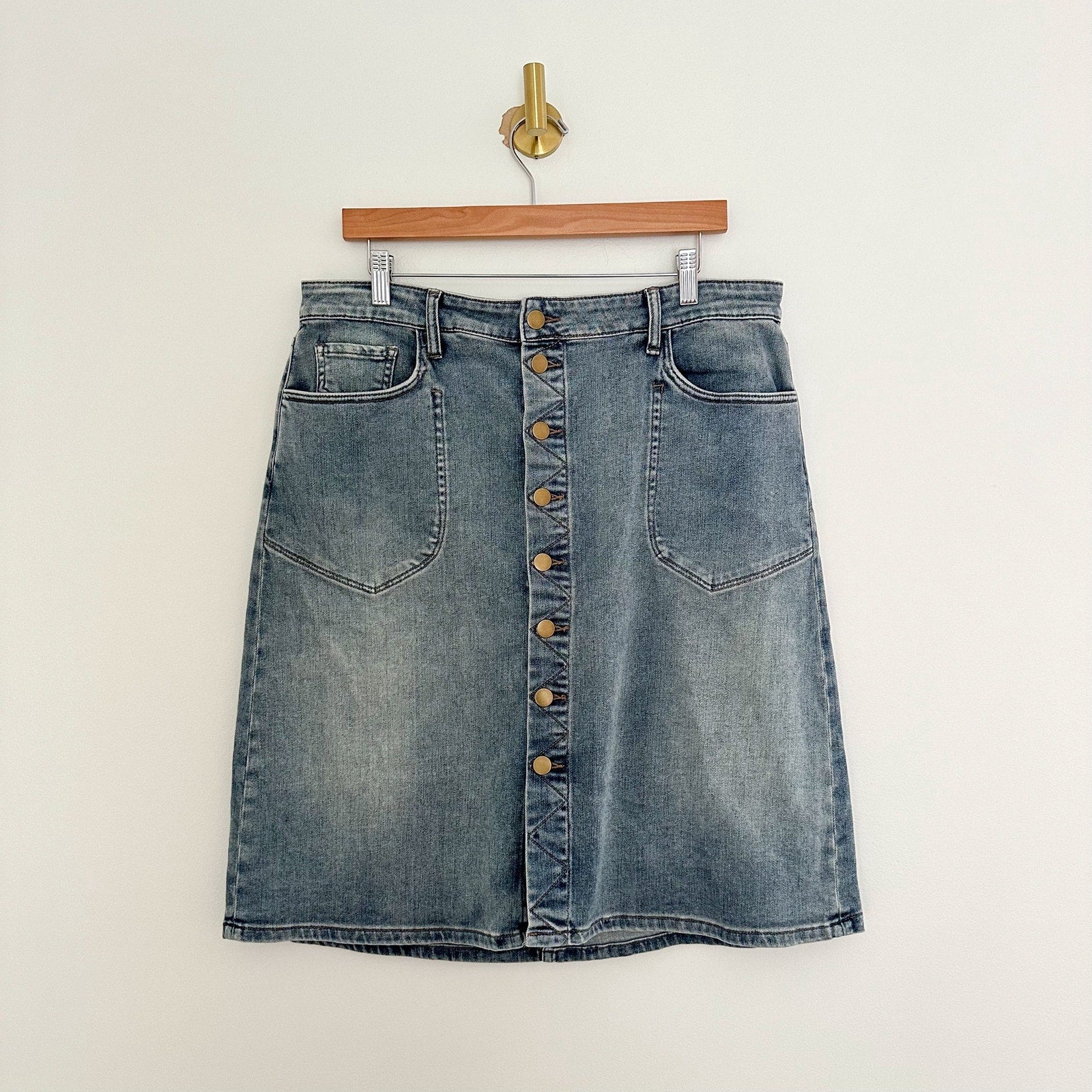 Details: KUT From The Kloth x Evereve Rose Button Front Denim Straight Skirt - Size: 14- Color: Blue- Material: 89% Cotton, 10% Polyester, 1% Spandex- Features: Button closure, belt loops, machine wash, denim, medium wash, 5-pocket styling, straight, comfort, breathable, casual.
