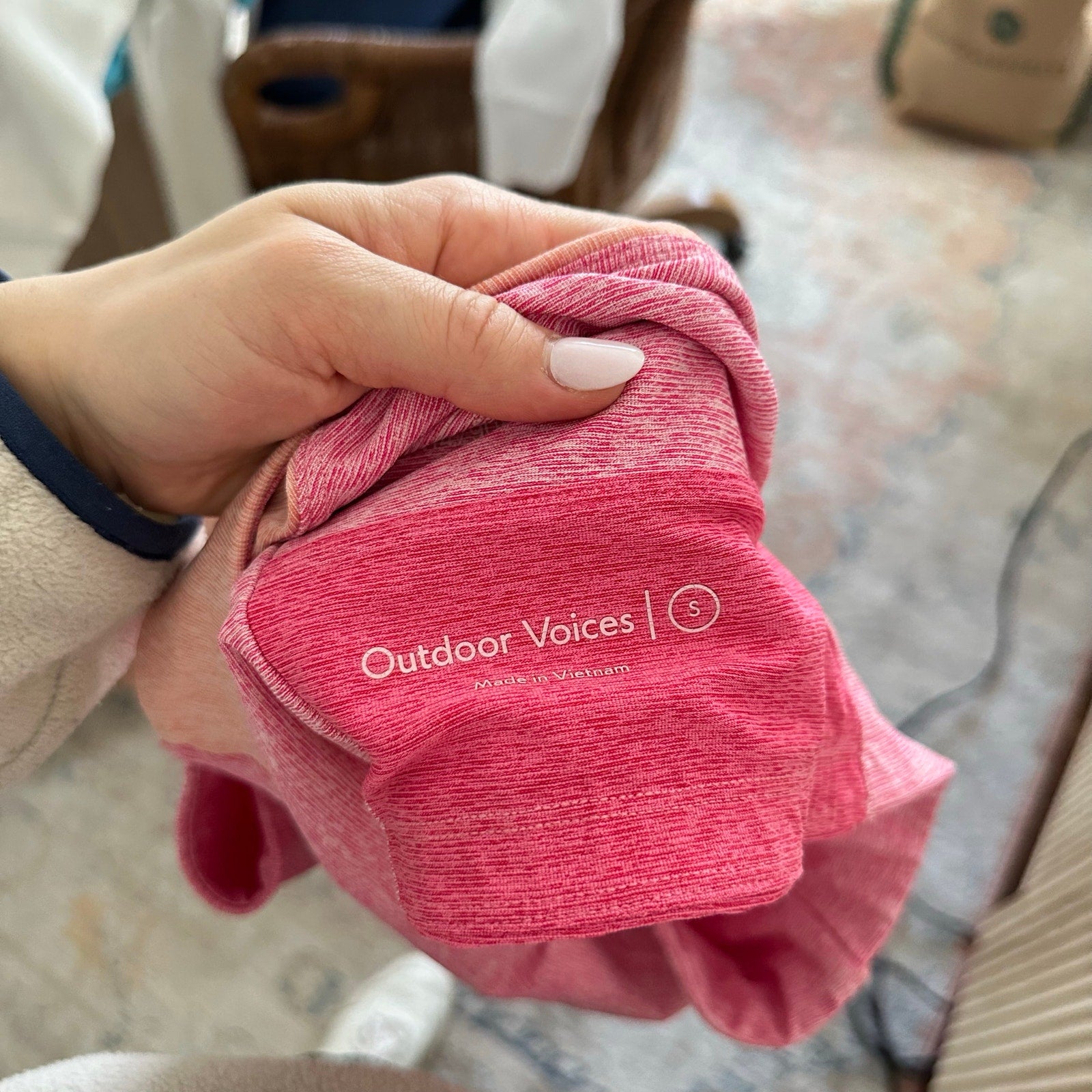 Details: Outdoor Voices Venus Crew Neck Colorblock Crop Top Bra - Size: S- Color: Pink- Material: Polyester/spandex - Features: Cropped, sleeveless, pullover, crew neck, stretch, colorblock patter, comfort, breathable, casual, activewear.
